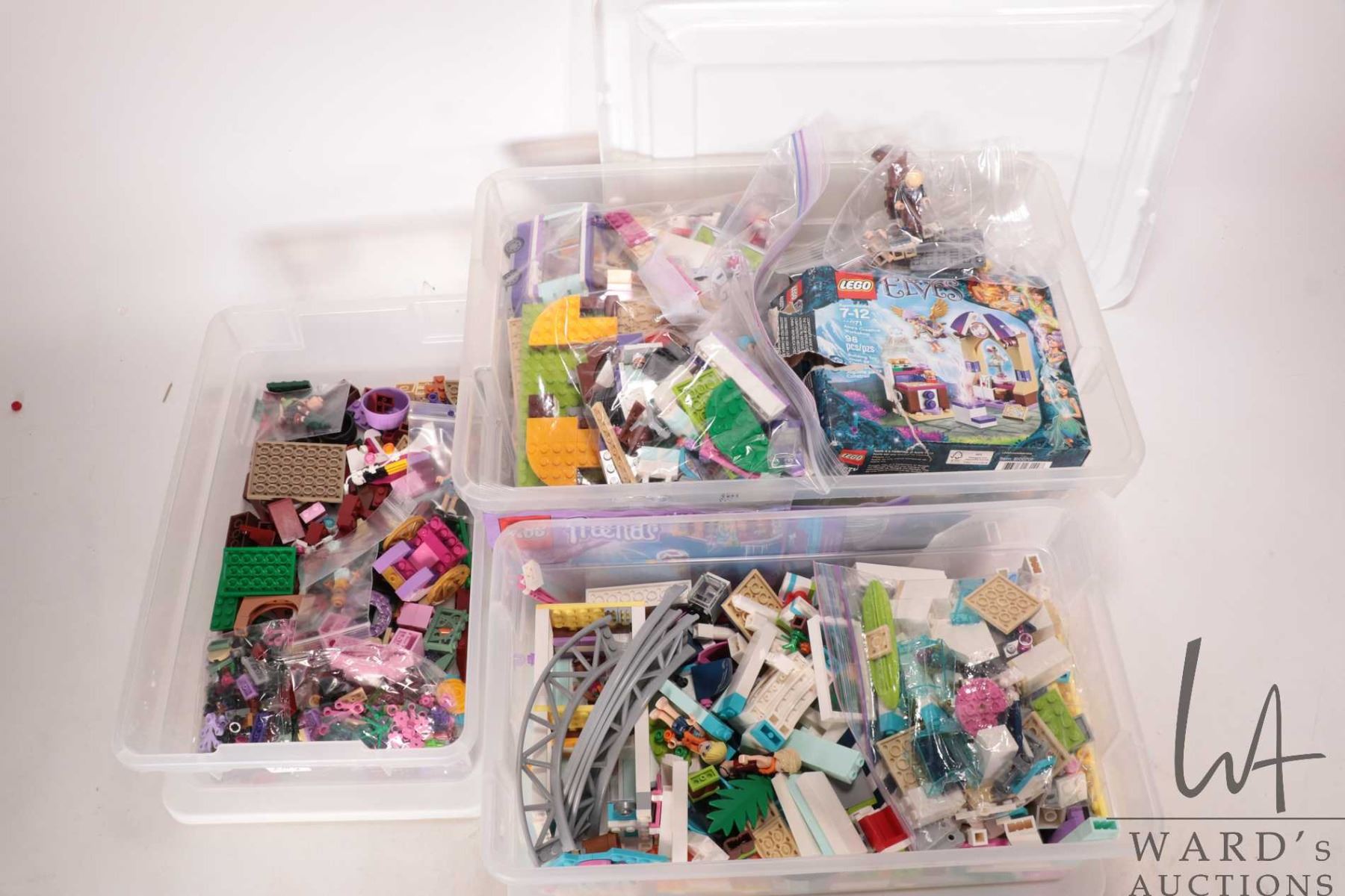Three plastic totes containing a selection of Lego building bricks including Friends and Elves.