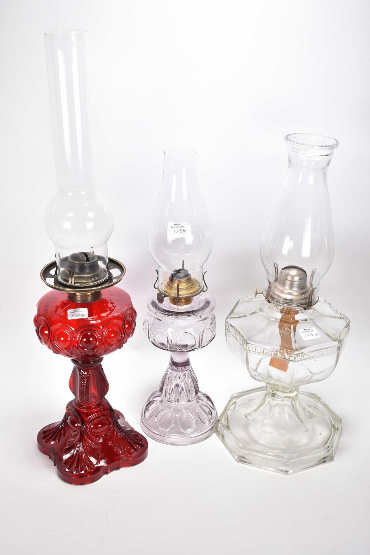 Three pressed glass oil lamps including two colourless including one turning purple and a ruby glass lamp. Not Available For Shipping. Local Bidders Only