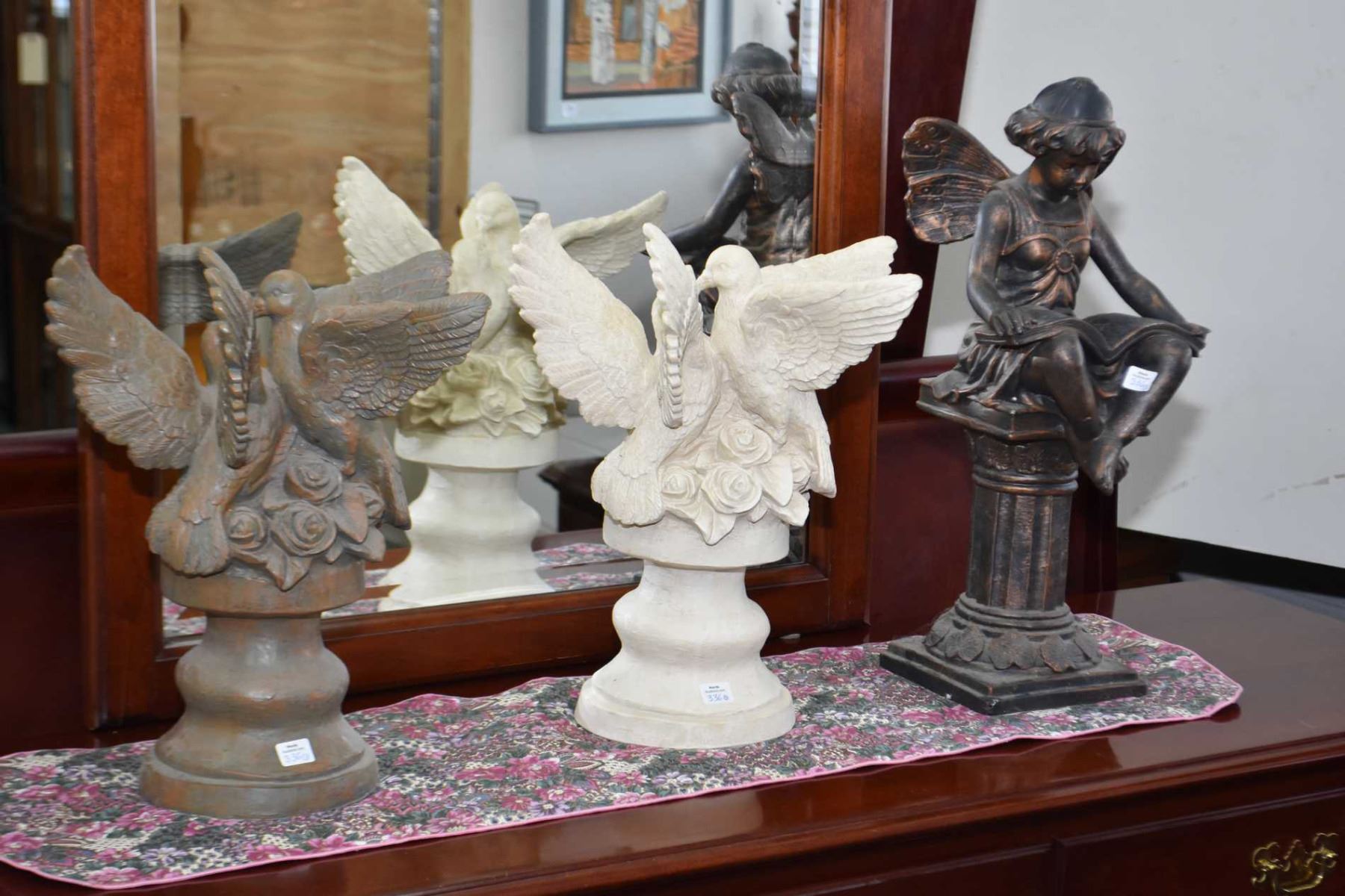 Three resin garden figures including two dove motif and a fairy 21  in height