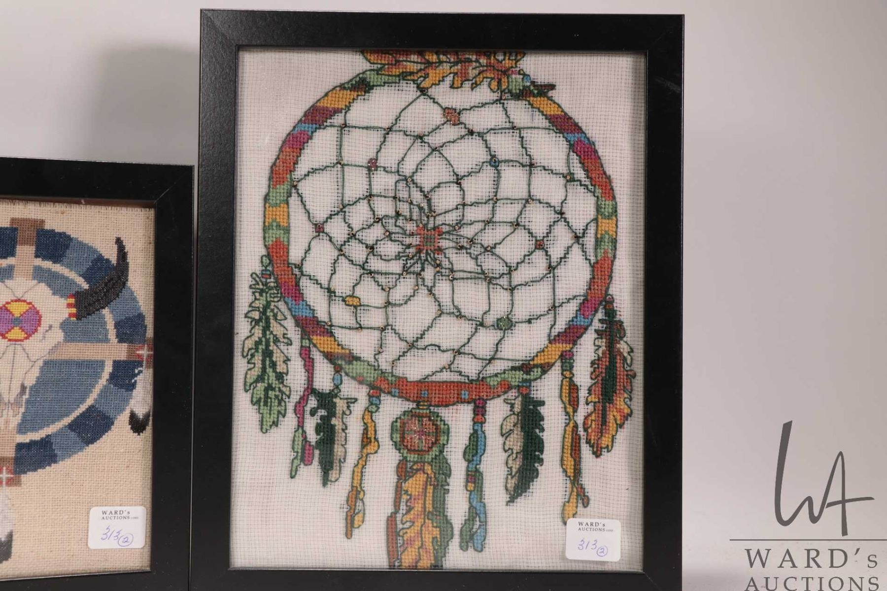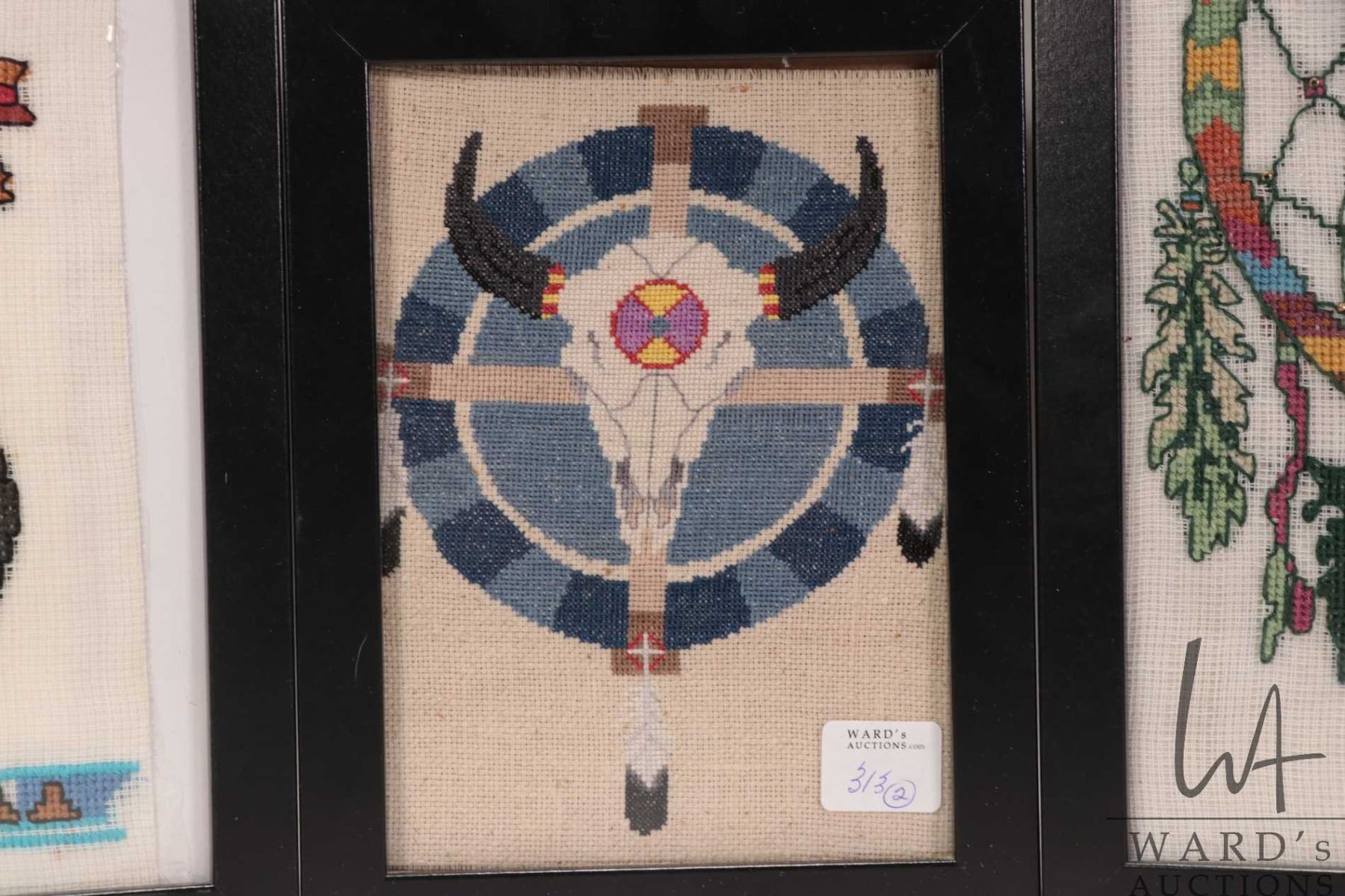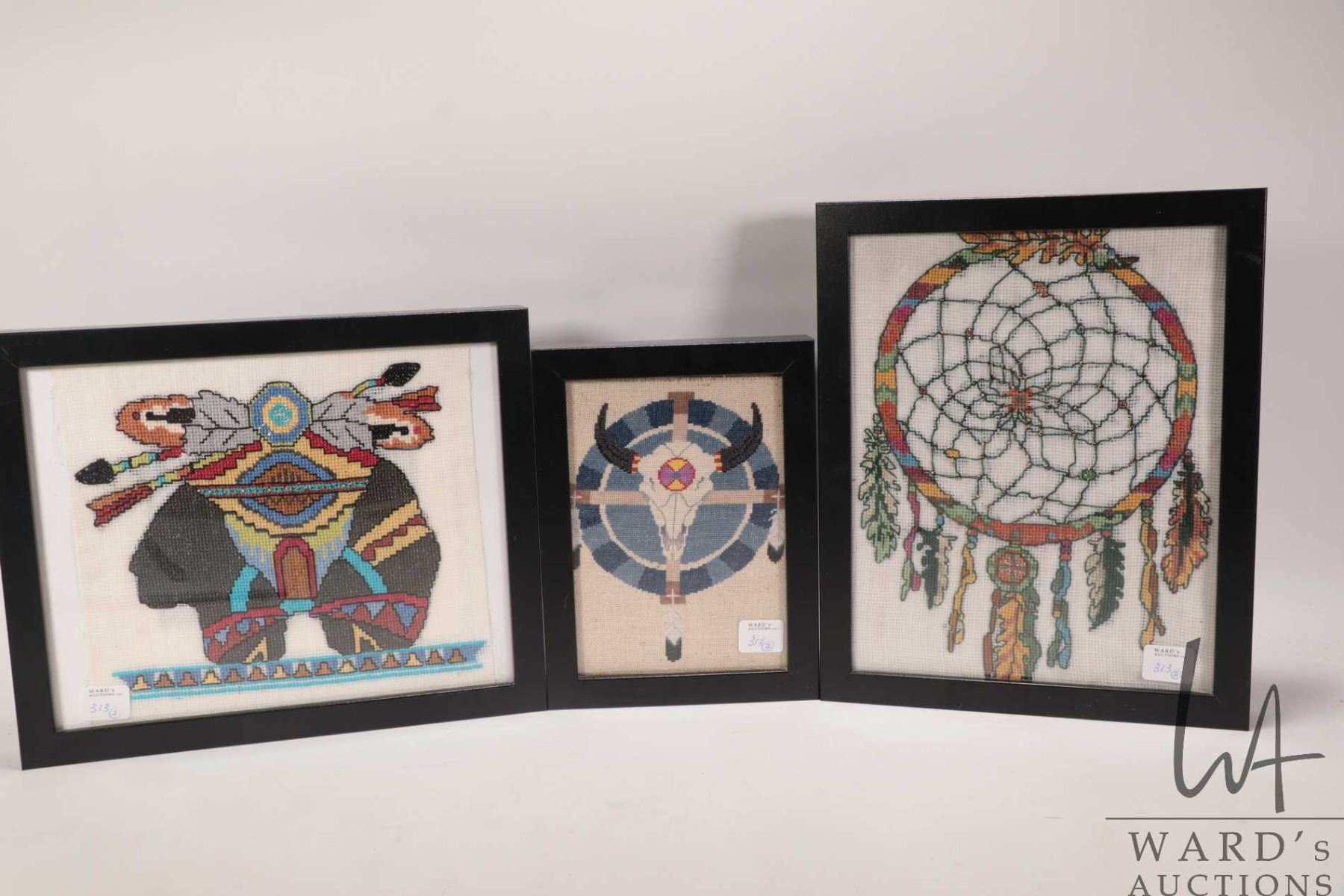 Three small Indigenous theme needleworks including dream catcher 11" X 9", bear 9" X 11" and a buffalo skull, 8" X 6", all overall dimensions including frames