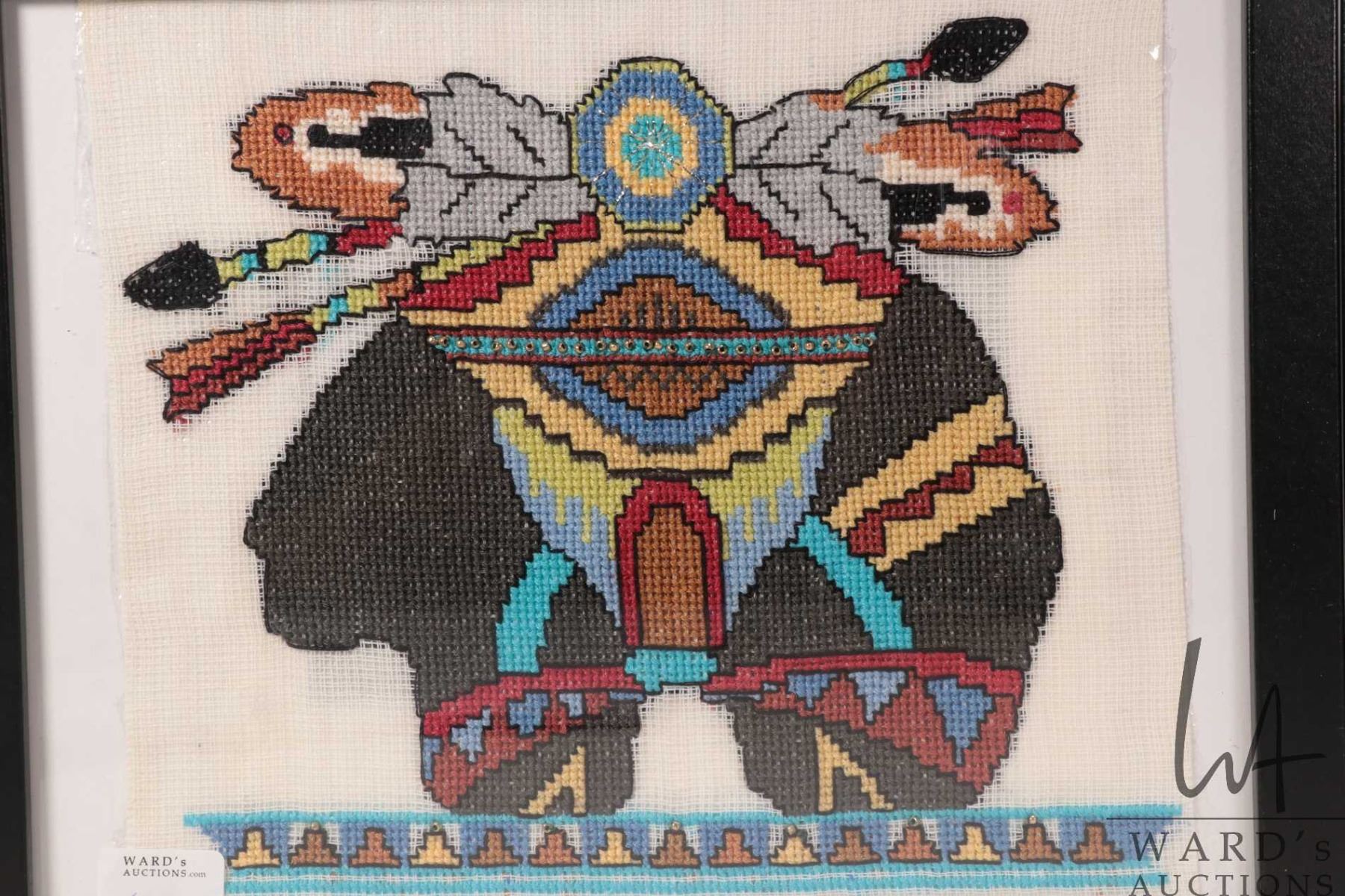 Three small Indigenous theme needleworks including dream catcher 11" X 9", bear 9" X 11" and a buffa