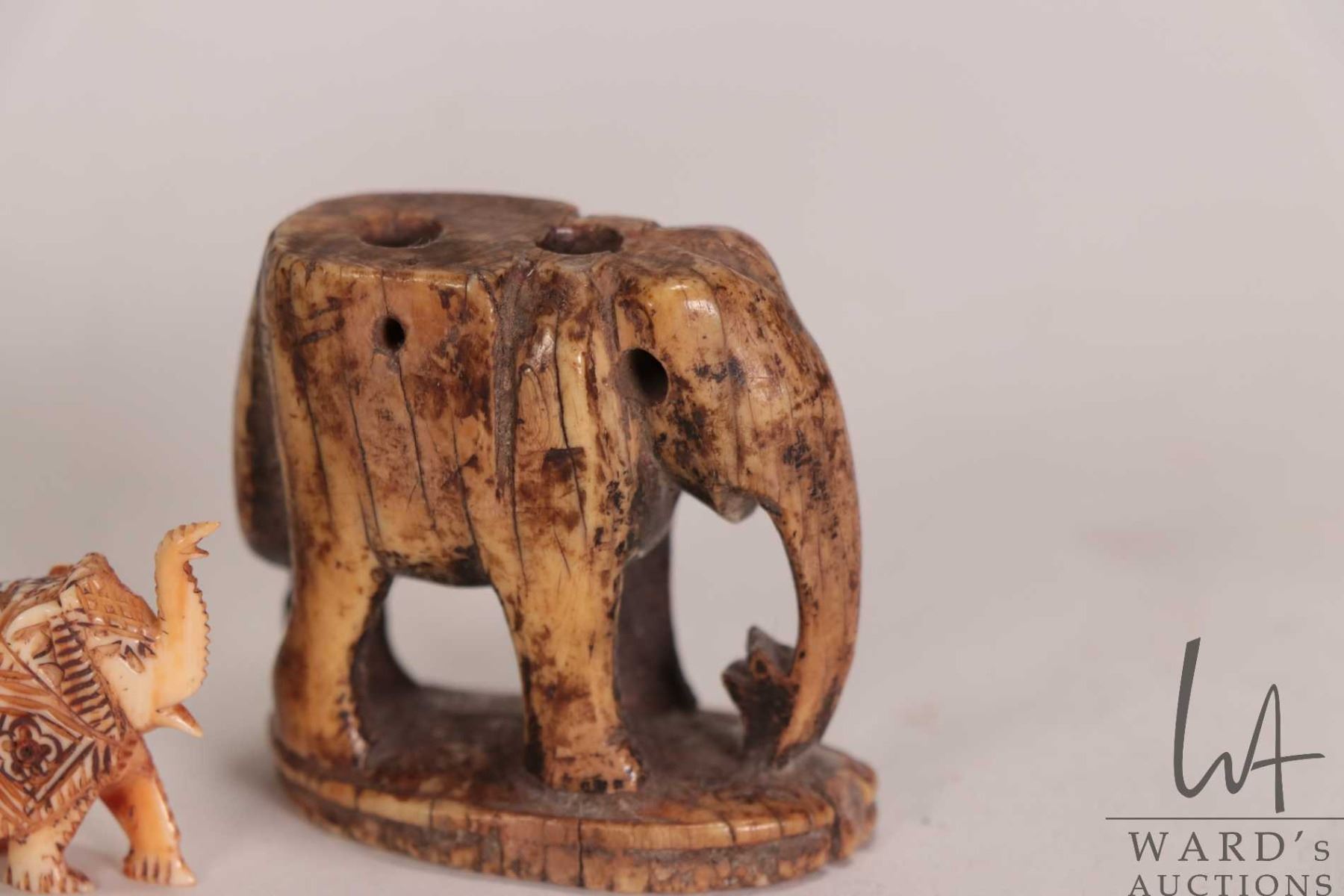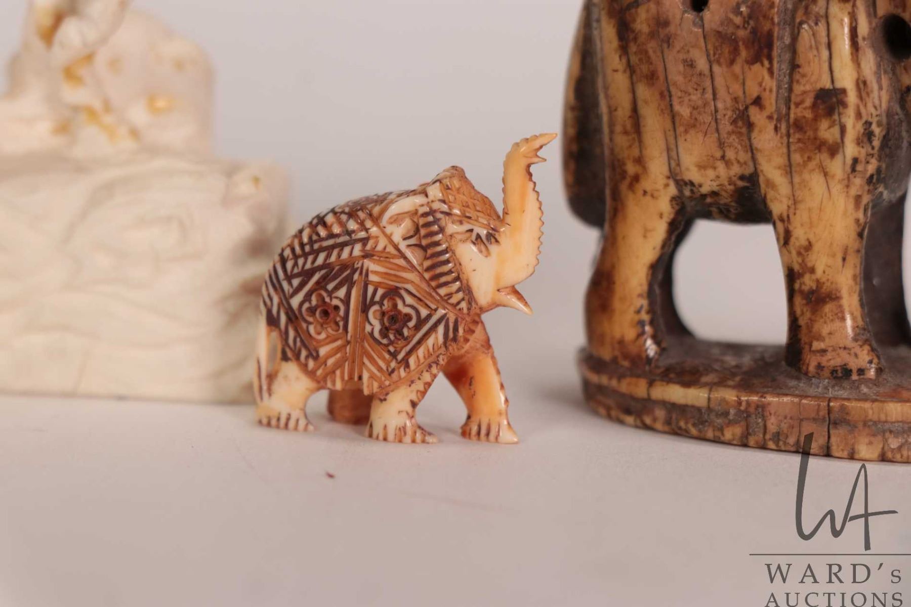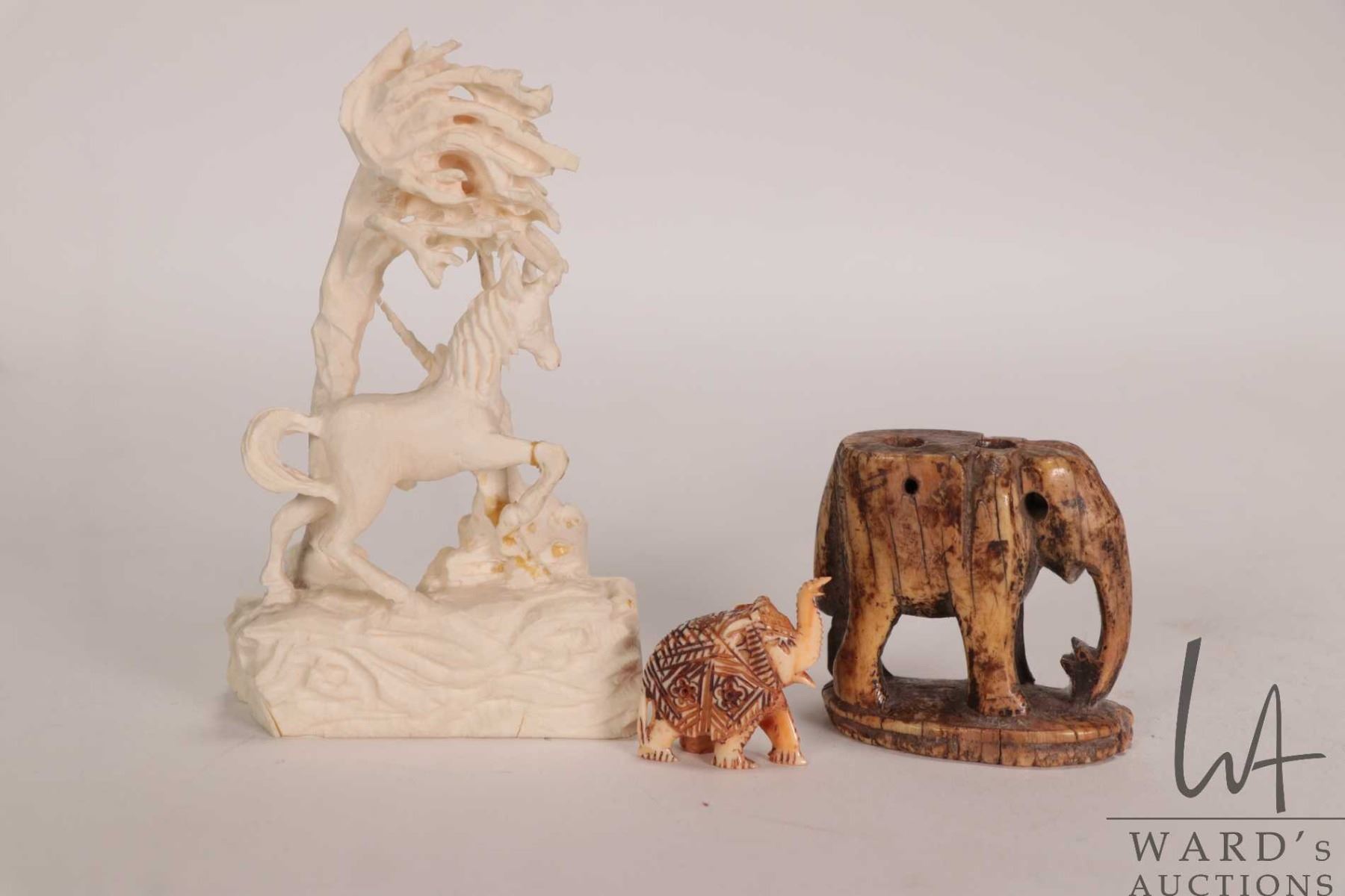 Three small carvings including ivory unicorn figures, note: has been glued 4" in height and a 1" elephant plus an unidentified bone/ ivory figure of an elephant, possibly ancient in origins 1 3/4" in height. Can not be shipped outside of Canada. Canadian buyers only.