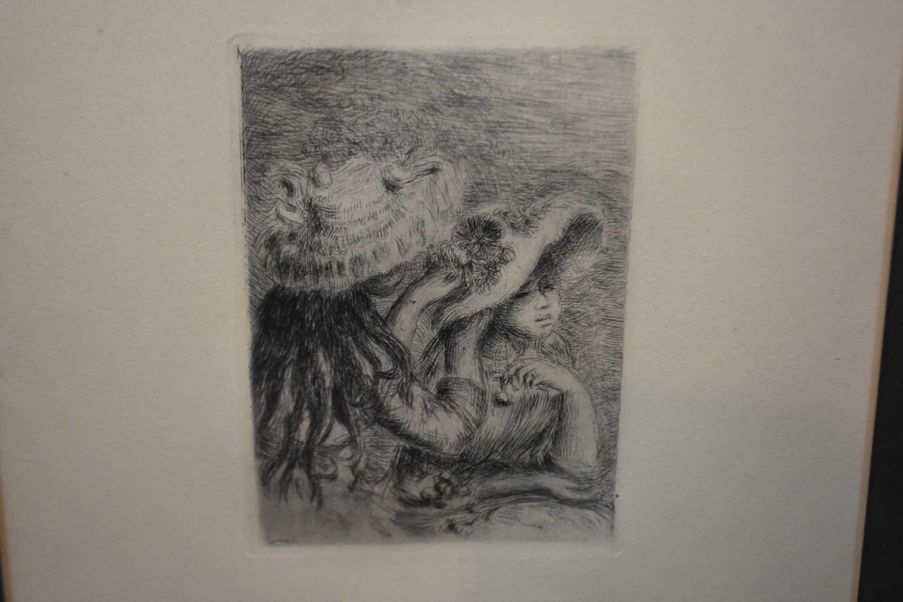 Three small framed etched prints including modest nude, gentleman and a Renoir etching of a girl fitting a friends bonnet