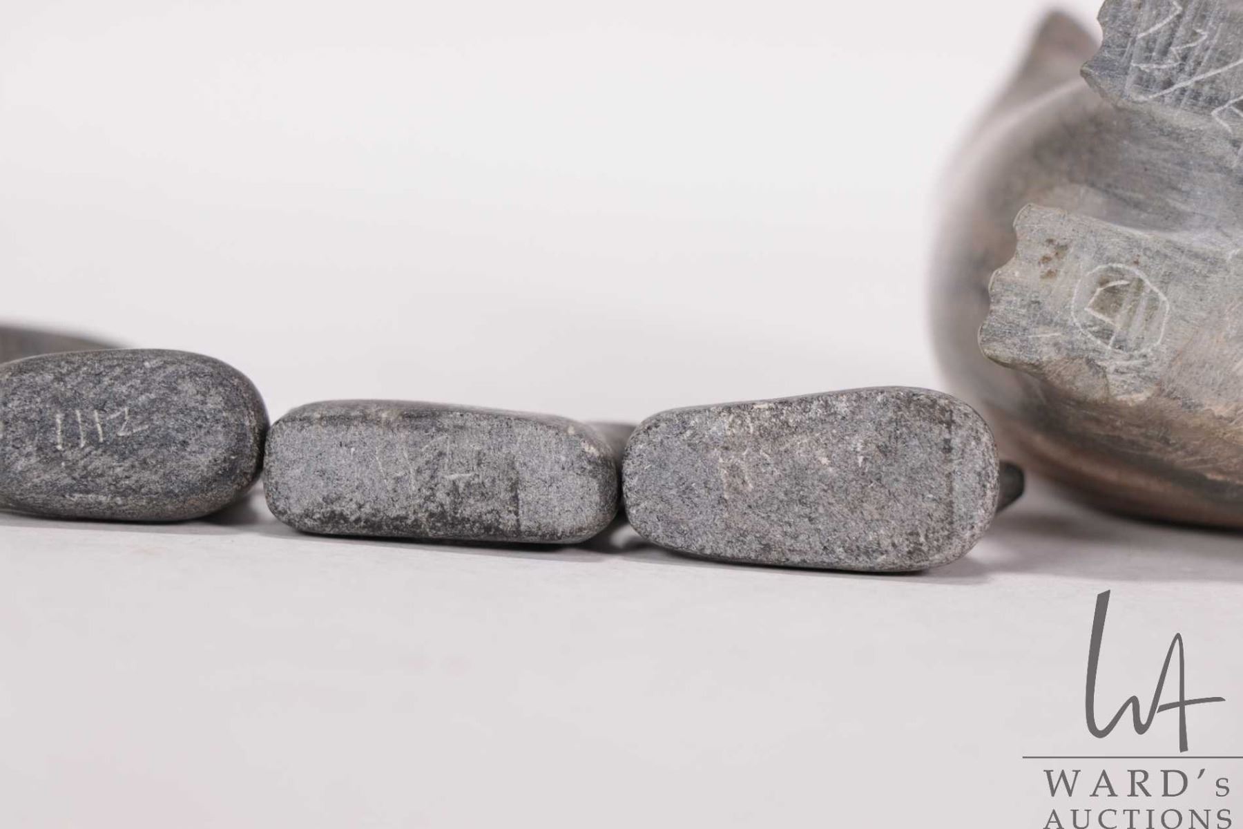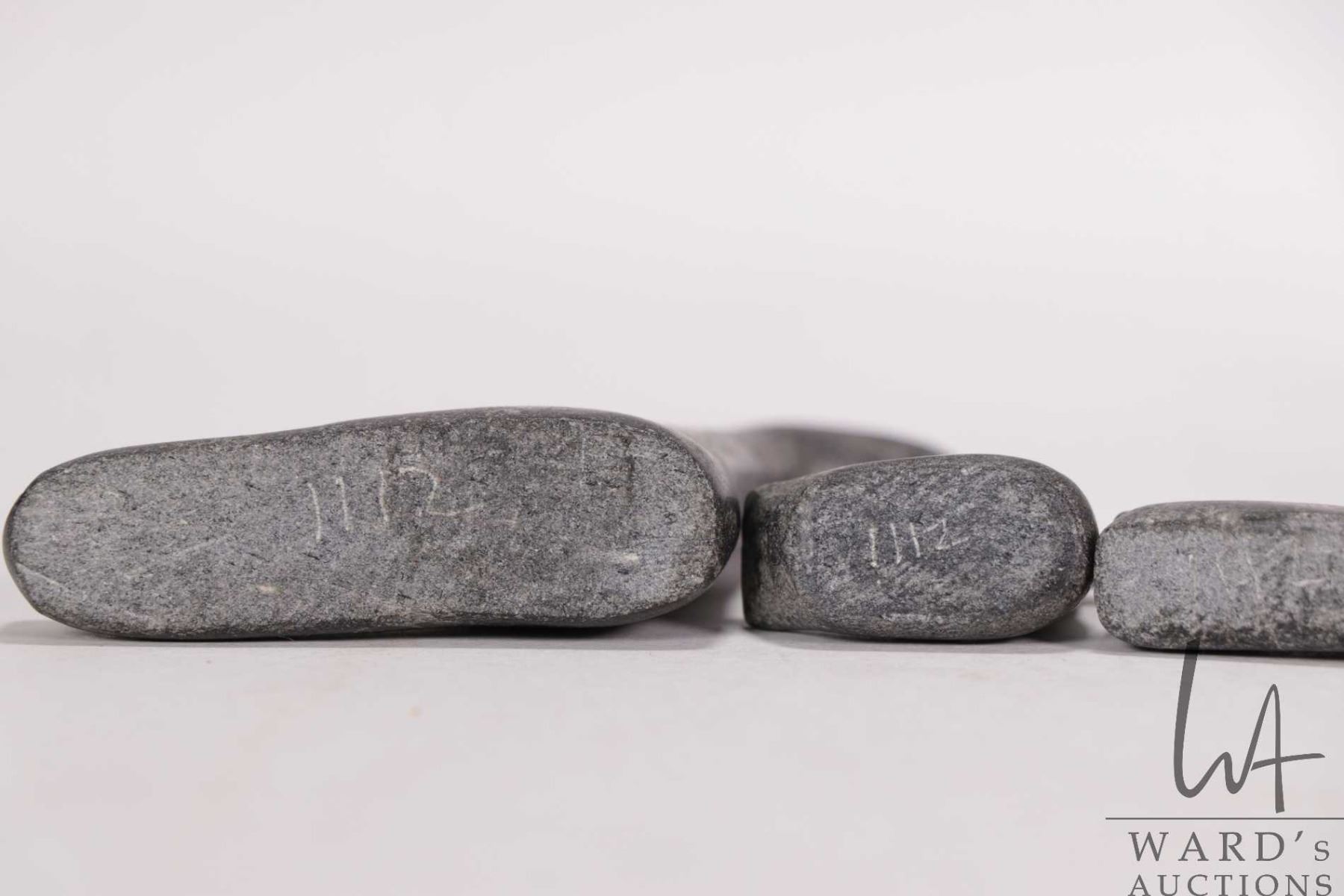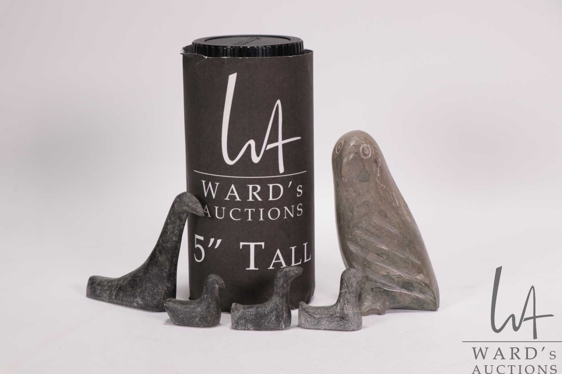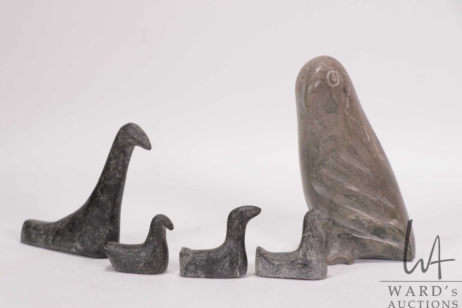 Three small hand carved soapstone birds by Joe Talirunili, 1"- 2 1/2" in height and a small carved b