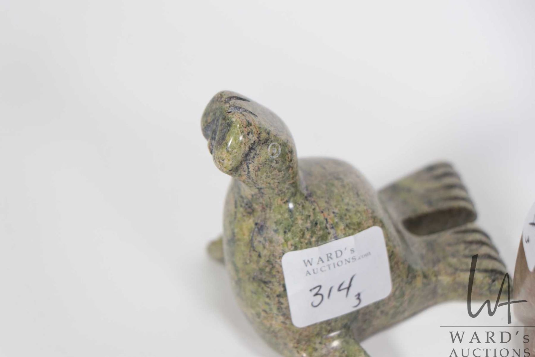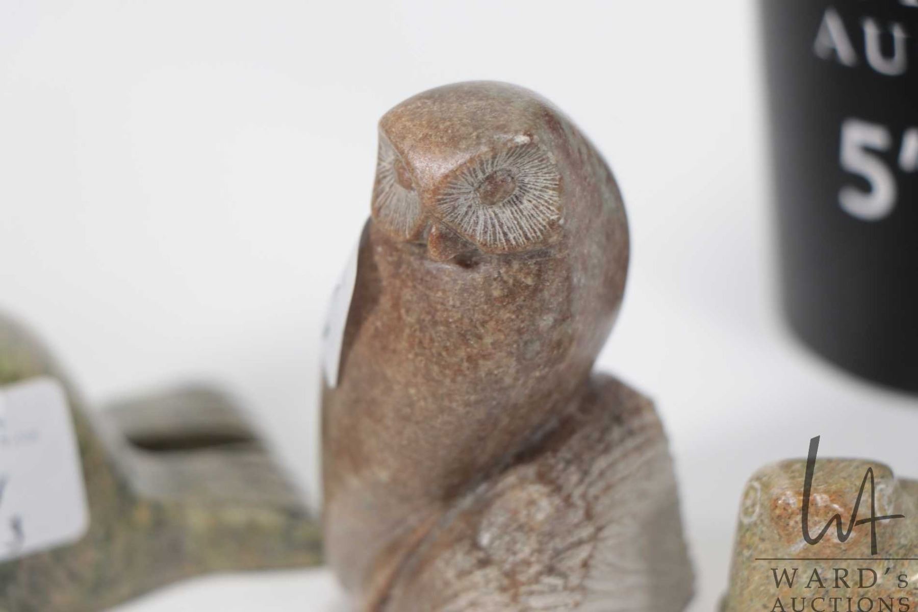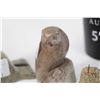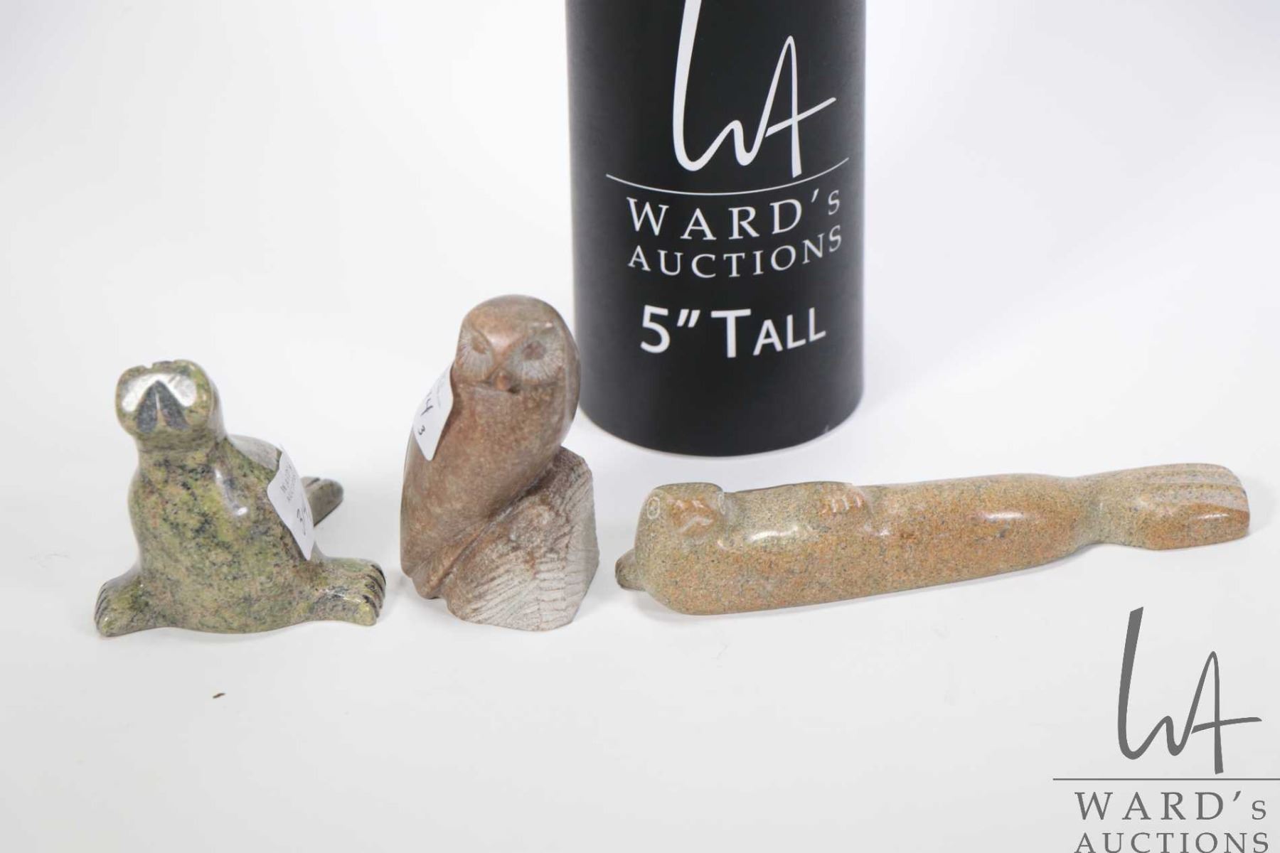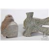 Three small hand carved soapstone figures including two seals and an owl 3" in height