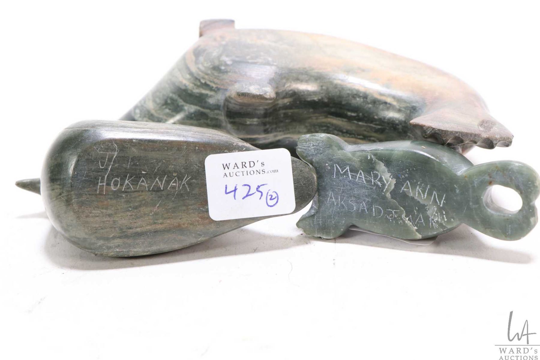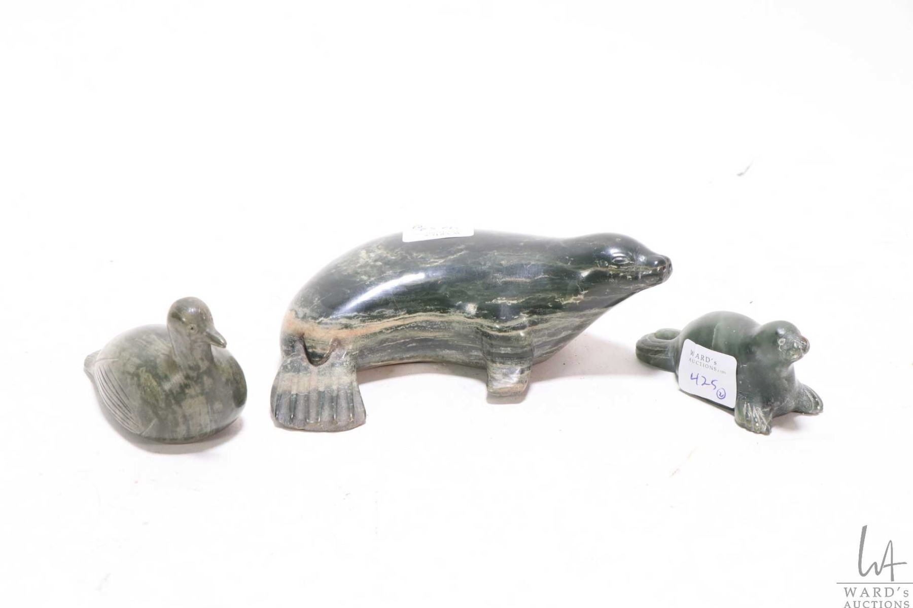 Three soapstone carvings including a 5 1/2" long seal, no signature seen, a small walrus signed Maryann and a loon signed J. Hokanak