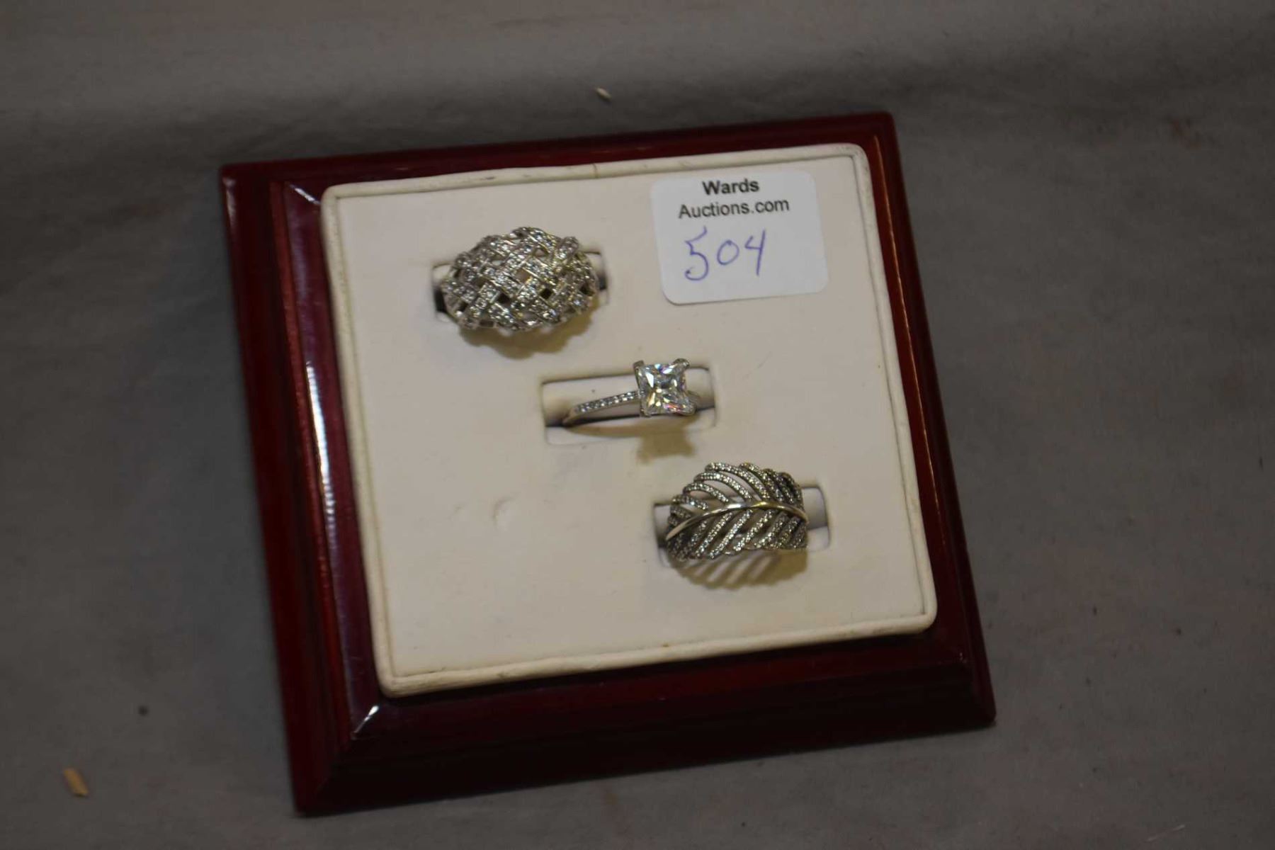 Three sterling silver rings including Pandora leaf set with cubics stones, a cross weave ring and a square cubic stone set in pave setting