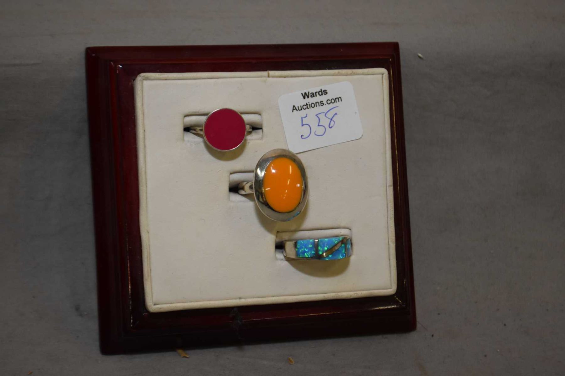 This Item Not Available For Shipping. Local Bidders Only. Three sterling silver rings including two with enameling and one opal like gemstone set ring