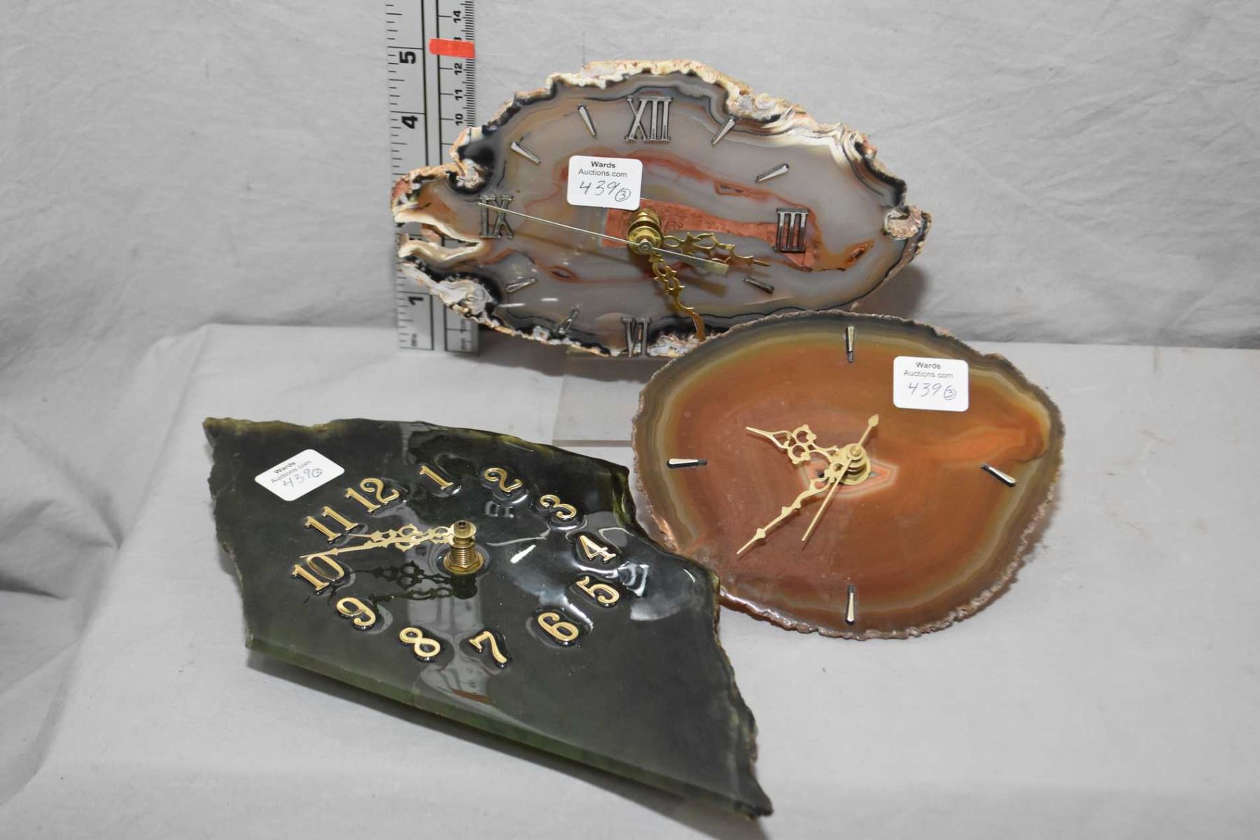 Three stone slab clocks including two desk clocks and a wall clock, all with quartz movements