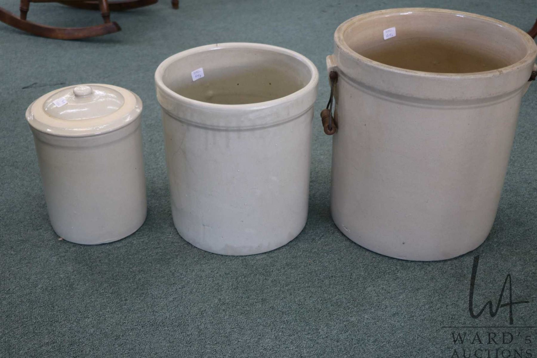 Three stoneware crocks including five gallon Medalta Potteries with handles, three gallon Alberta Po
