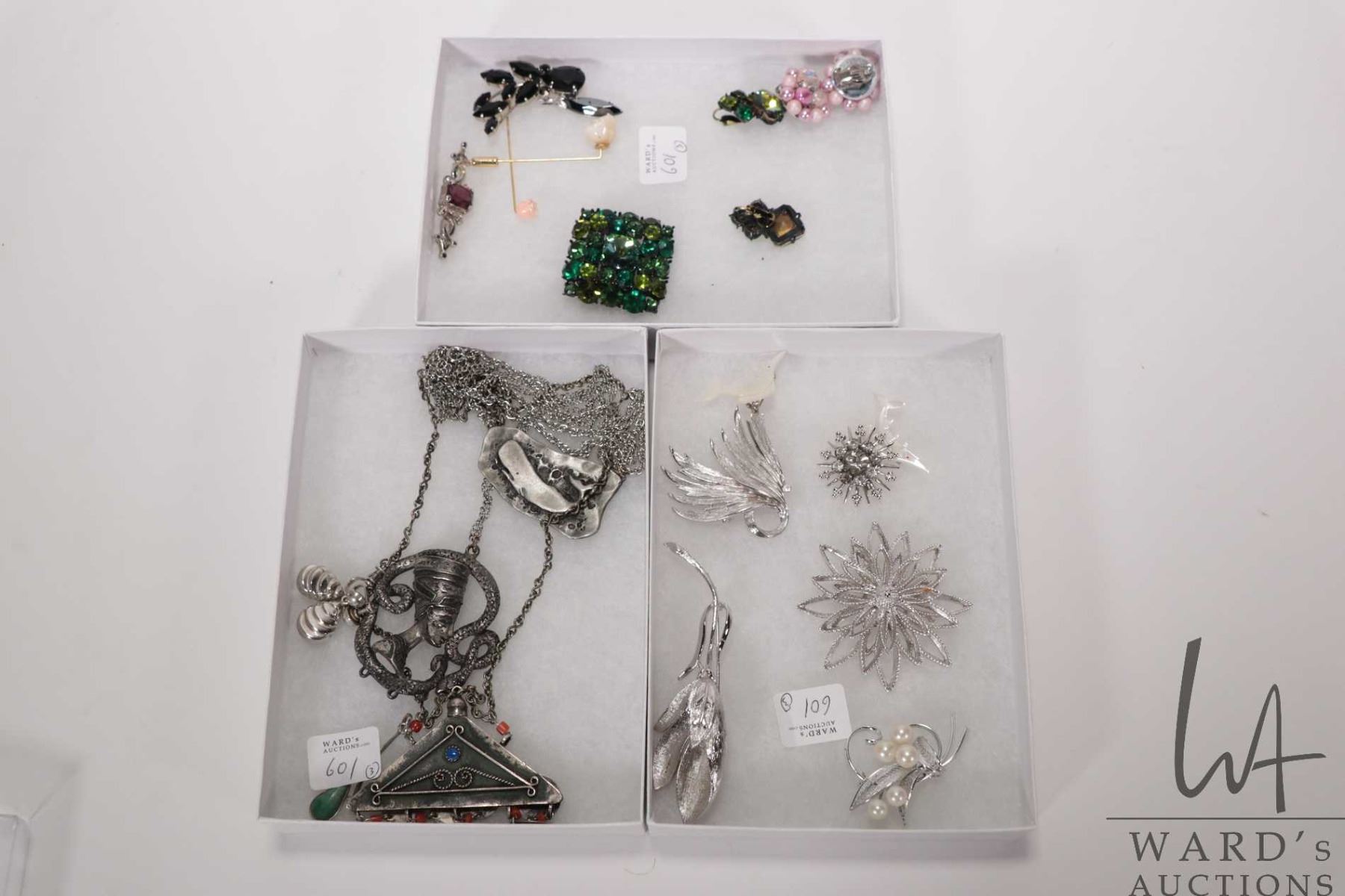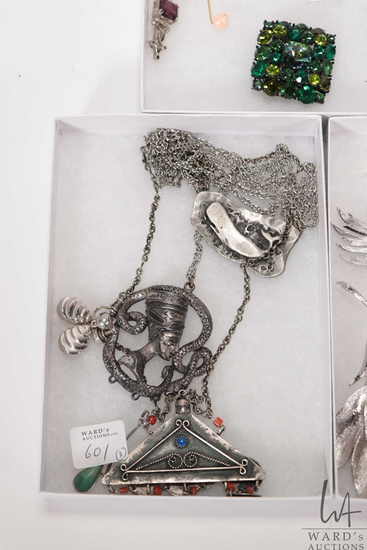Three trays of jewellery including silver tone brooch, mother-of-pearl Marlin fish earrings etc. plus Nefertiti necklace, vessel pendant with gemstone/ like decoration, green brooch with earrings, etc.