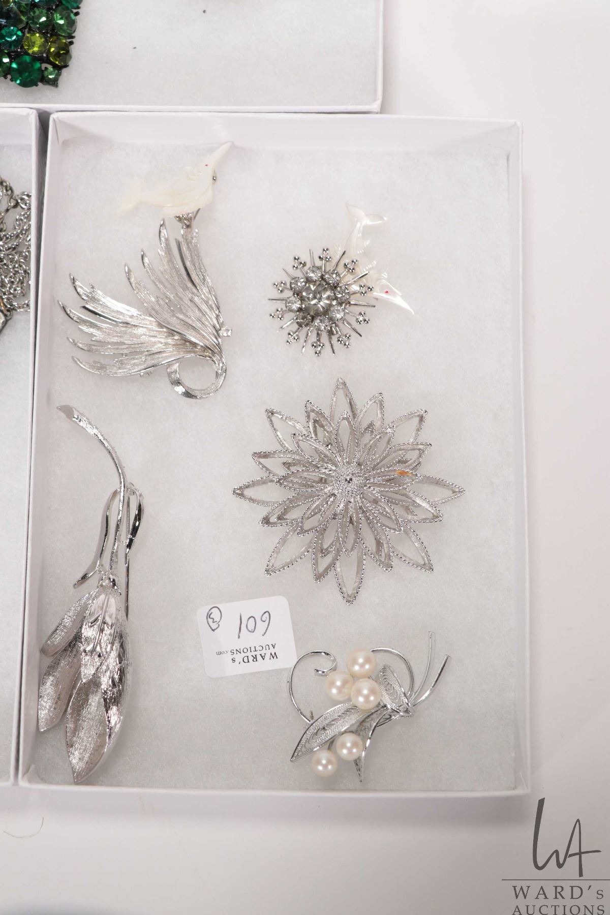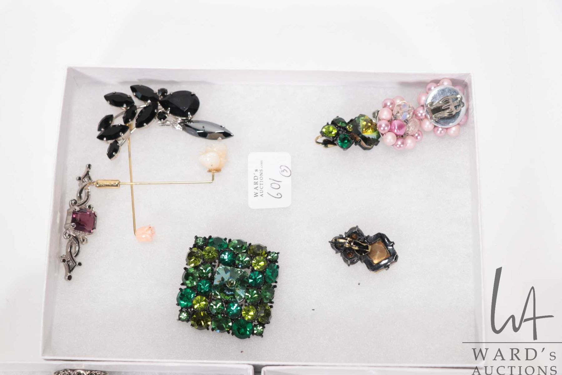 Three trays of jewellery including silver tone brooch, mother-of-pearl Marlin fish earrings etc. plu
