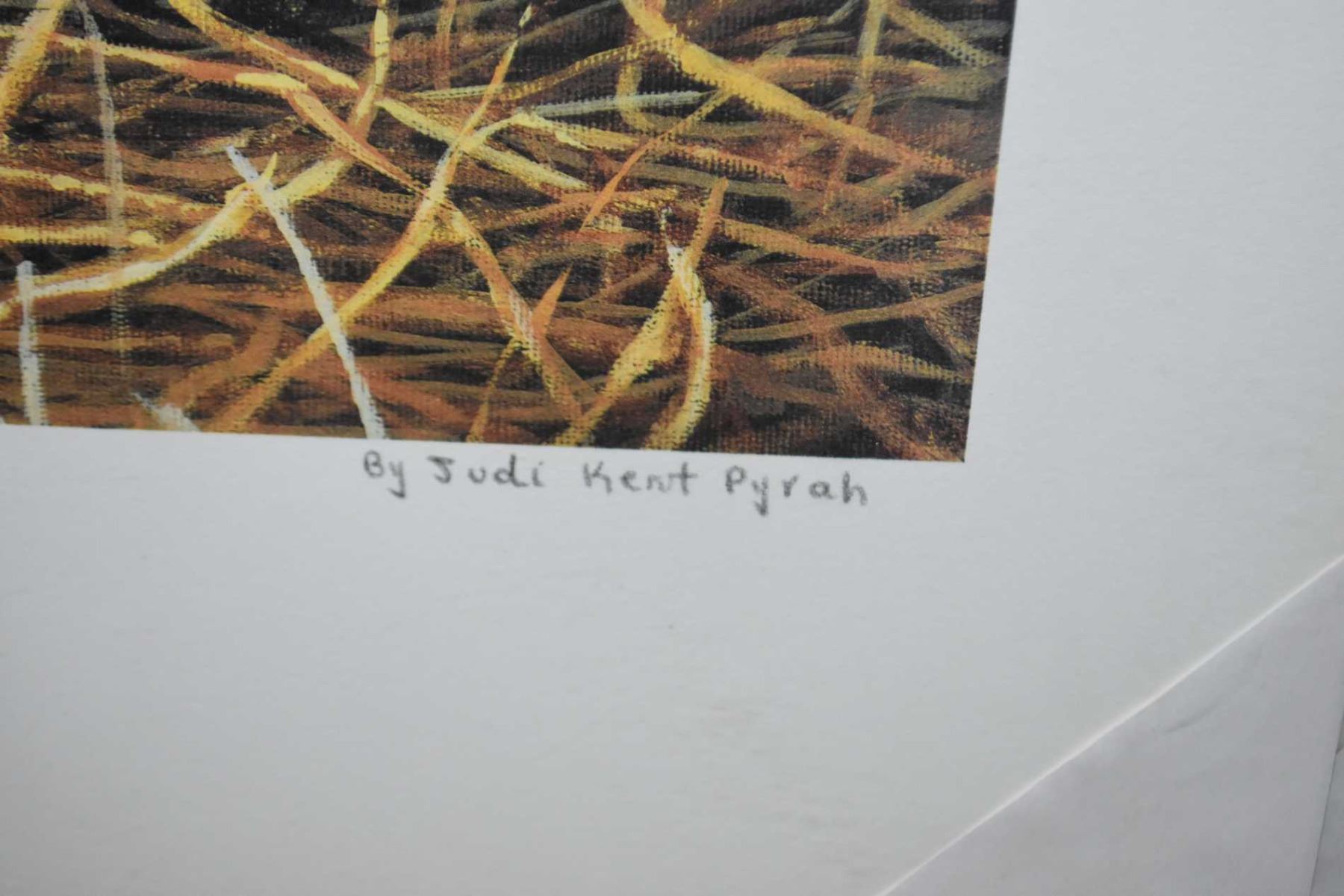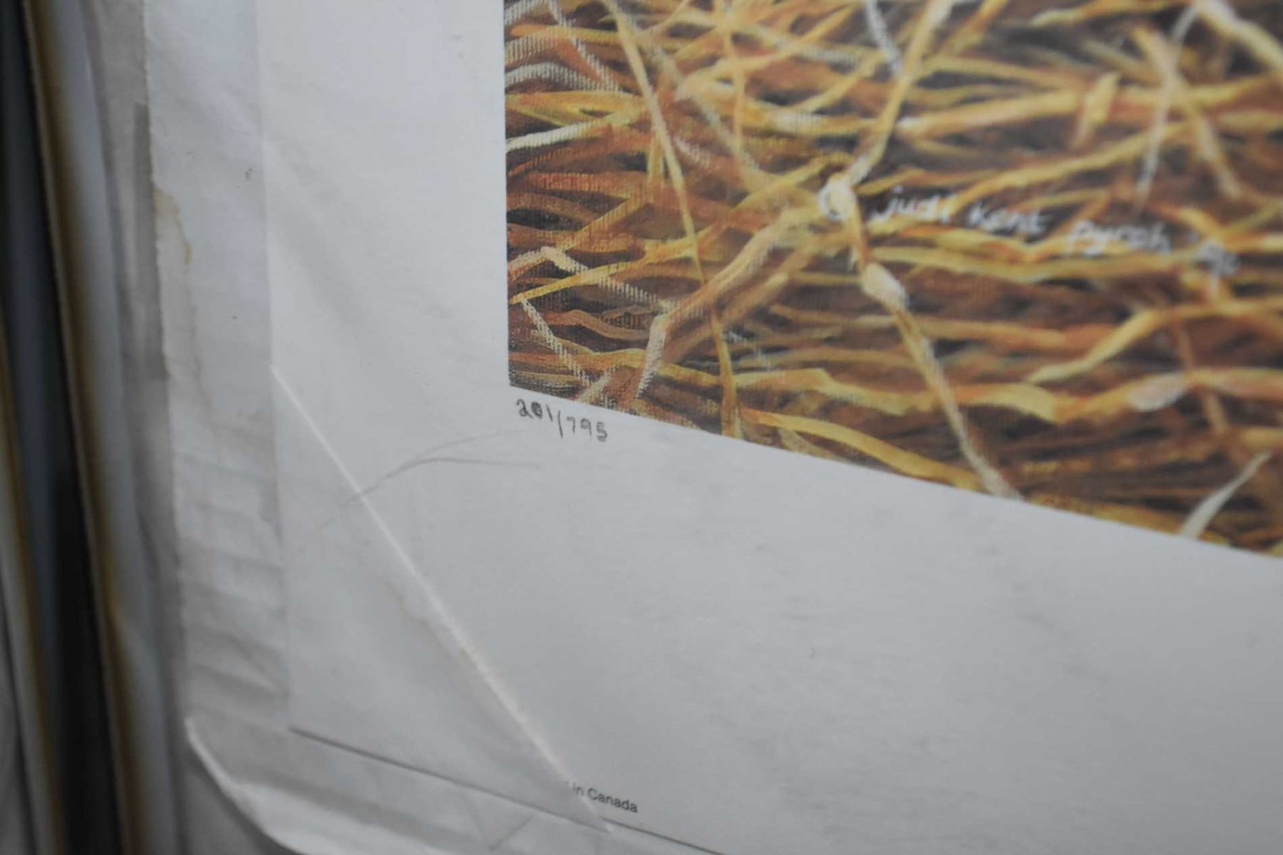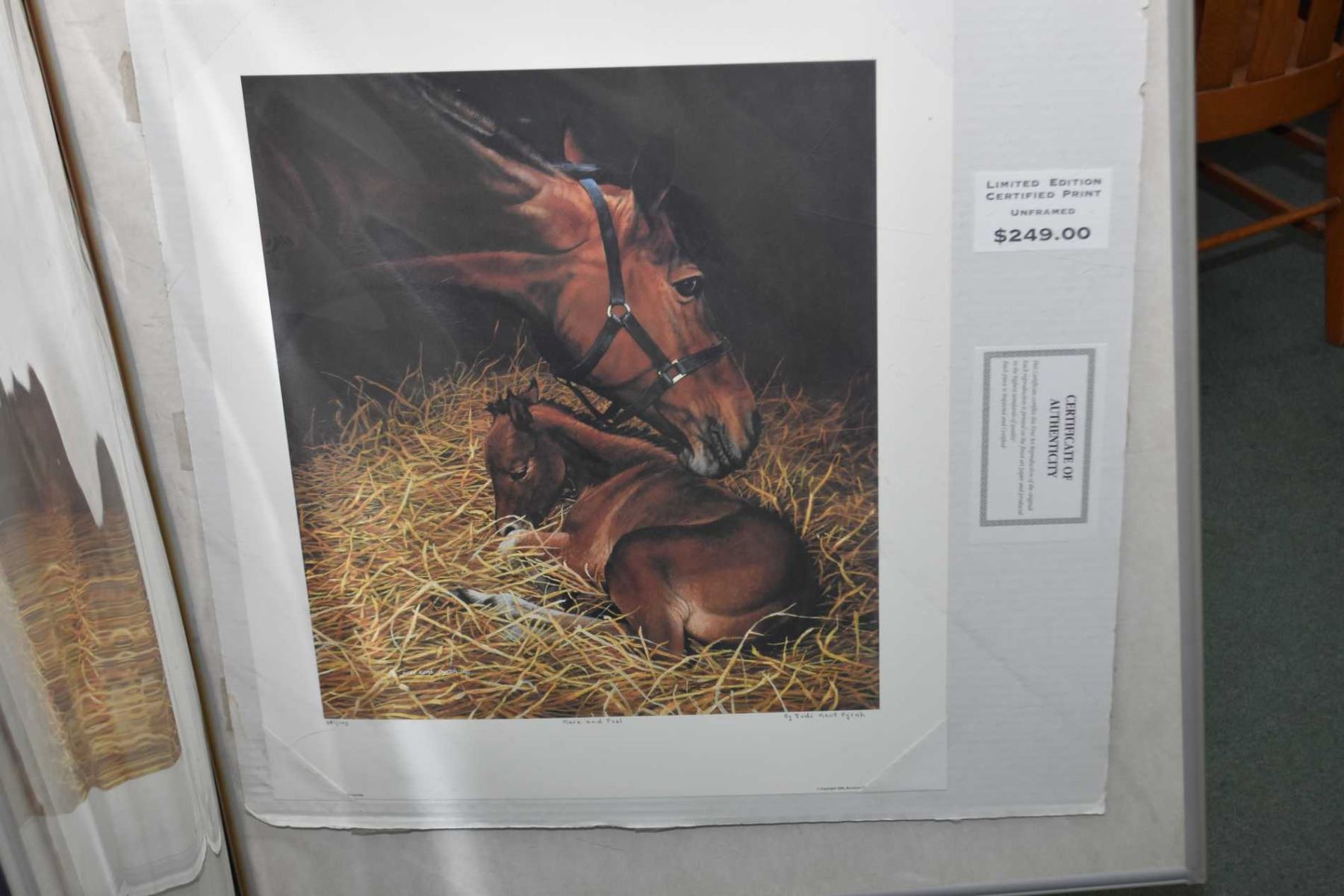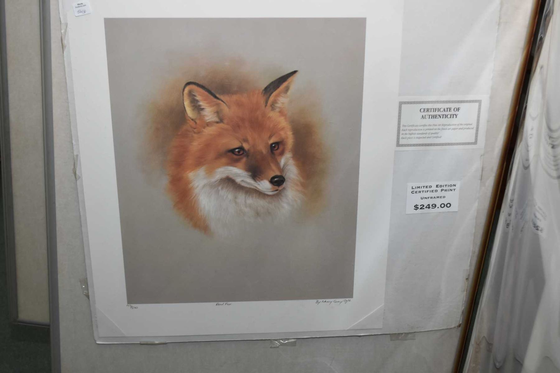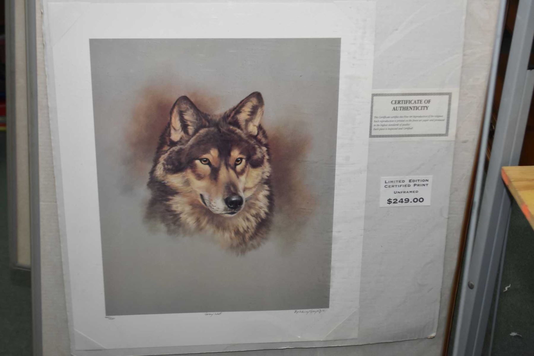 Three unframed limited edition prints including "Gray Wolf" by Nancy Gray Ogle 44/500, "Mare and Foal" by Judy Kent Pyrah 201/795 and "Red Fox" by Nancy Gray Ogle 117/500, all our pencil signed by artist