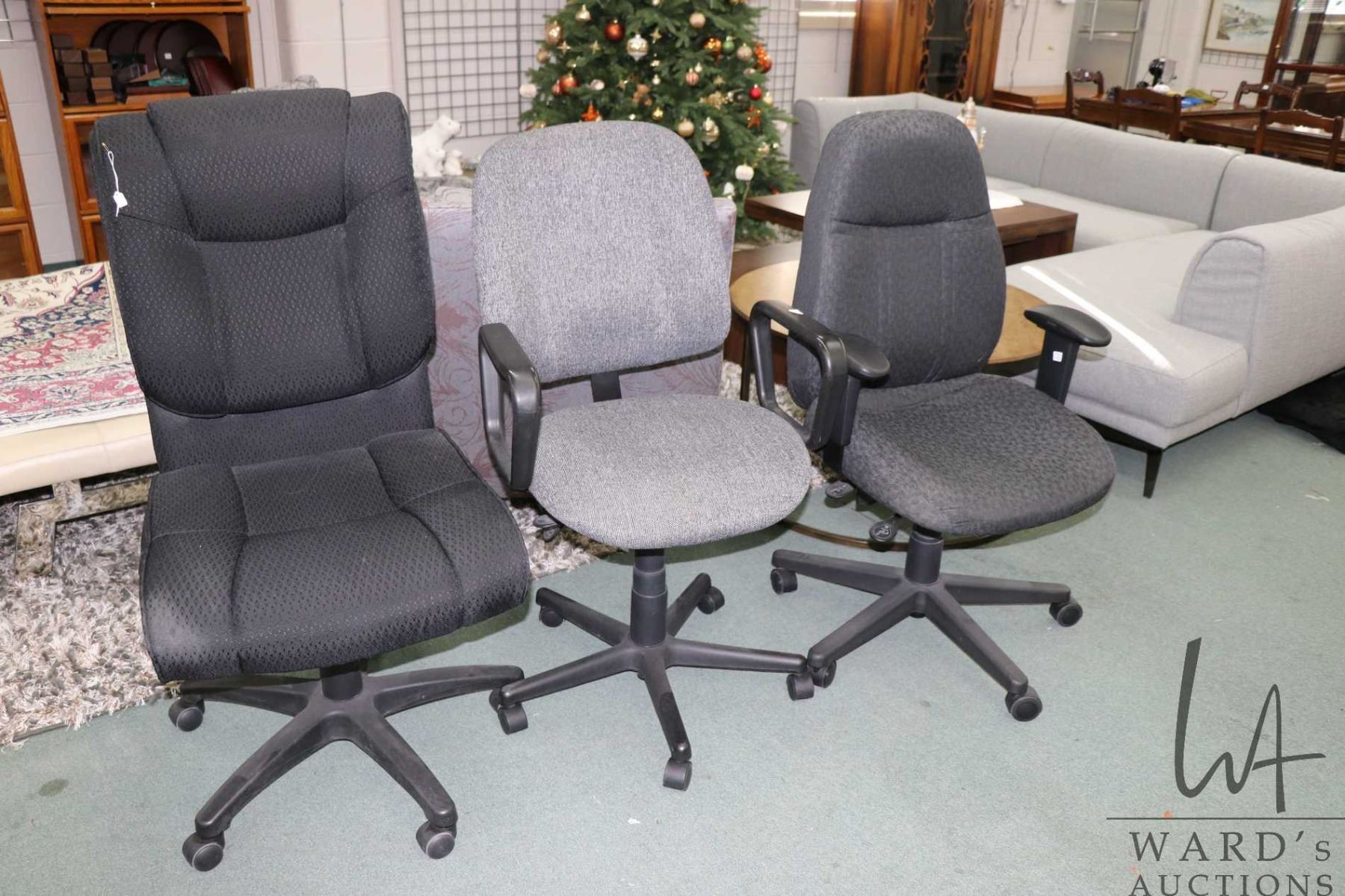 Three upholstered swivel fully adjustable office chairs, all are non-matching