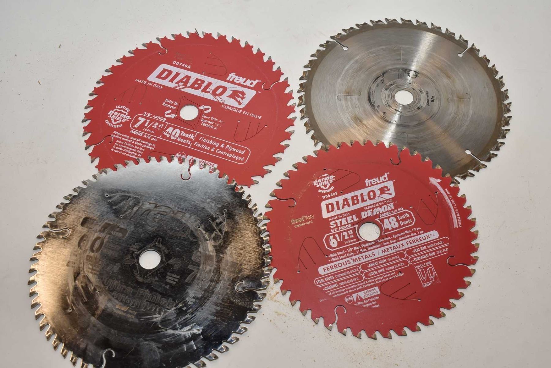 Three used 7" circular saw blades and one 6 1/2" circular saw blade