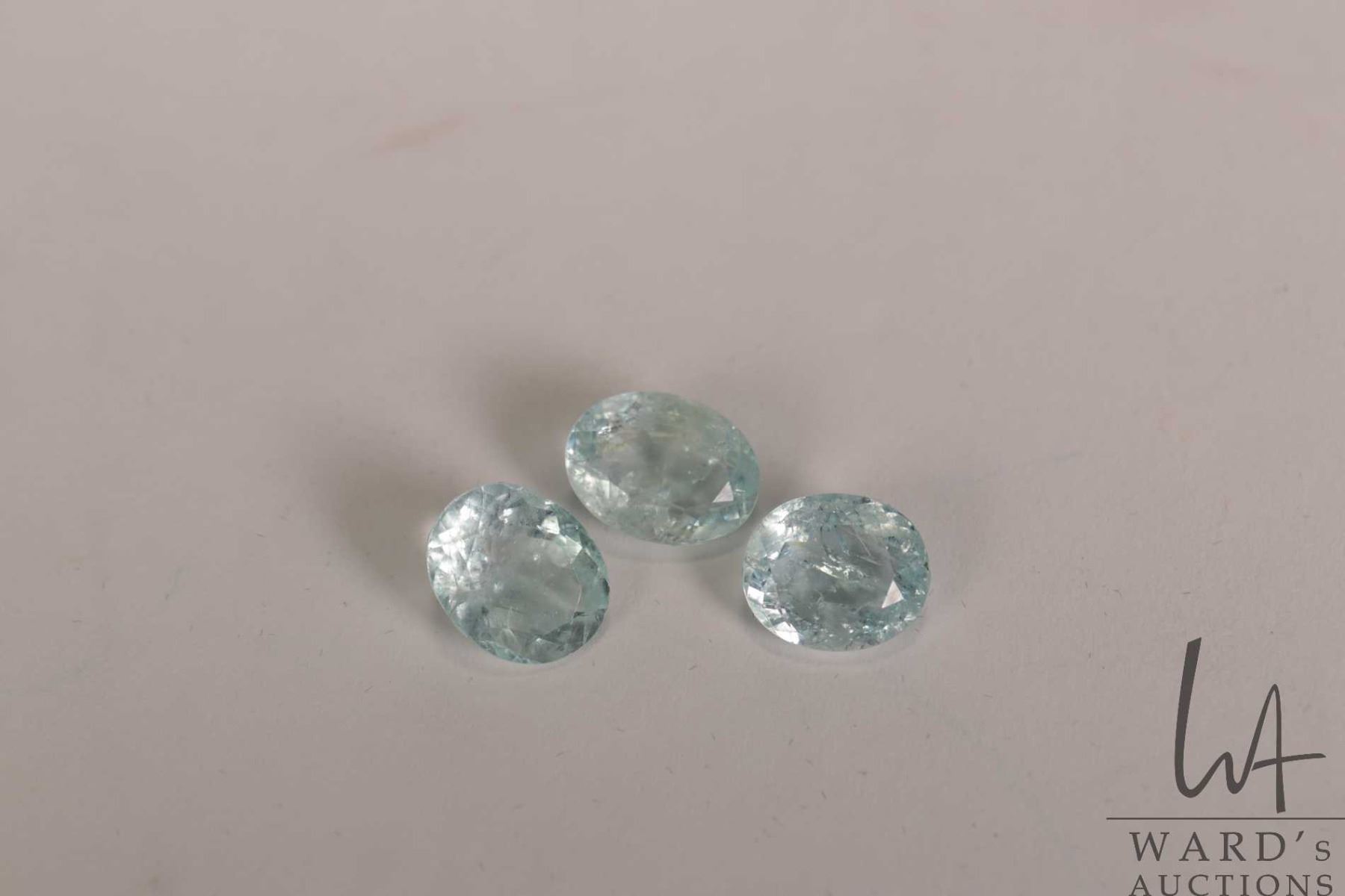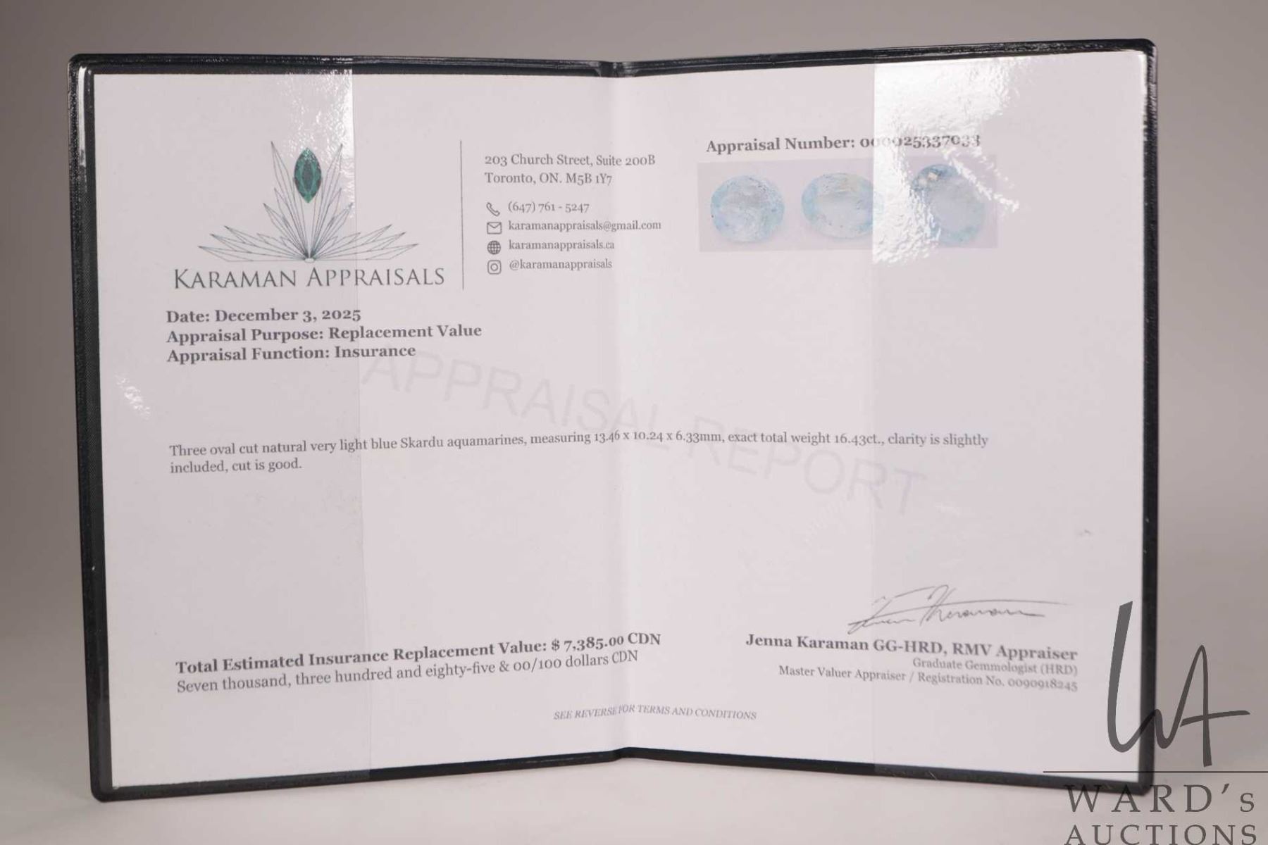 Three very light blue Skardu aquamarine gemstones 16.43 cts. with certificate provided by consignor