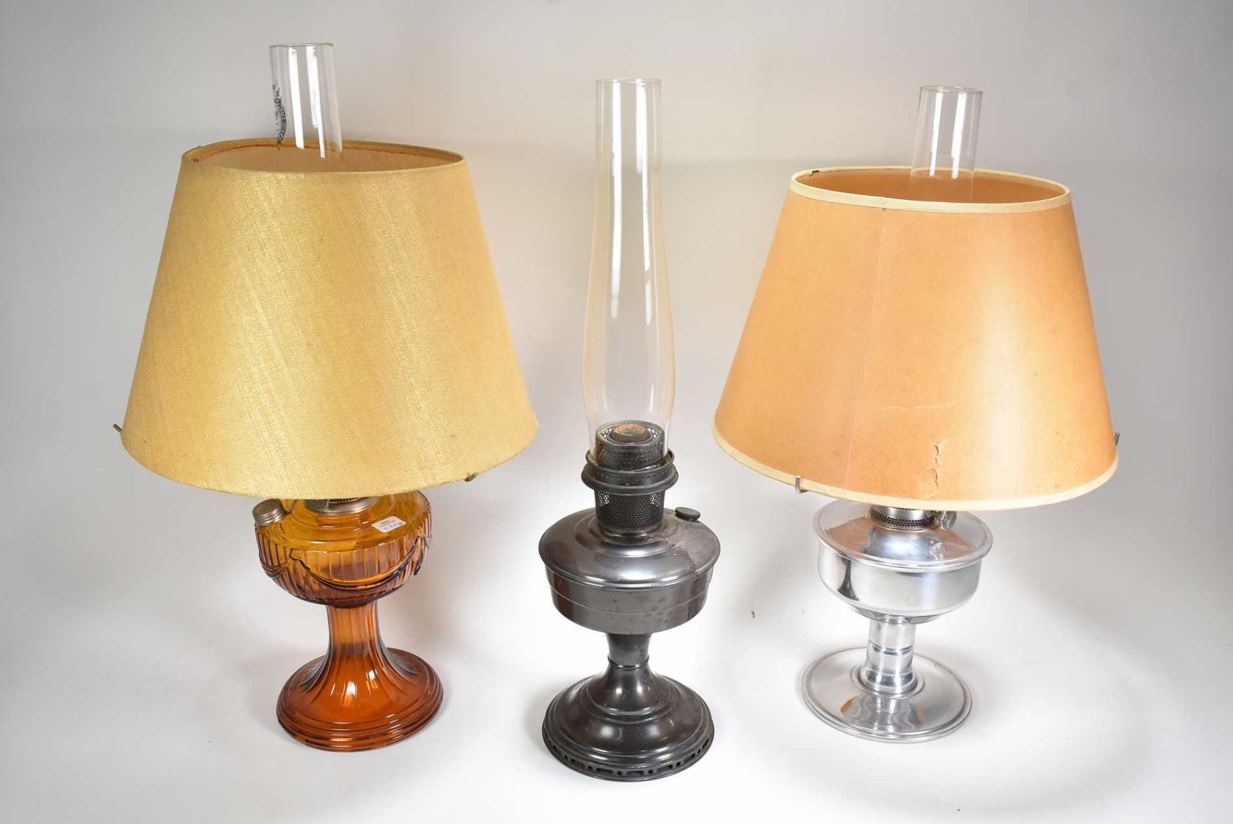 Three vintage Aladdin oil lamps including amber glass amber glass Lincoln drape with hurricane and original paper shade, an aluminium lamp with paper shade and hurricane plus a gun metal lamp with hurricane. Not available for shipping. Local pickup only
