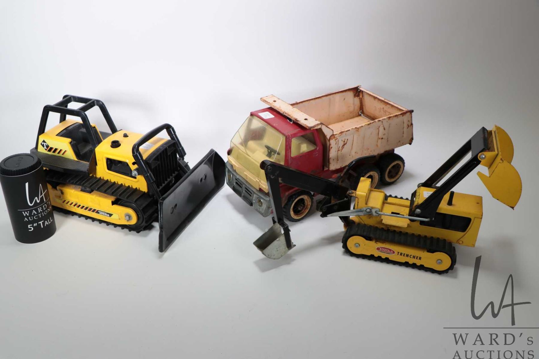 Three vintage Tonka pressed steel toys including a back hoe, dozer and a dump truck