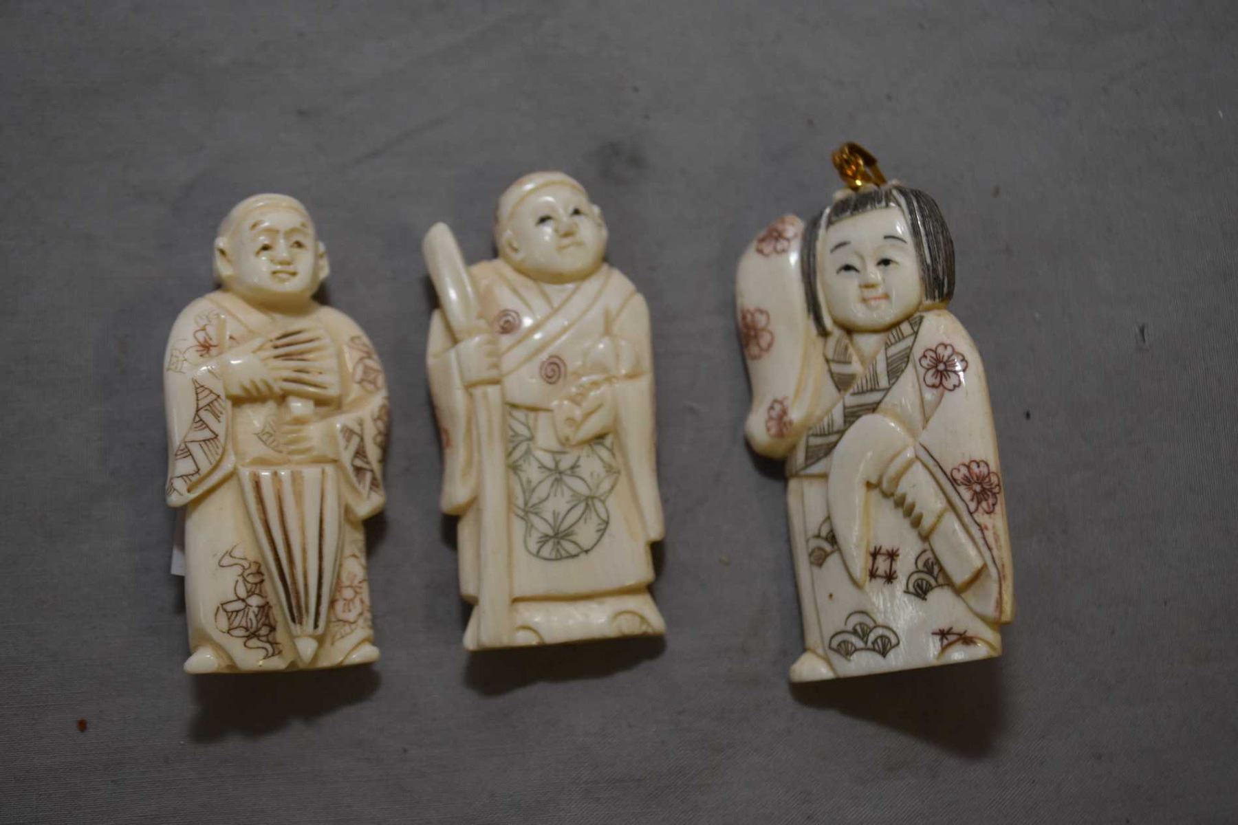 Three vintage carved ivory figures including one 2" netsuke and a pendant/brooch and a 1 3/4" carved figure
