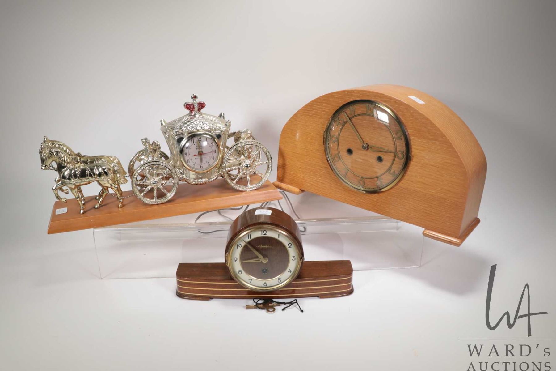 Three vintage clocks including electric horse and carriage, a West German walnut Mauthe mantle clock with satin wood banding, includes key plus an oak veneer mantle clock, chime removed. All working at time of cataloguing