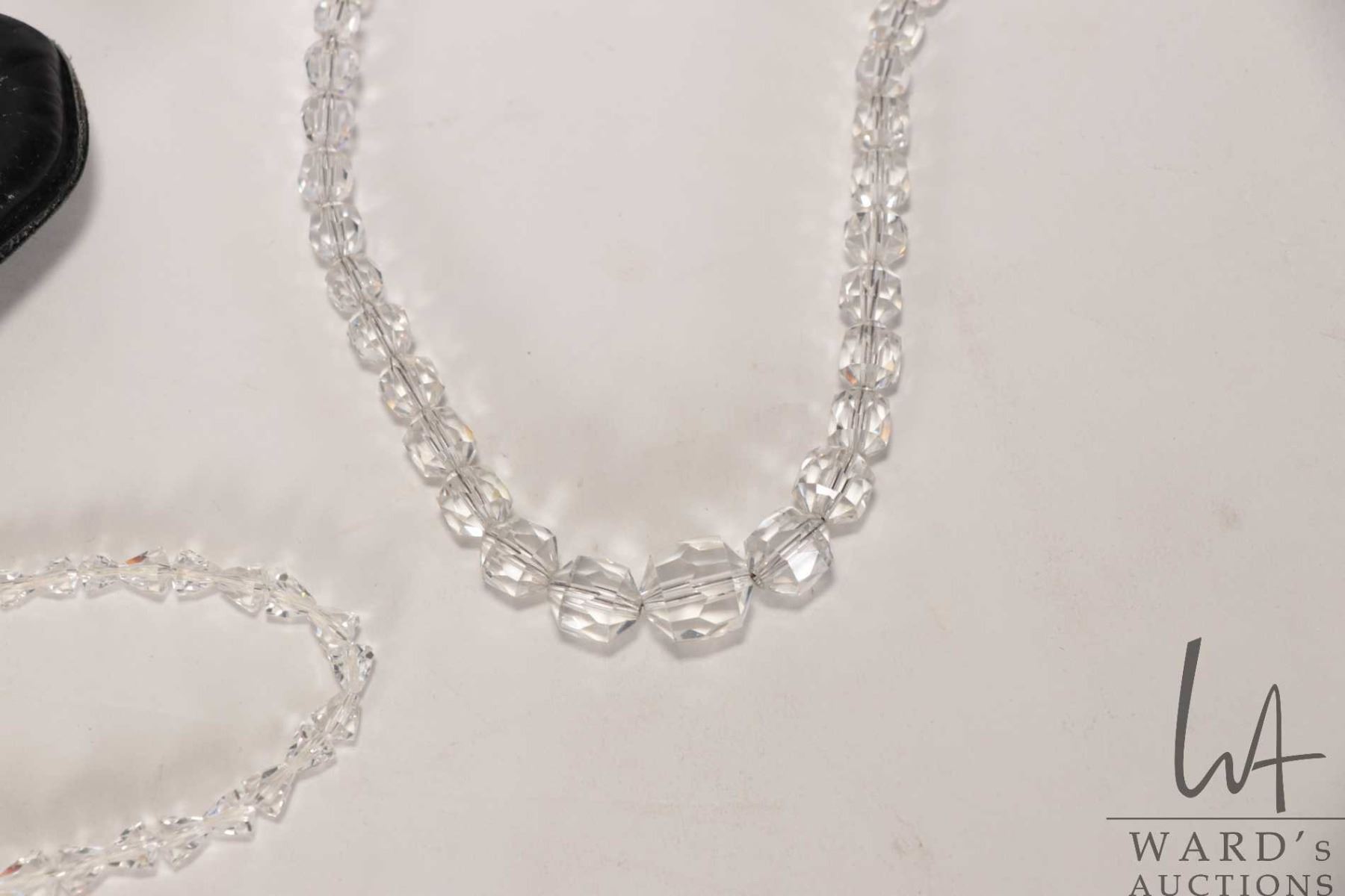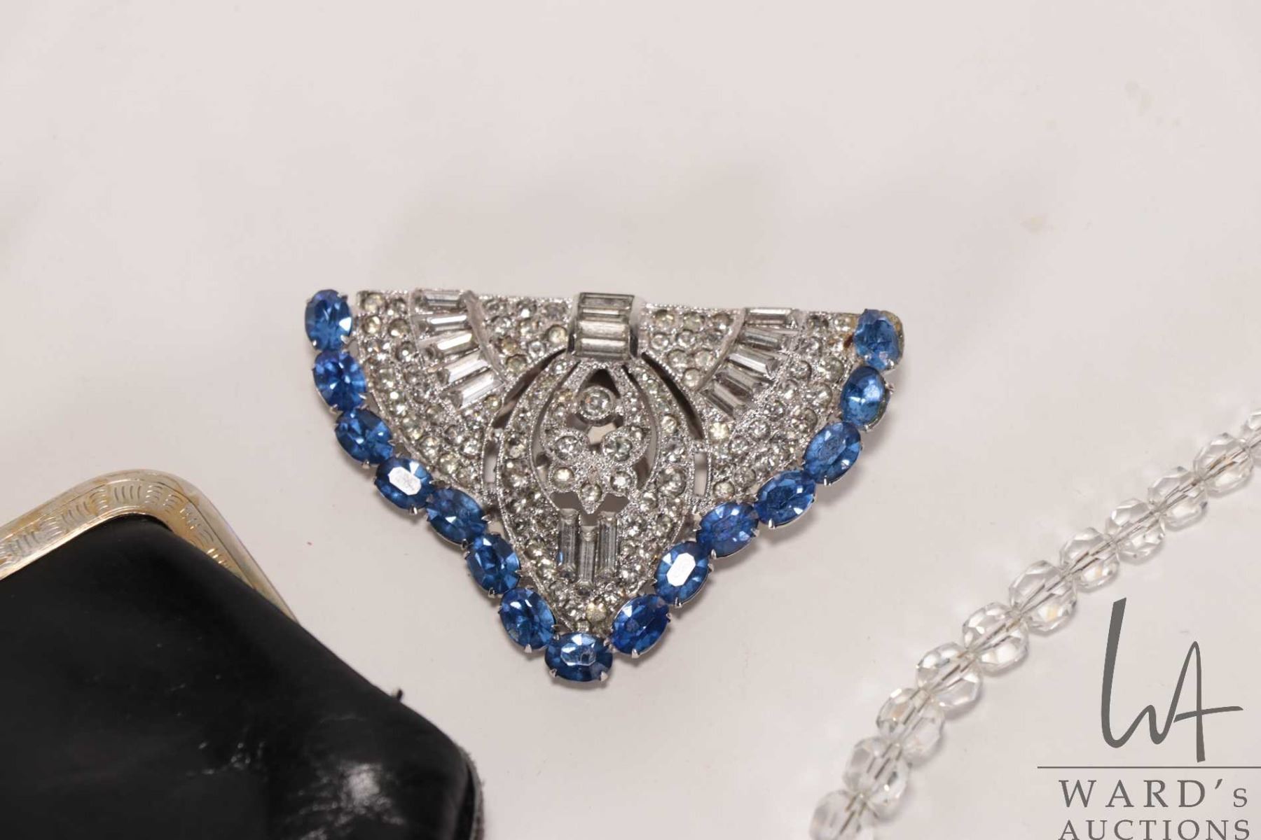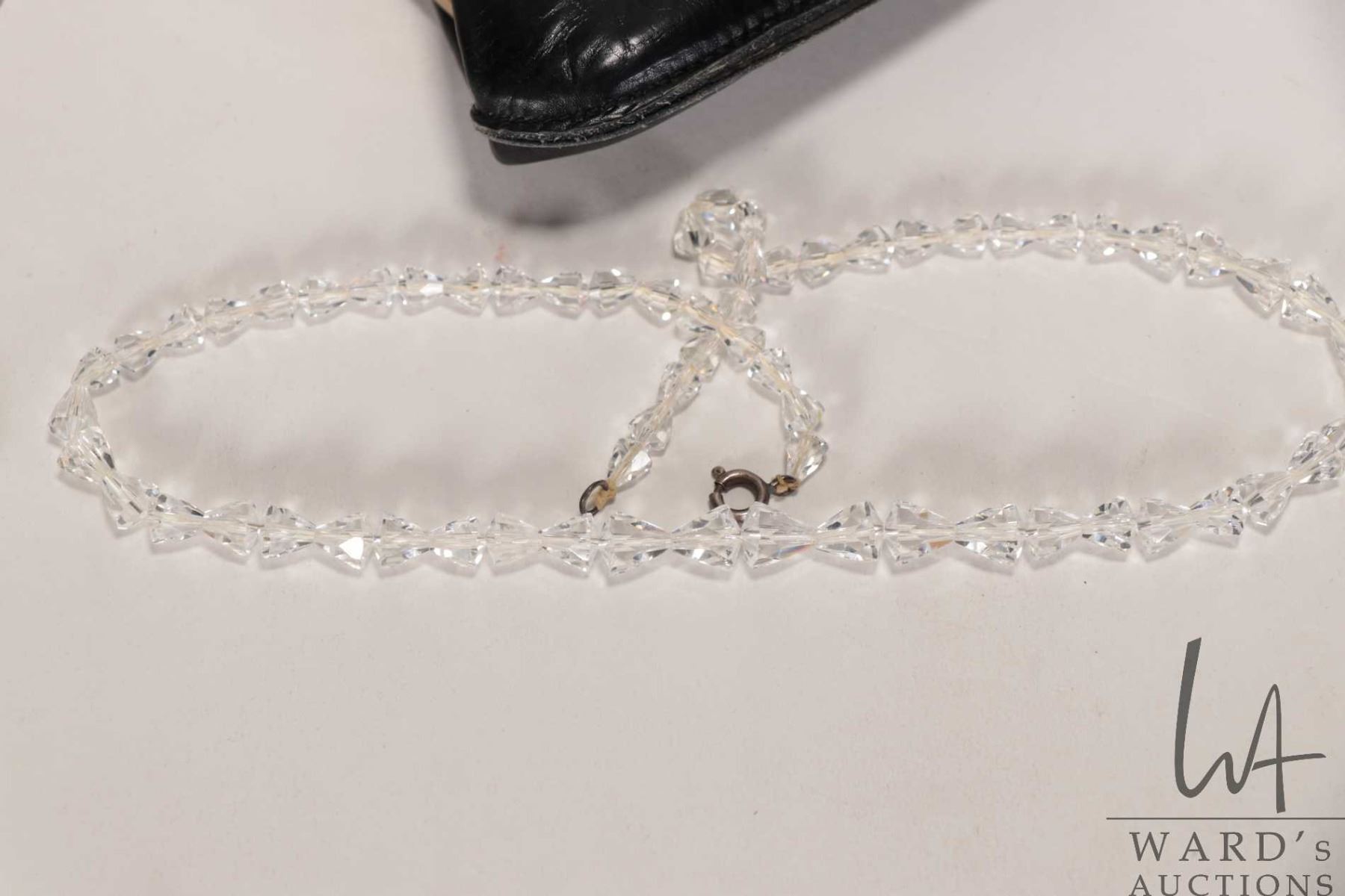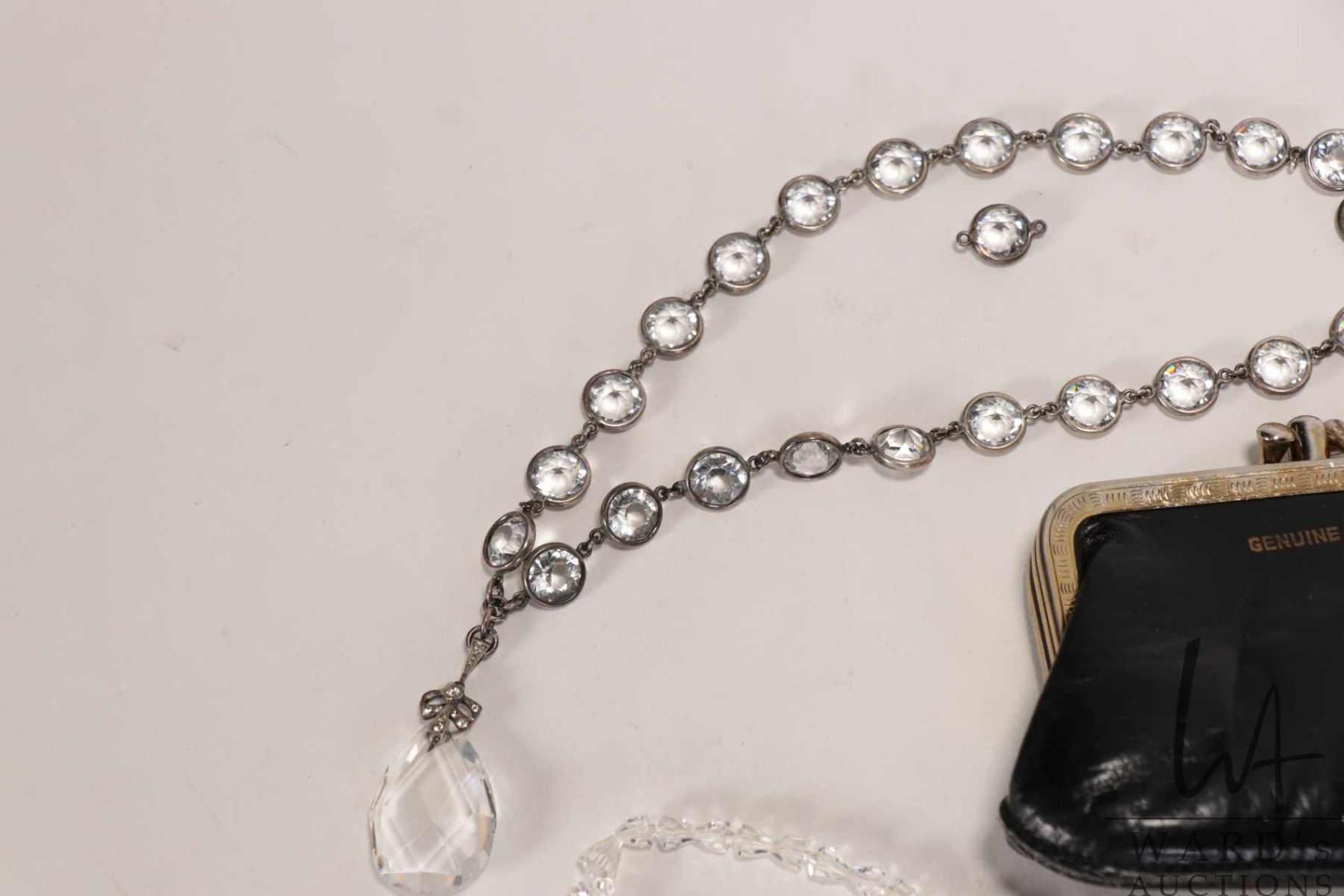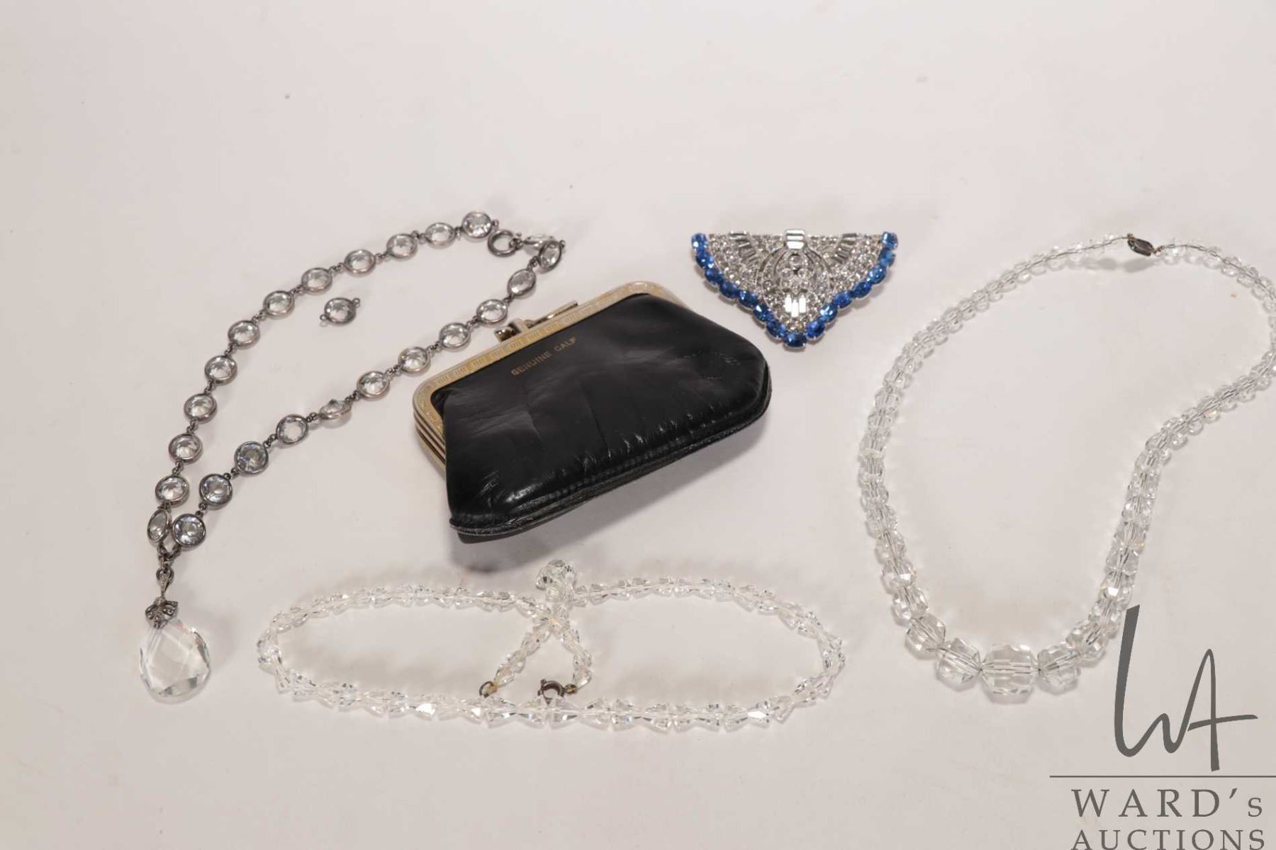 Three vintage crystal necklaces, a rhinestone collar pin and a calf skin coin purse