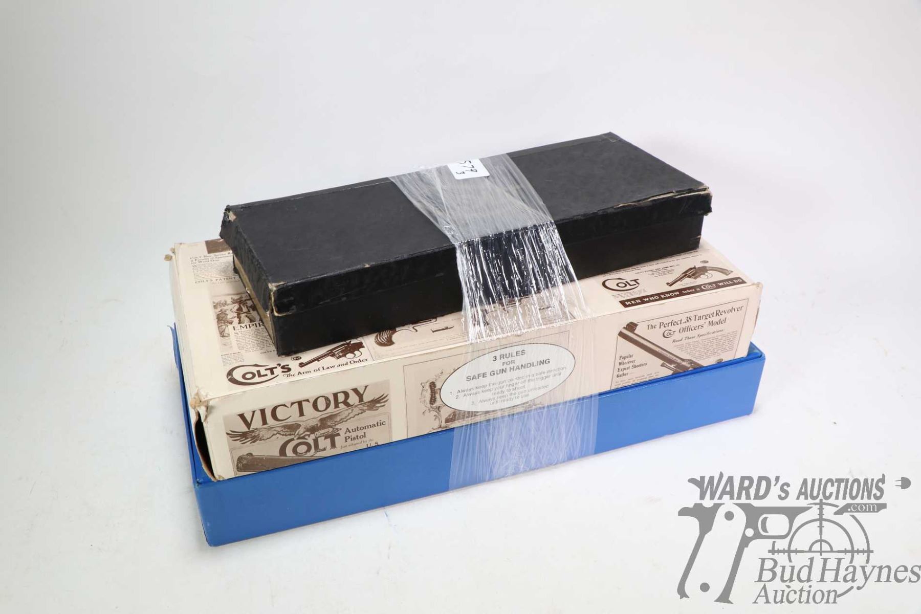 Three vintage original Colt cardboard boxes including Colt's Single Action Army Revolver, Anaconda and blue fitted Colt revolver box