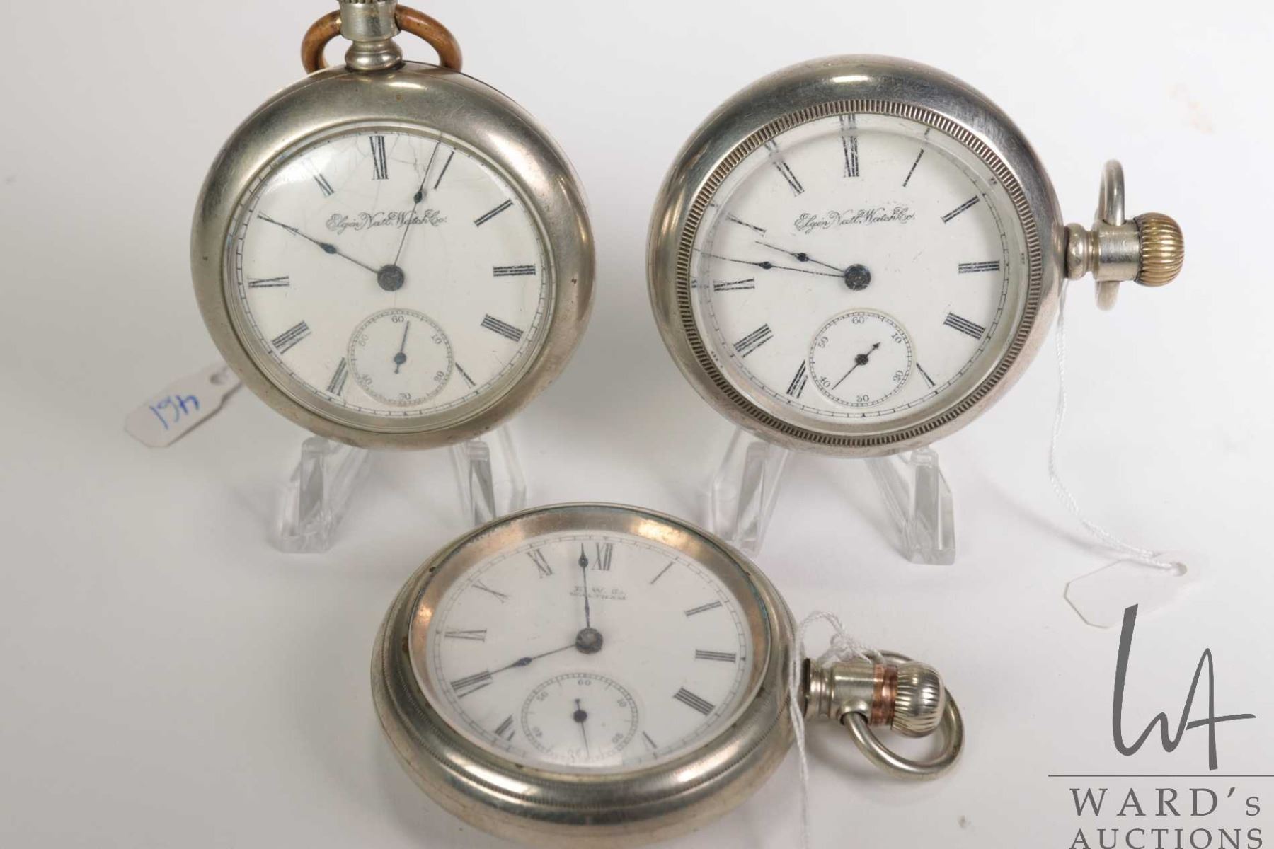 Three vintage pocket watches including Elgin National Watch Co., grade 75 pocket watch with 15 jewel movement, serial no. 5595542, with enamel dial and single sunk second sweep with Roman numerals in Silveroid case, size 18 and an Elgin National Watch Co., grade 82 pocket watch with 13 jewel or 15 jewel movement, serial no. 4418771 enamel dial with single sunk second sweep and Roman numerals in Silveroid case, size 18 plus a Waltham, grade 1 pocket watch with 7 jewelled movement, serial no. 5093515, enamel dial and single sunk second sweep, Roman numerals, in Silveroid threaded open face, size 18, all working at time of cataloguing