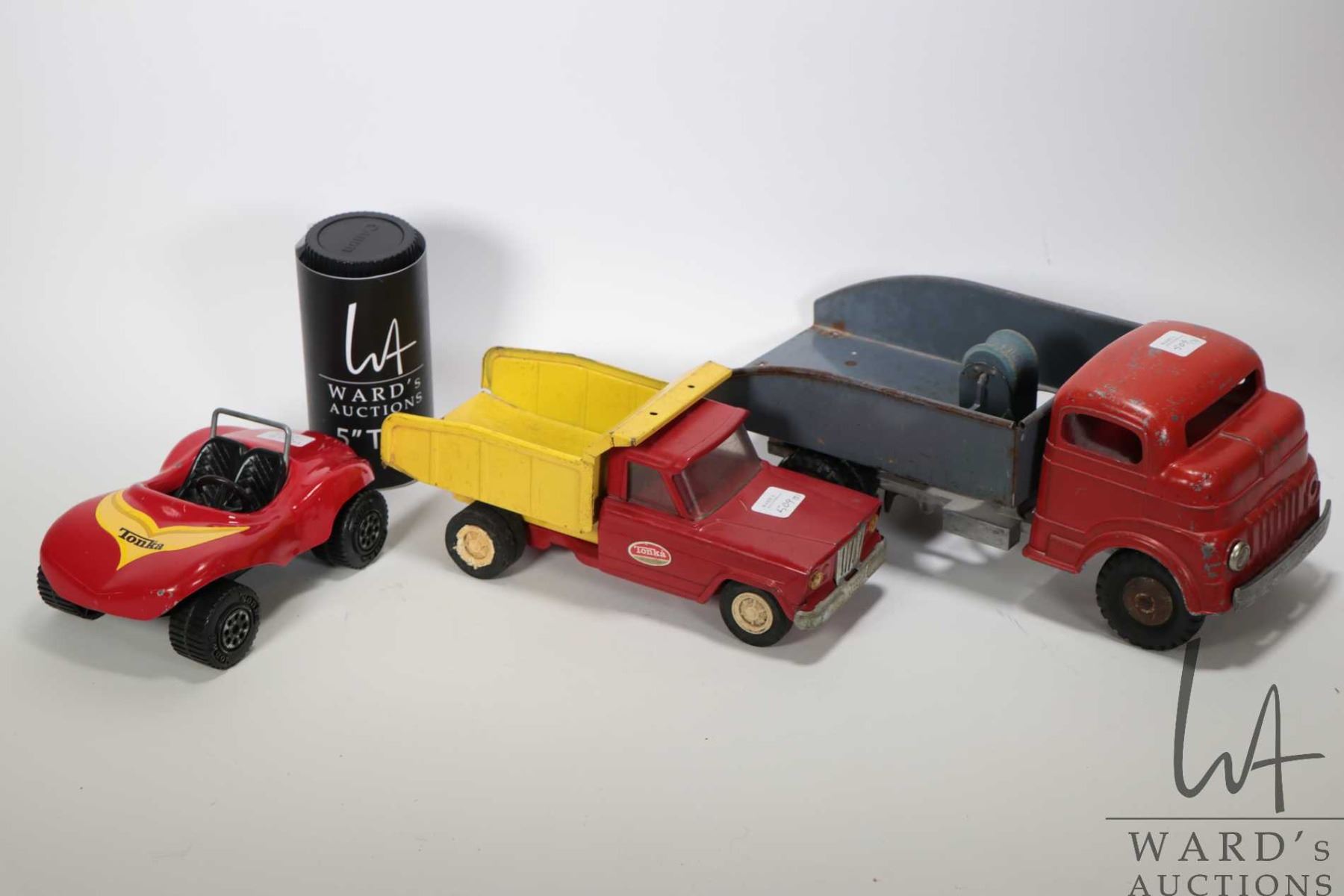 Three vintage pressed steel toys including Tonka dune buggy, Tonka jeep dump truck and a Structo wind up tow truck