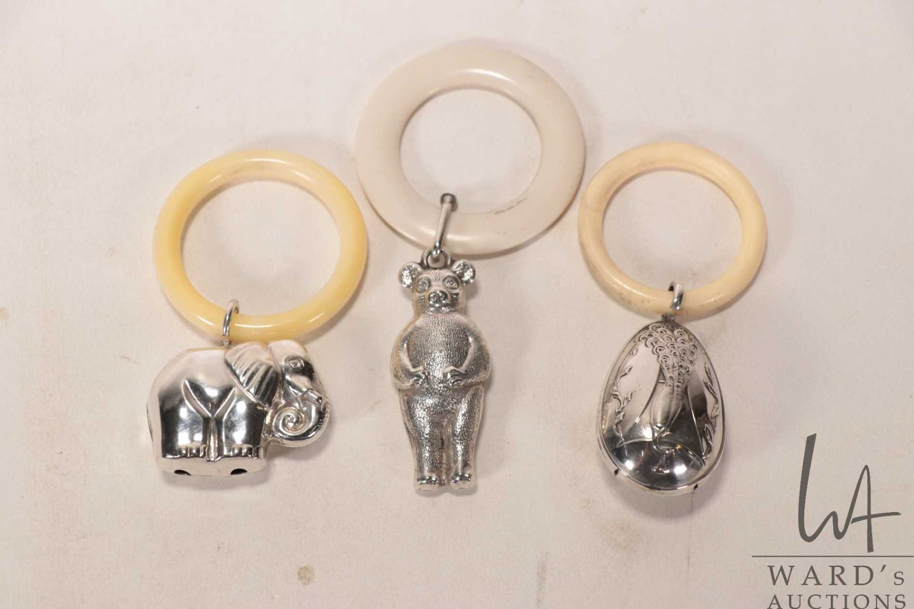 Three vintage silver plate baby rattles including peacock bell, elephant and bear
