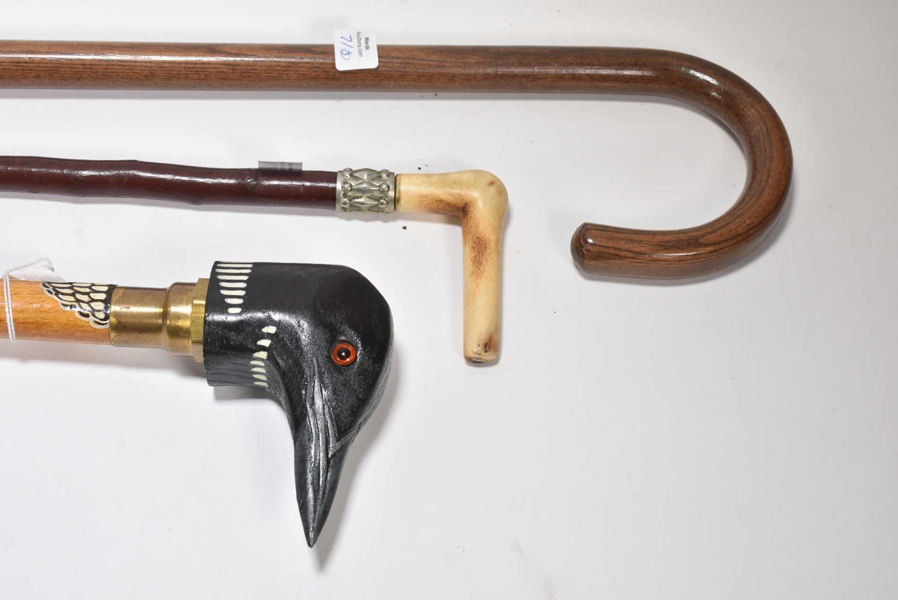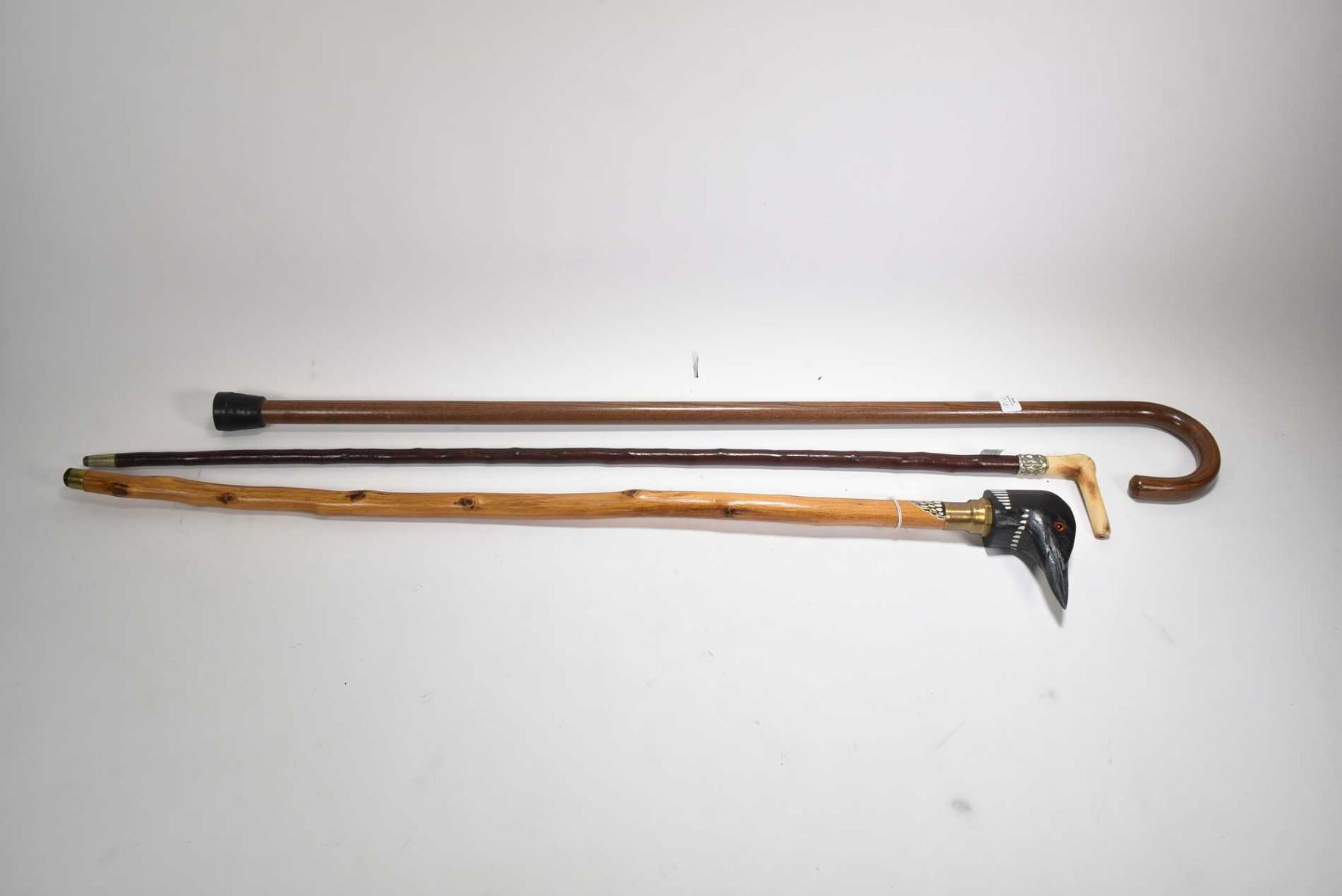 Three walking sticks including a loon, bone handled stick and a curved walking cane