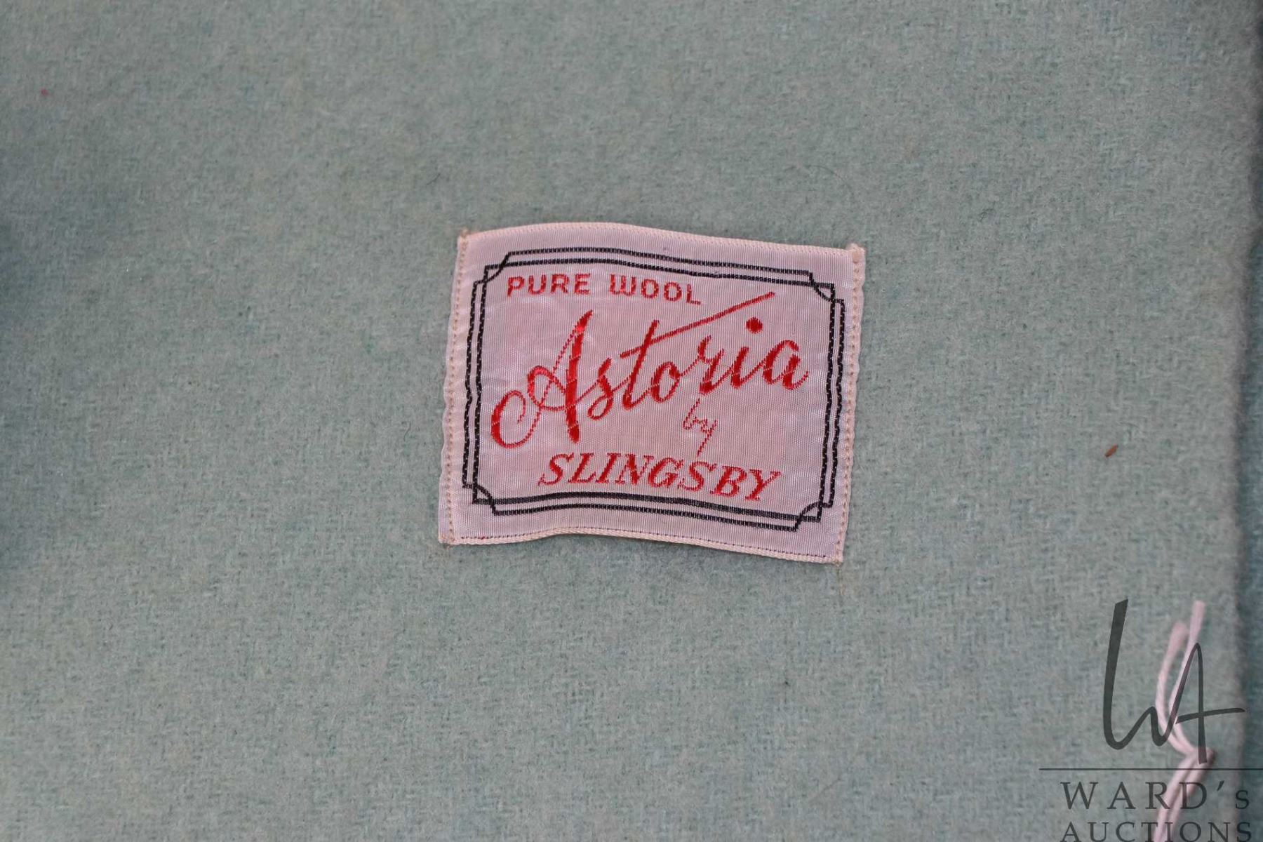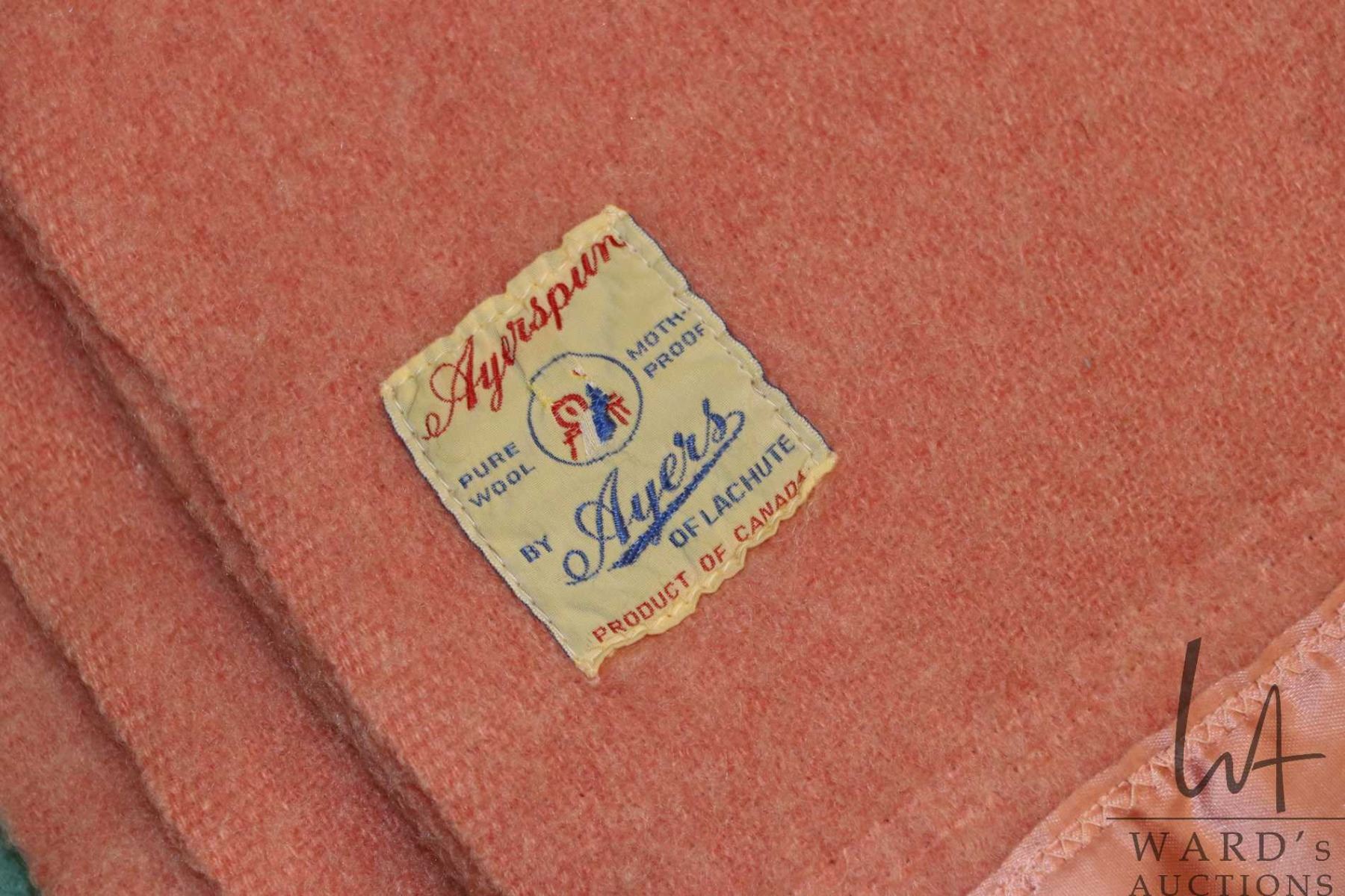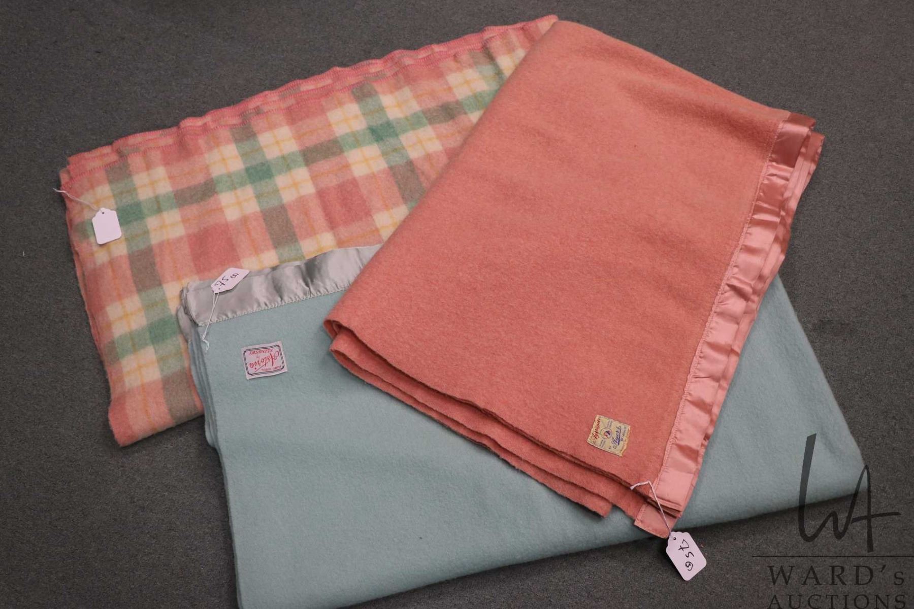 Three wool blankets including pink 83" X 63", green 19" X 71" and plaid 86" x 71"