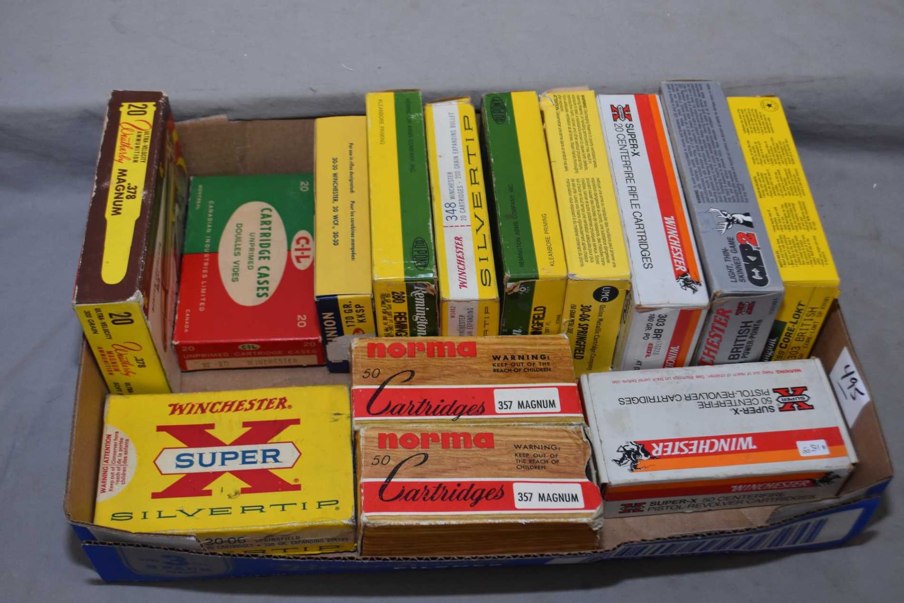 Tray Lot : 60 Rnds .303 Brit Cal Ammo - 37 Rnds .30 - 06 Cal Ammo - 19 Rnds .348 Win Cal Ammo - 1 Box Weatherby .378 Wthby Mag Cal Ammo - 1 Box .280 Rem Cal Ammo - 1 Box ( 50 rnds per ) .9 MM Luger Cal Ammo - One Box Plus Approx. 30 Rnds .357 Mag Cal Ammo - 13 Rnds .30 - 30 Cal Ammo - 10 Rnds .32 - 20 Cal Possible Reloads - plus some .30 - 06 Cal Brass