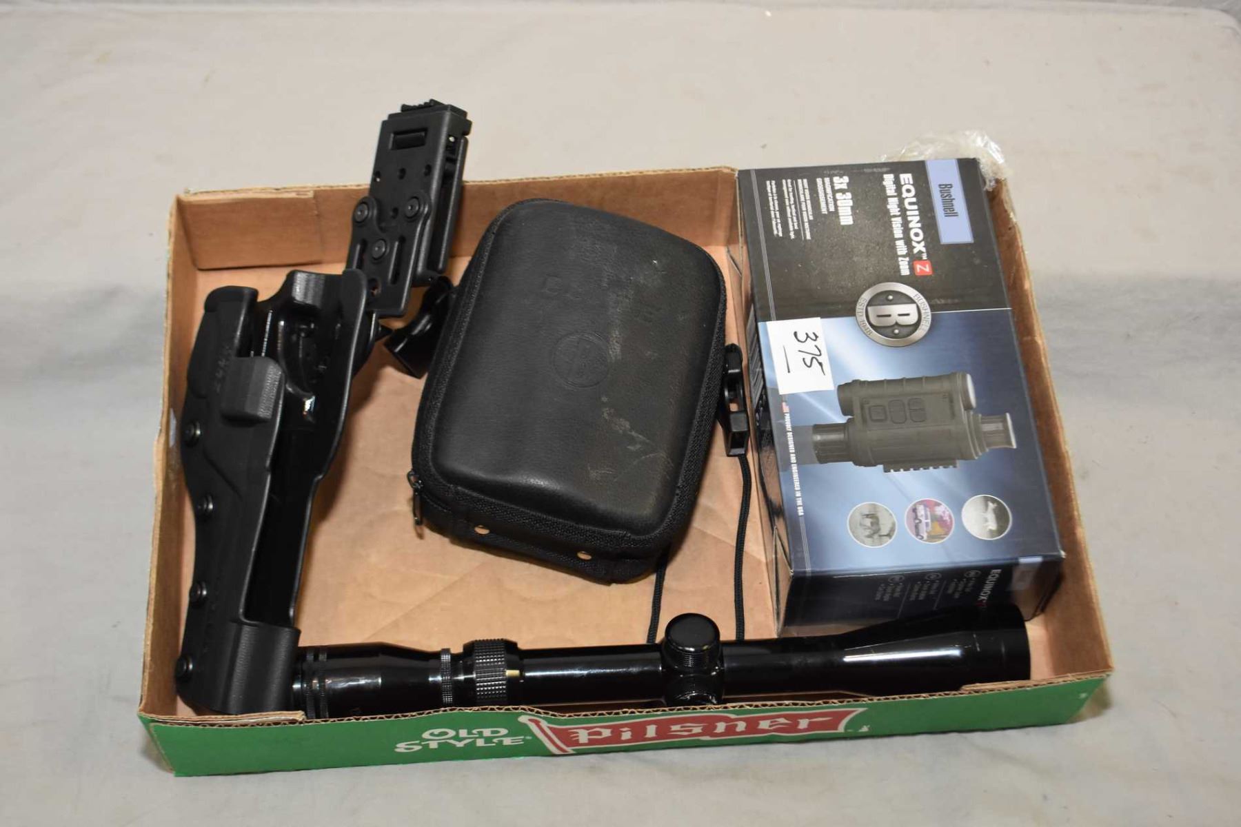 Tray Lot : Bushnell Elite Model 1500 Range Finder ? in case - As New in Box Bushnell Equinox Digital Night Vision Monocular w/ zoom 3 x 30 - Tasco Golden Antler 3 x 9 Variable Scope - Speed Keez Holster fits N Frame 5"