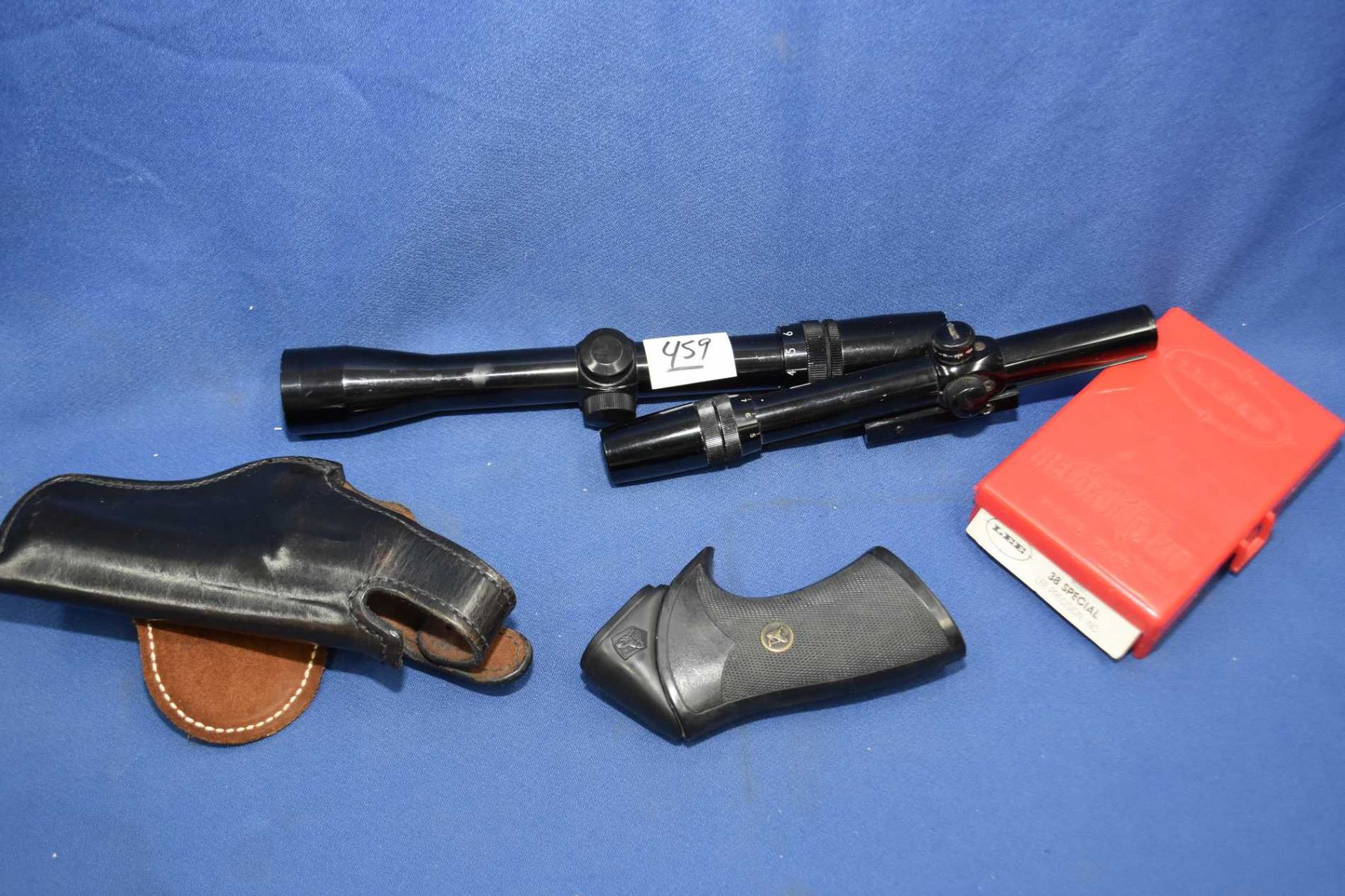 Tray Lot : Bushnell Sportview 3 x 9 x 32 Scope - Bushnell 3 - 7 Custom .22 Scope w/ base - Lee .38 Spec Die Set - Pachmayr Pistol Grip for shotgun ? - Bianchi Leather Holster