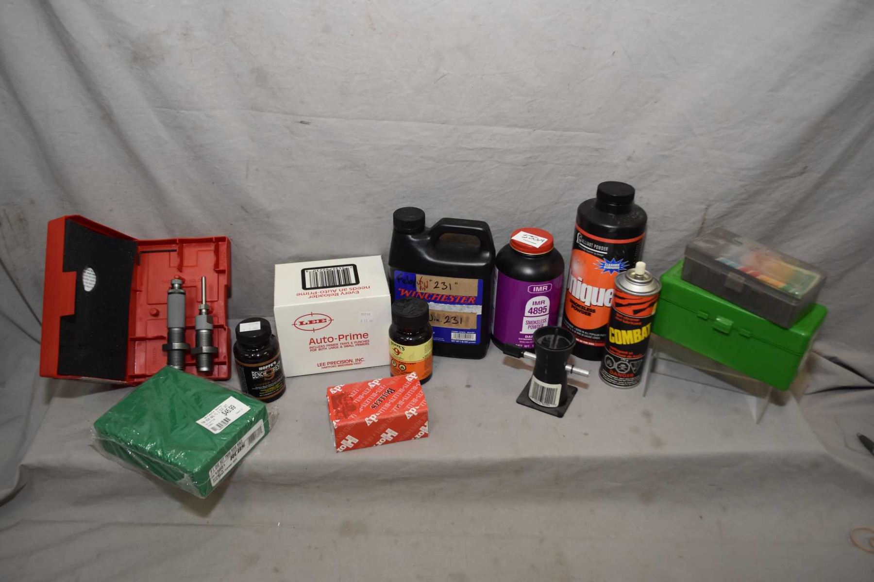 Tray Lot : Lee Auto Primer - .30 Cal Bullets - .7 MM Rem Mag Dies - Hornady .30 - 30 Win Dies - Powder Trickler - Various Bottles of Powder, etc.