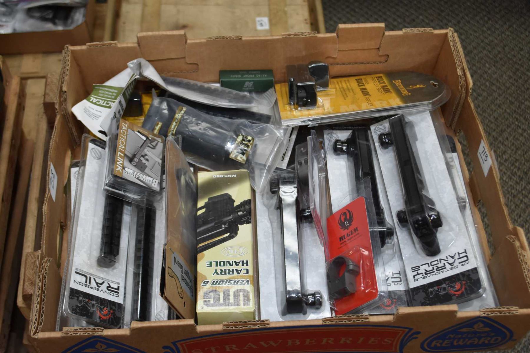 Tray Lot : Misc Tray Lot : Four AR Detachable Carry Handles Sights in orig pkgs - Two Brown Buck Mark Sights New in Pkgs - Two Ruger Rings in pkgs - UTG Carry Handle in box - Four Aimsport Conversion Rails for AR Handle - AR Rizer Mount - Aim Tactical Grip - Mesa Rail Battery Access - Enhanced trigger guard, etc.