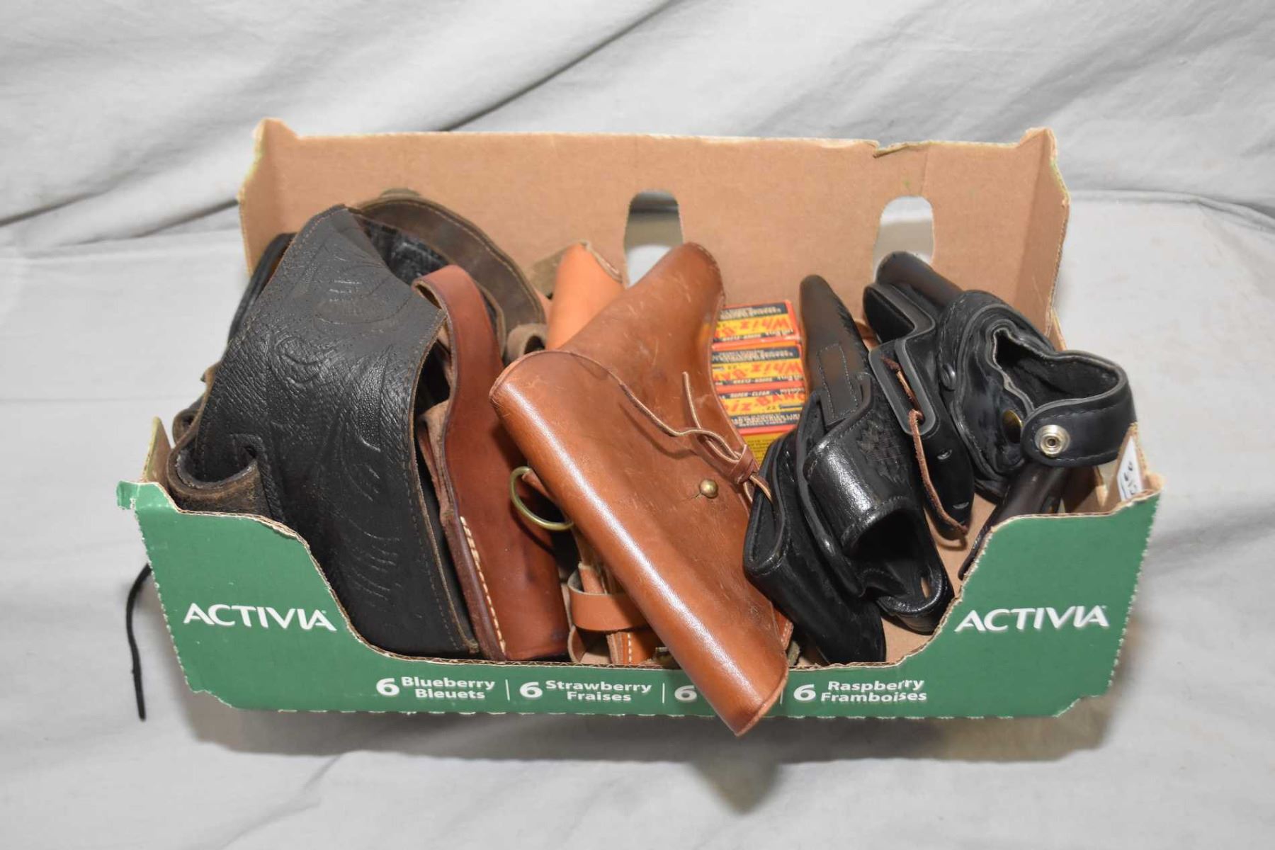 Tray Lot : Vintage Black Leather Belt w/ holster w/ rounds of .45 Colt Ammo - Leather Shoulder Holster - Leather Flap Holster - Northern Plains Black Heavy Leather Holster - Safari Land Heavy Leather Holster - Small Leather Pouch - Three Boxes Whiz Bang .22 LR Mushroom Ammo