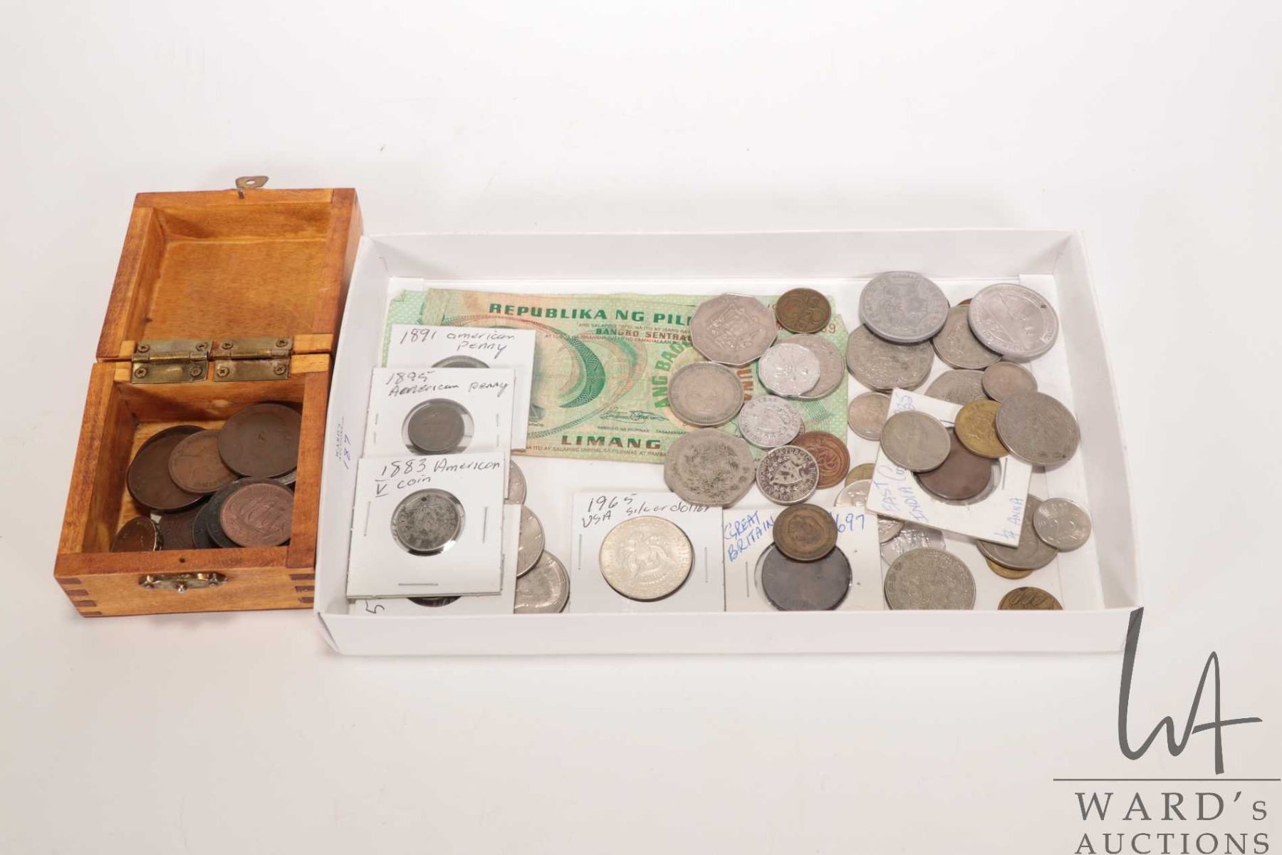 Tray containing a selection of foreign bank notes and coins including Mexico, England and US etc.