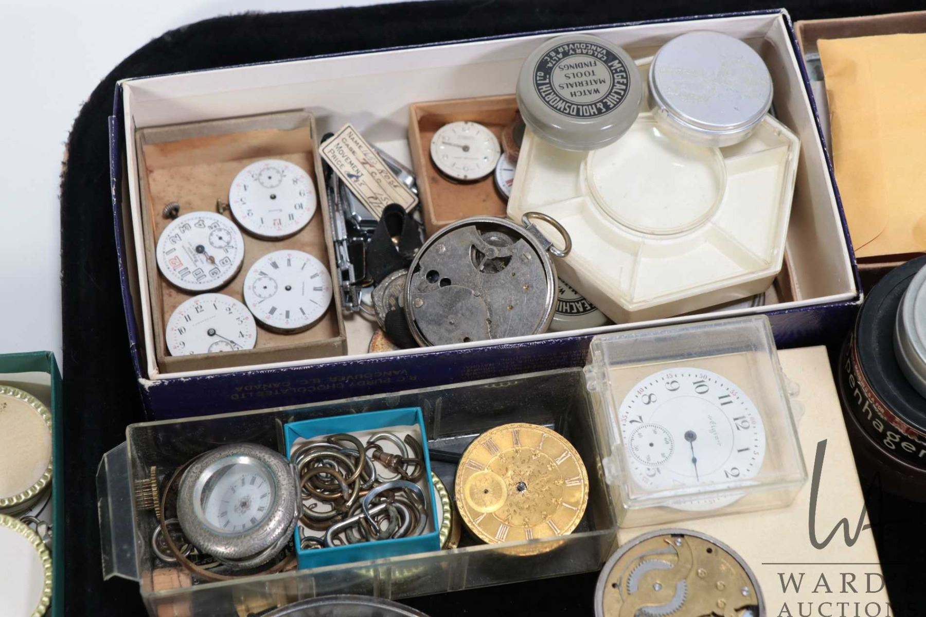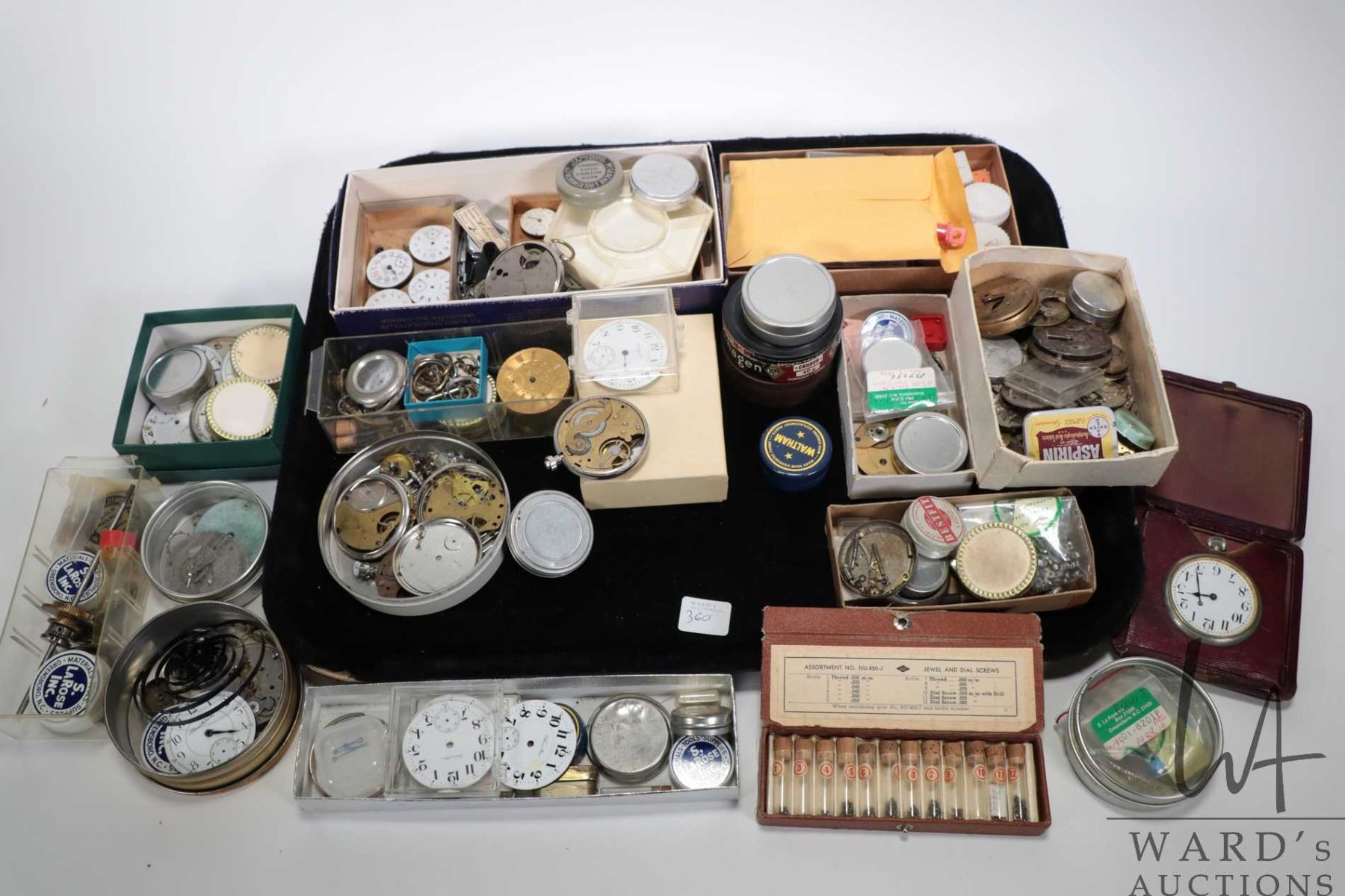 Tray lof watch parts including half completed watches, nonworking watches, watch faces, screws, jewe