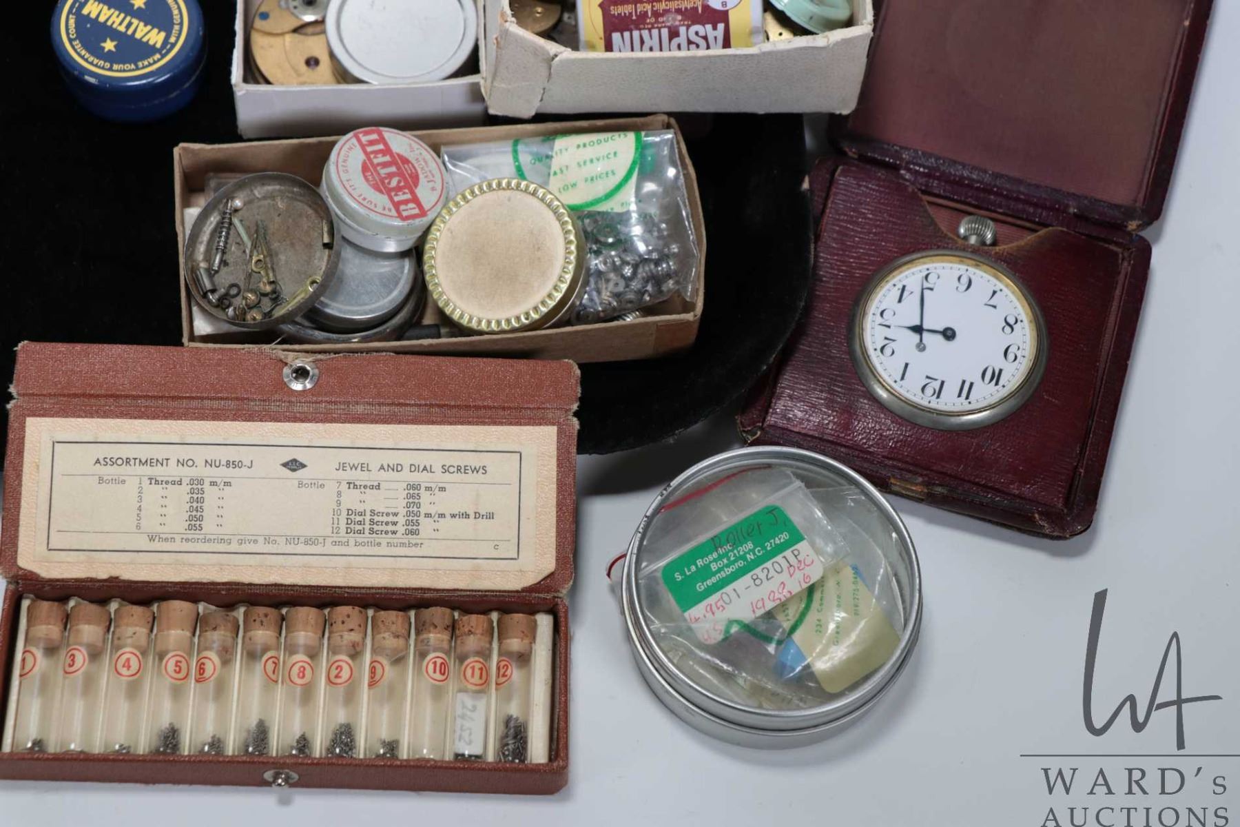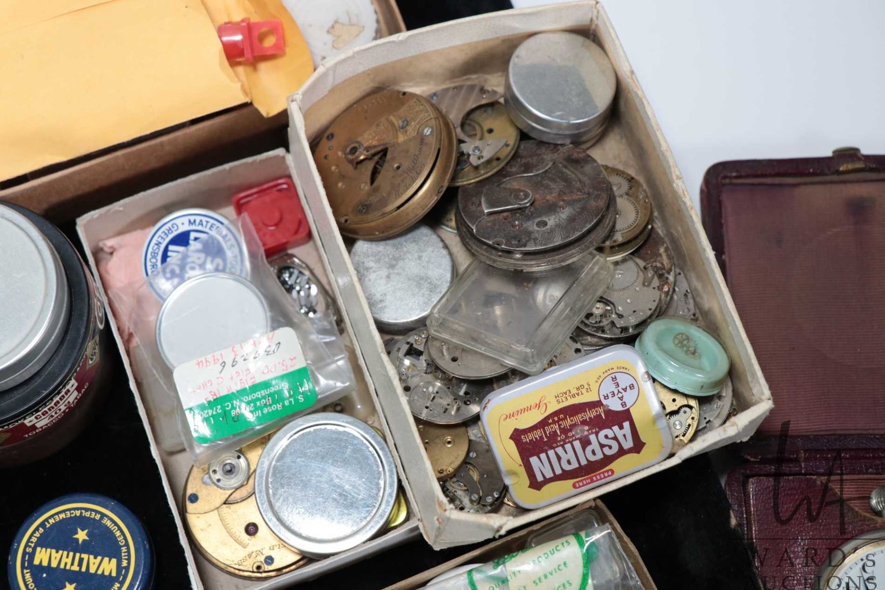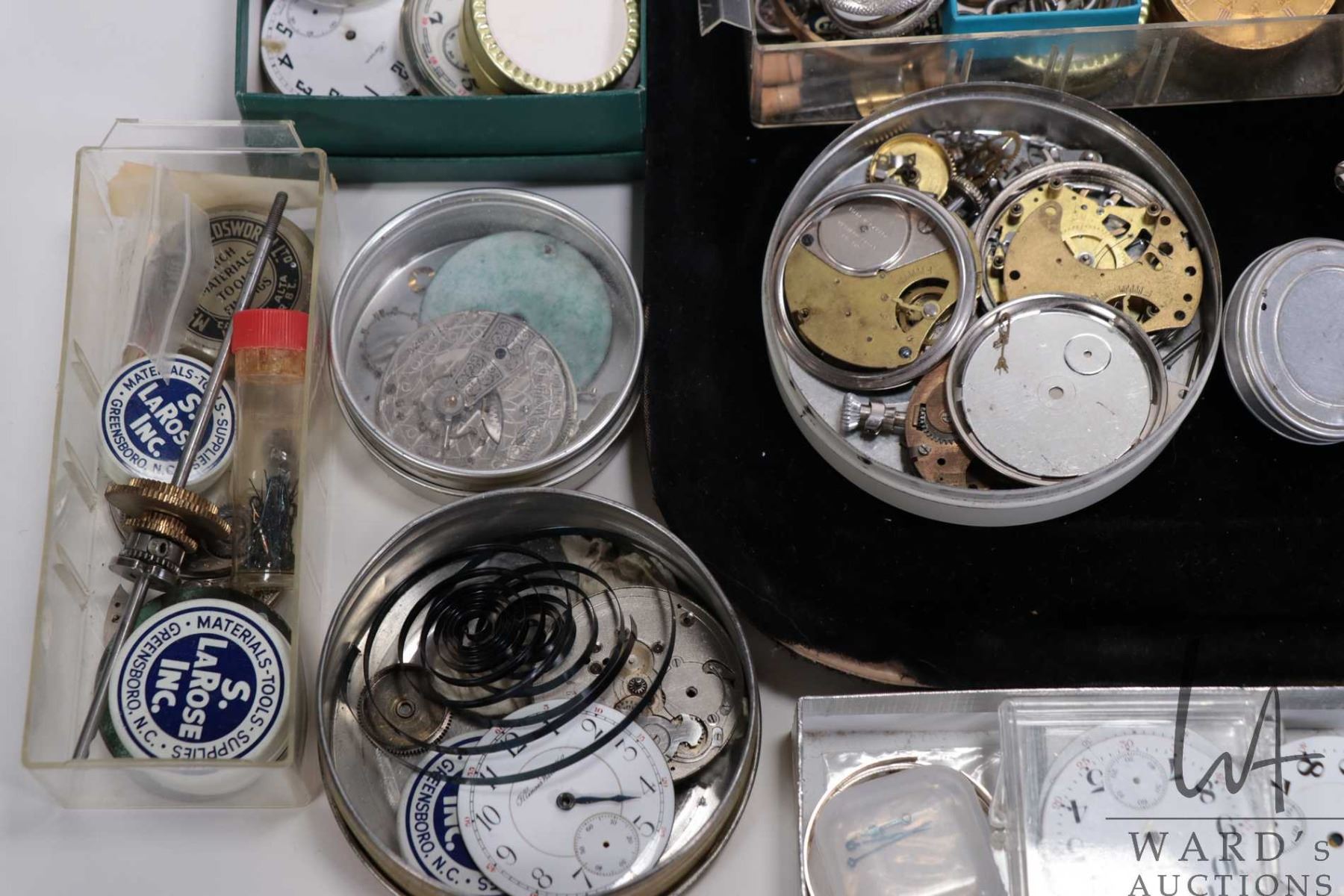 Tray lof watch parts including half completed watches, nonworking watches, watch faces, screws, jewels, gears, winder knobs, etc.