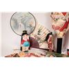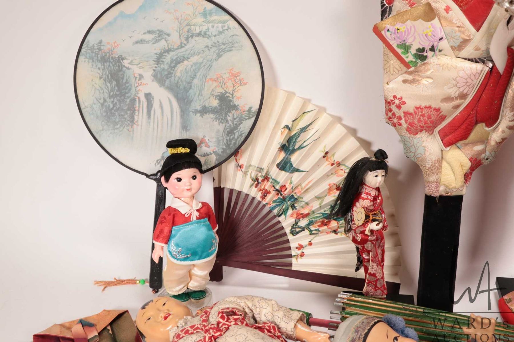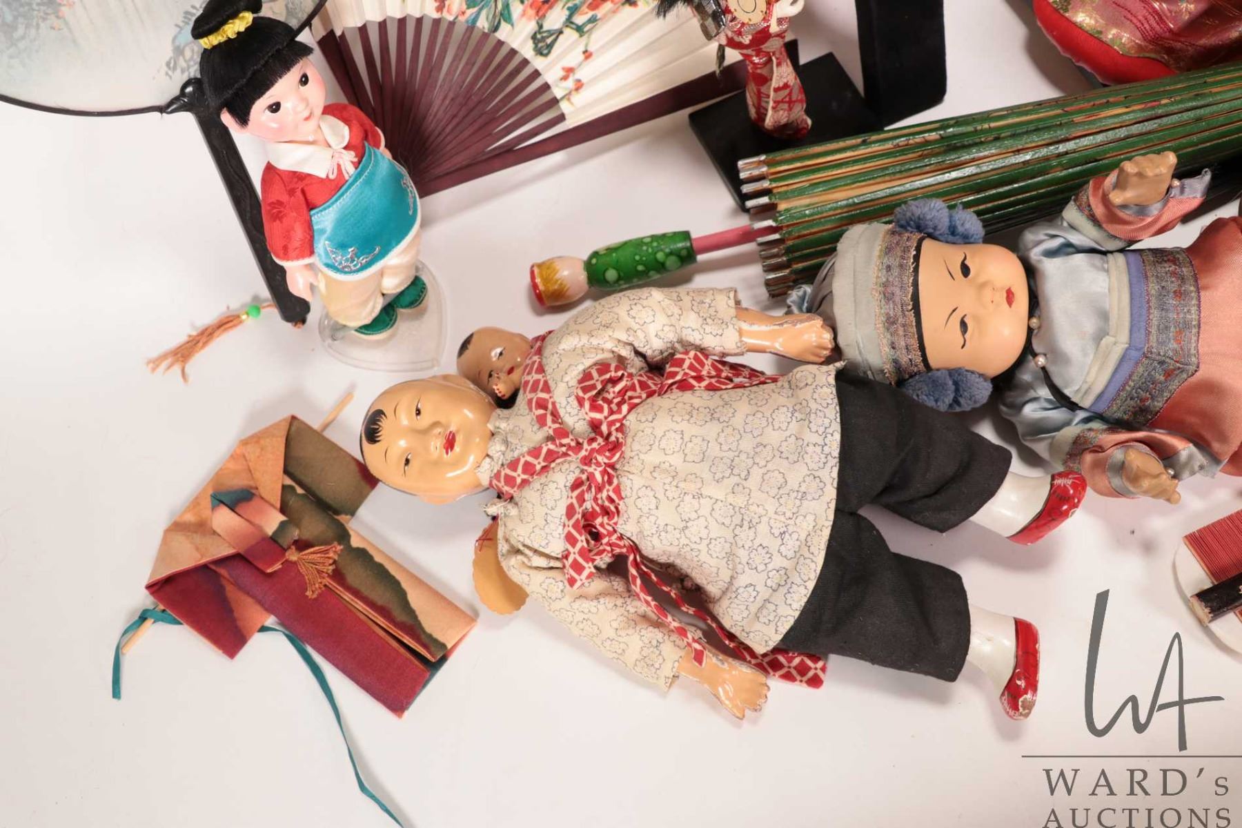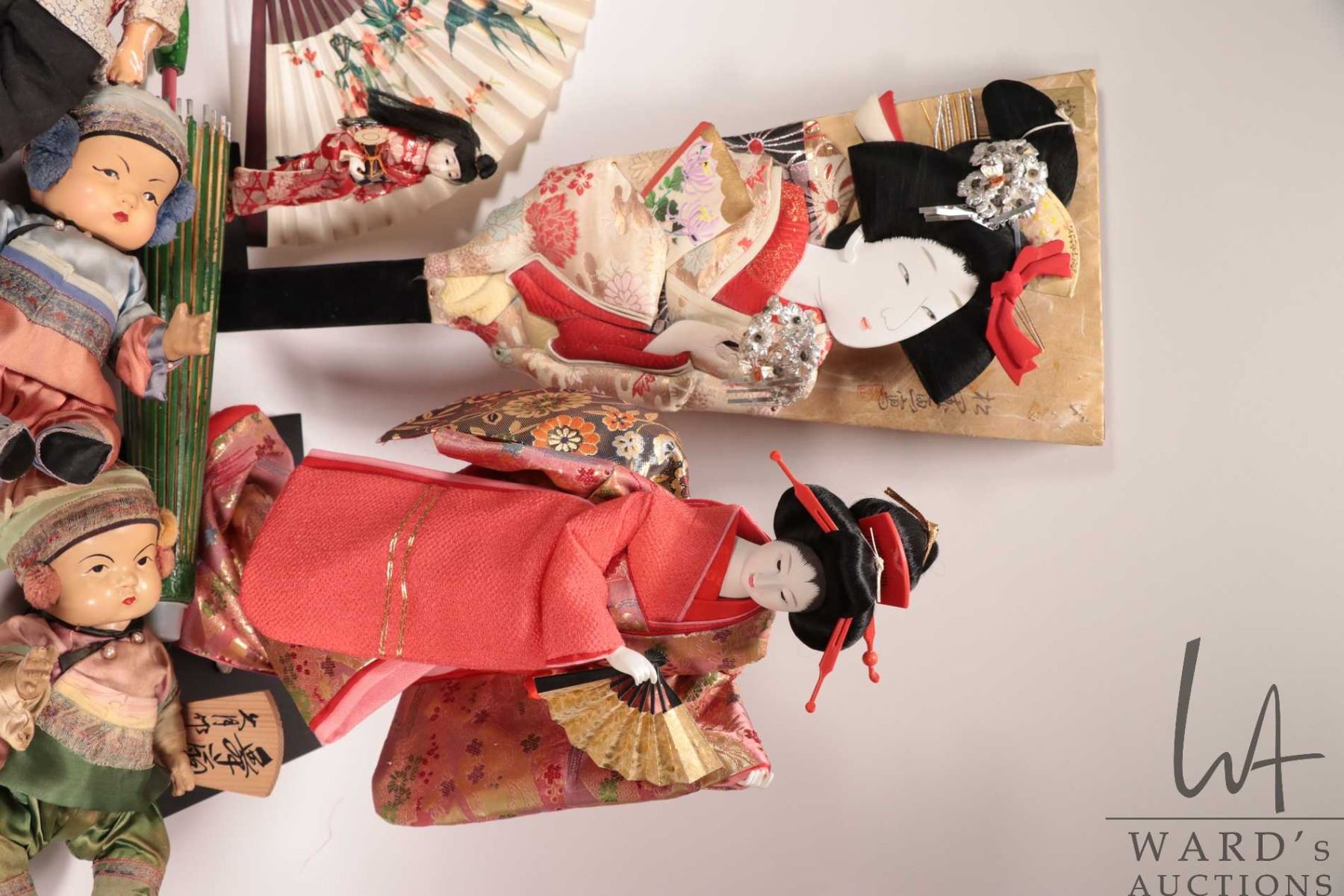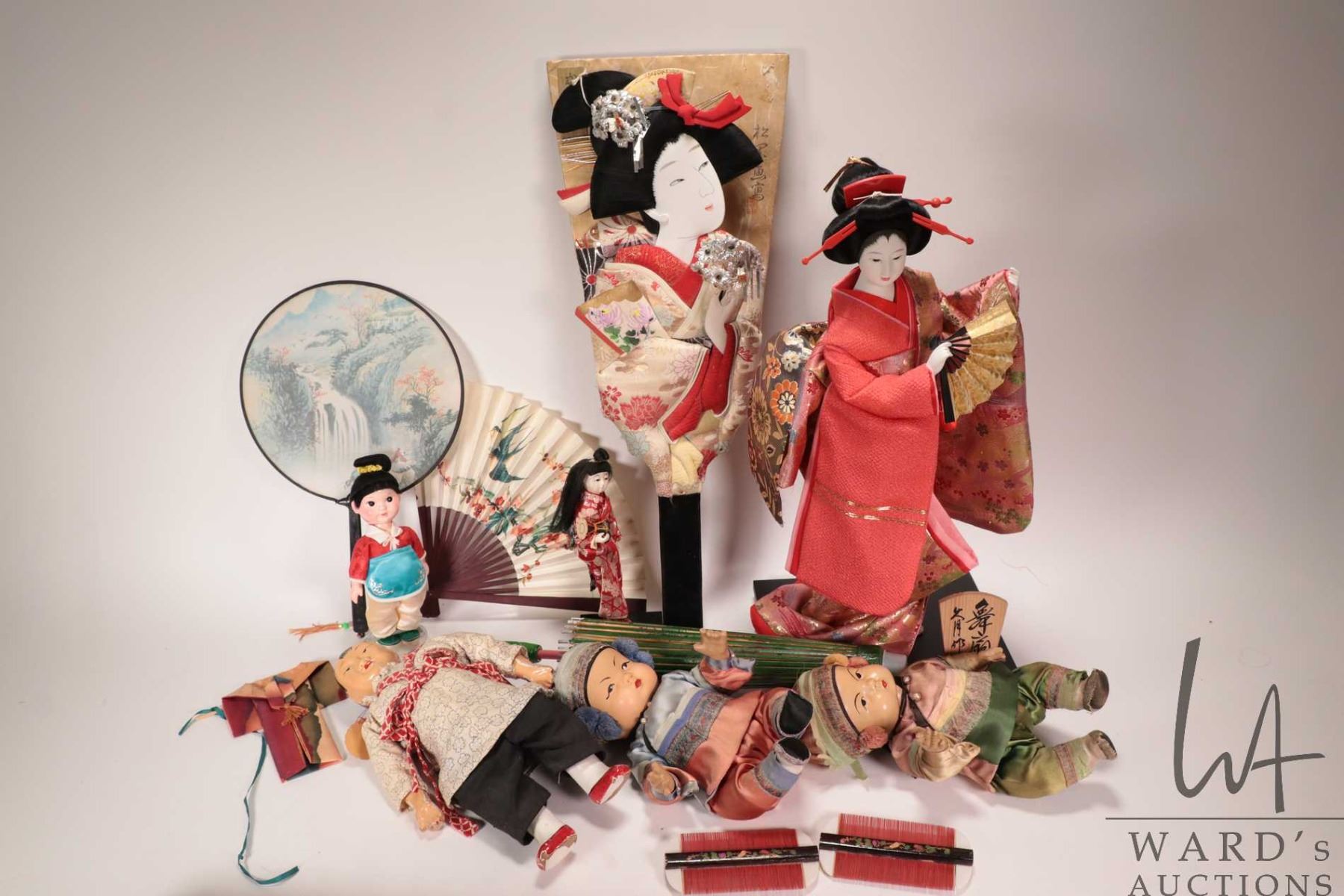 Tray lot of Asian collectible dolls including composition Baby Amah Chinese figure with infant 11", two 9" composition Ming Ming babies, 18" Geisha on wooden plinth plus an Chinese fan, rice paper umbrella etc.