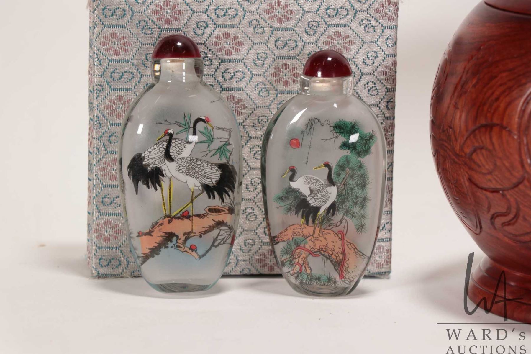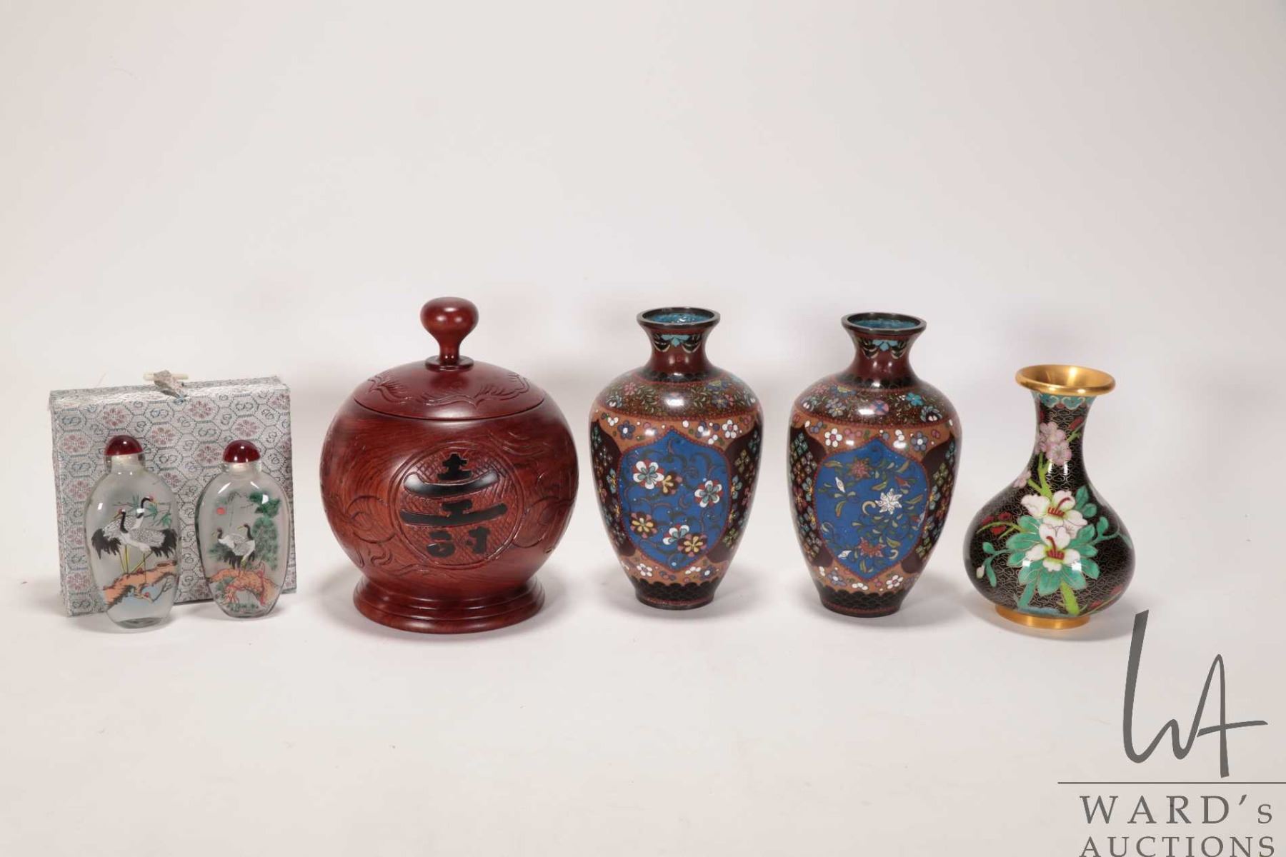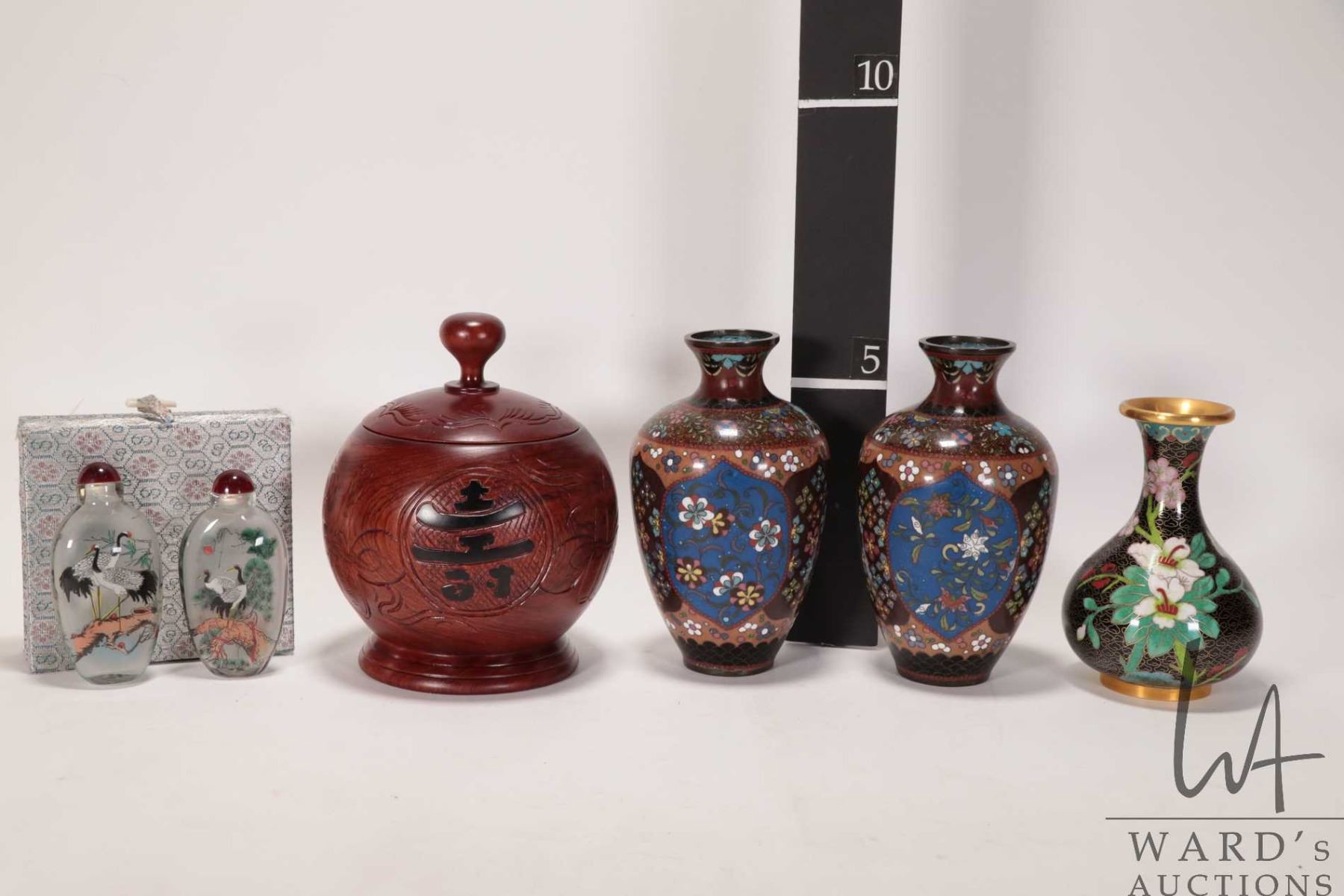 Tray lot of Asian collectibles including wooden lidded bowl, pair of 6" cloisonne vases, a 5" cloissone vase and a boxed set of painted glass snuff bottles