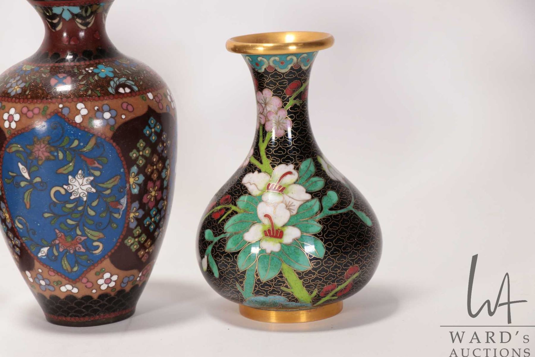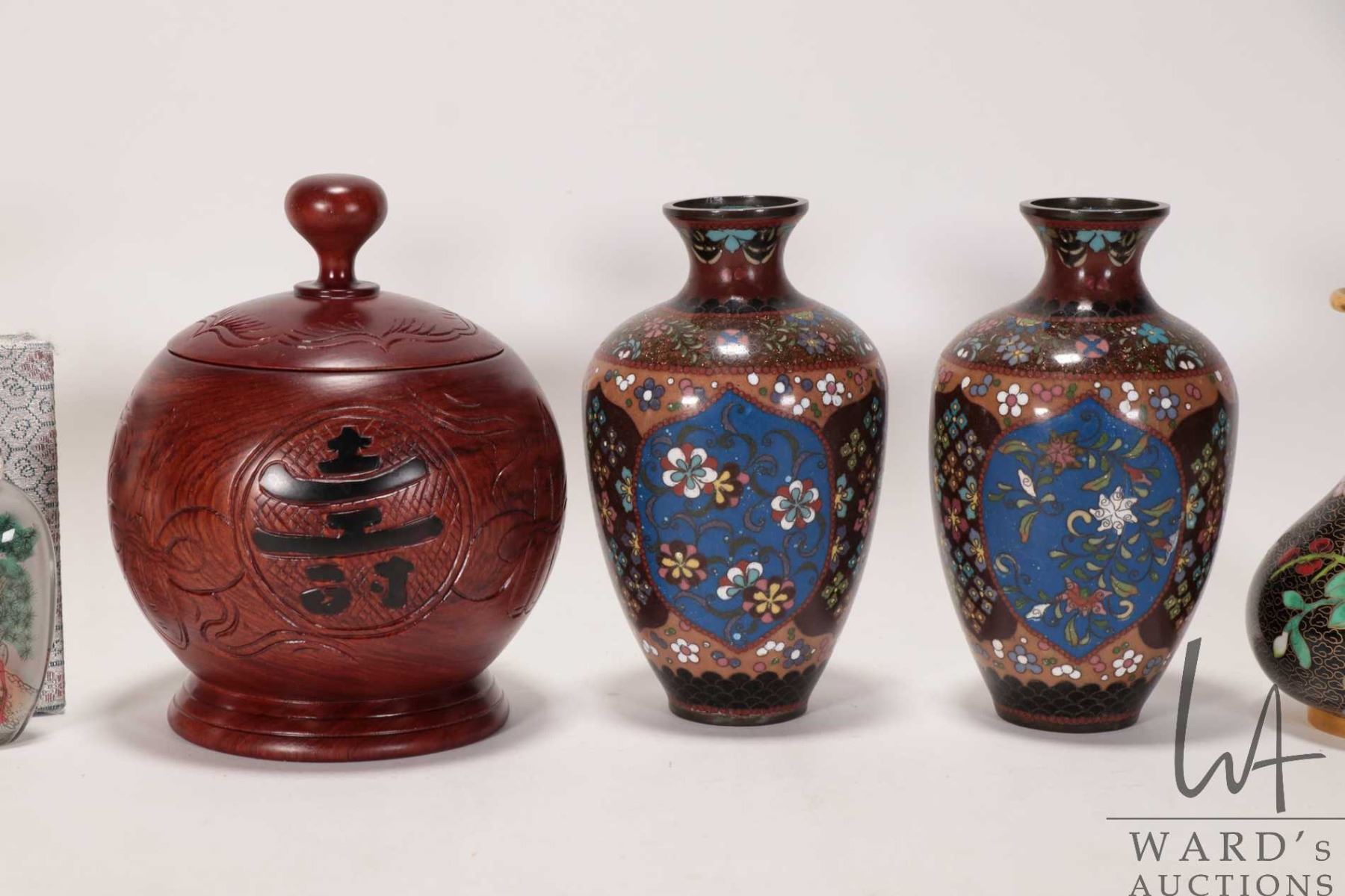 Tray lot of Asian collectibles including wooden lidded bowl, pair of 6" cloisonne vases, a 5" cloiss