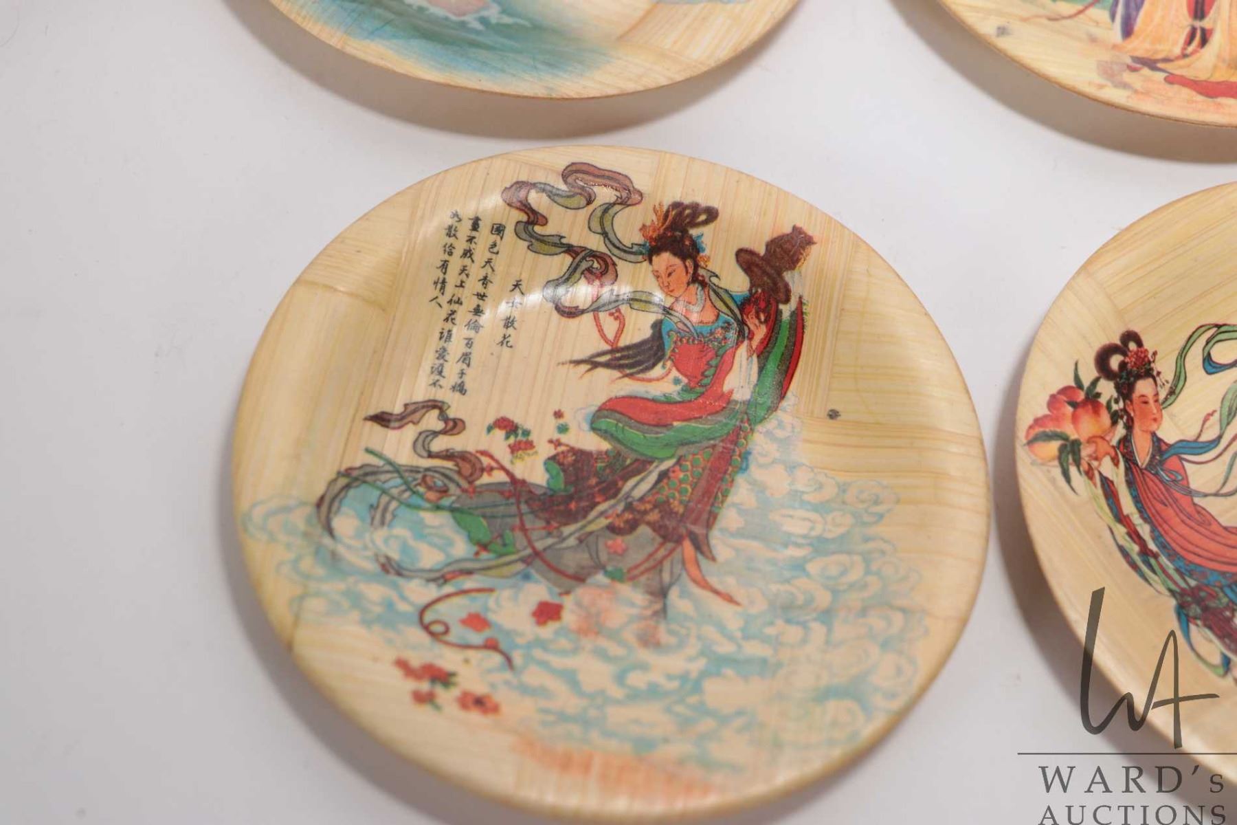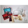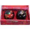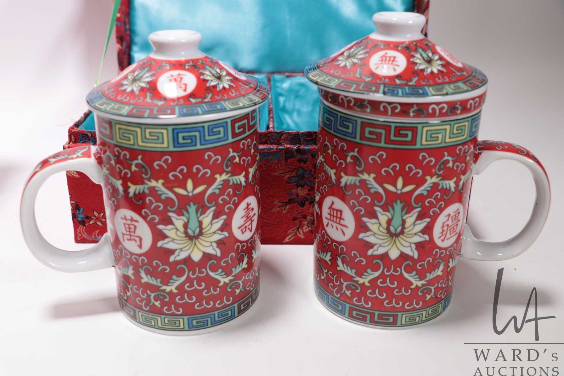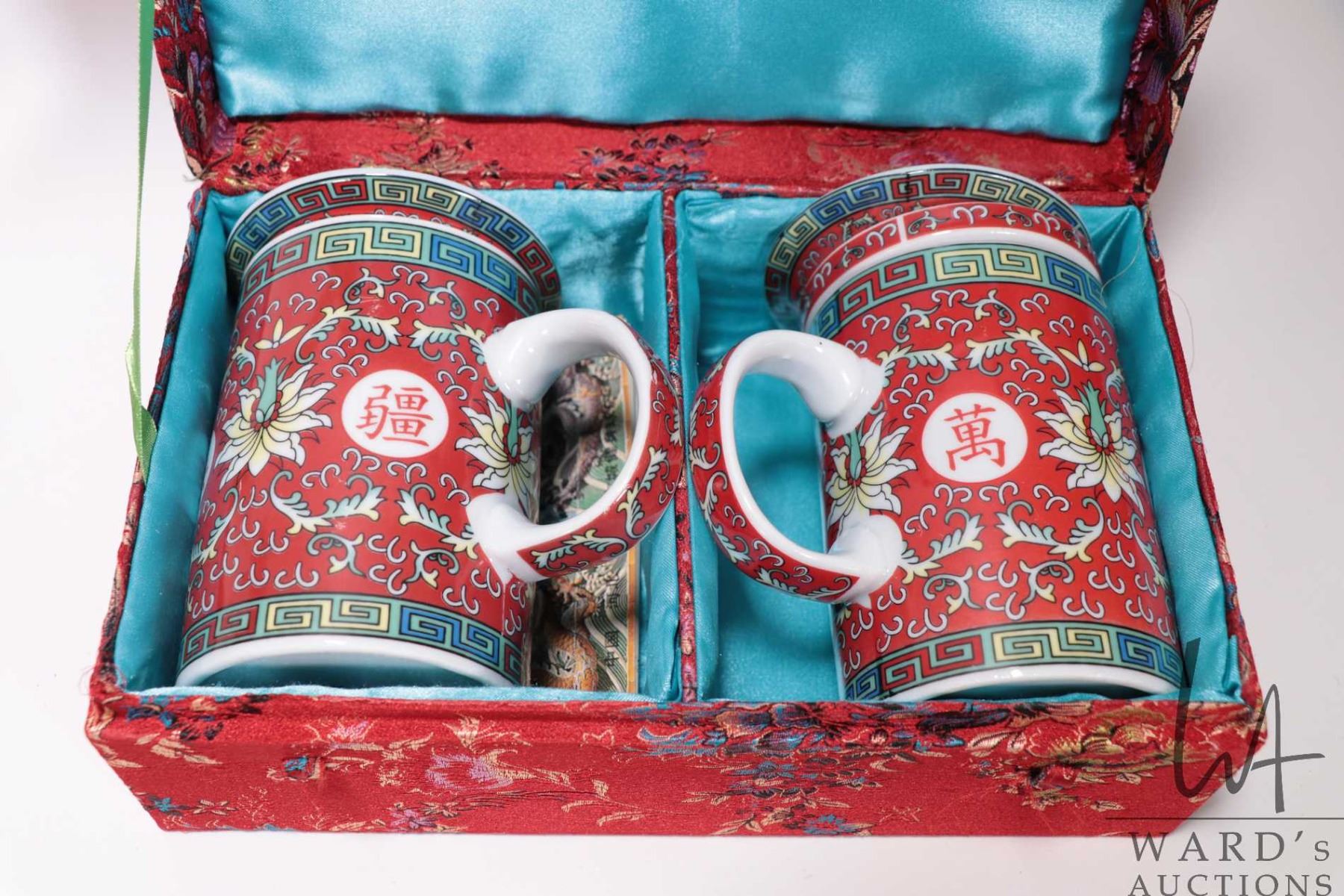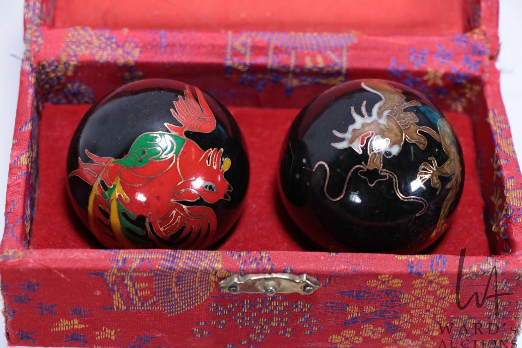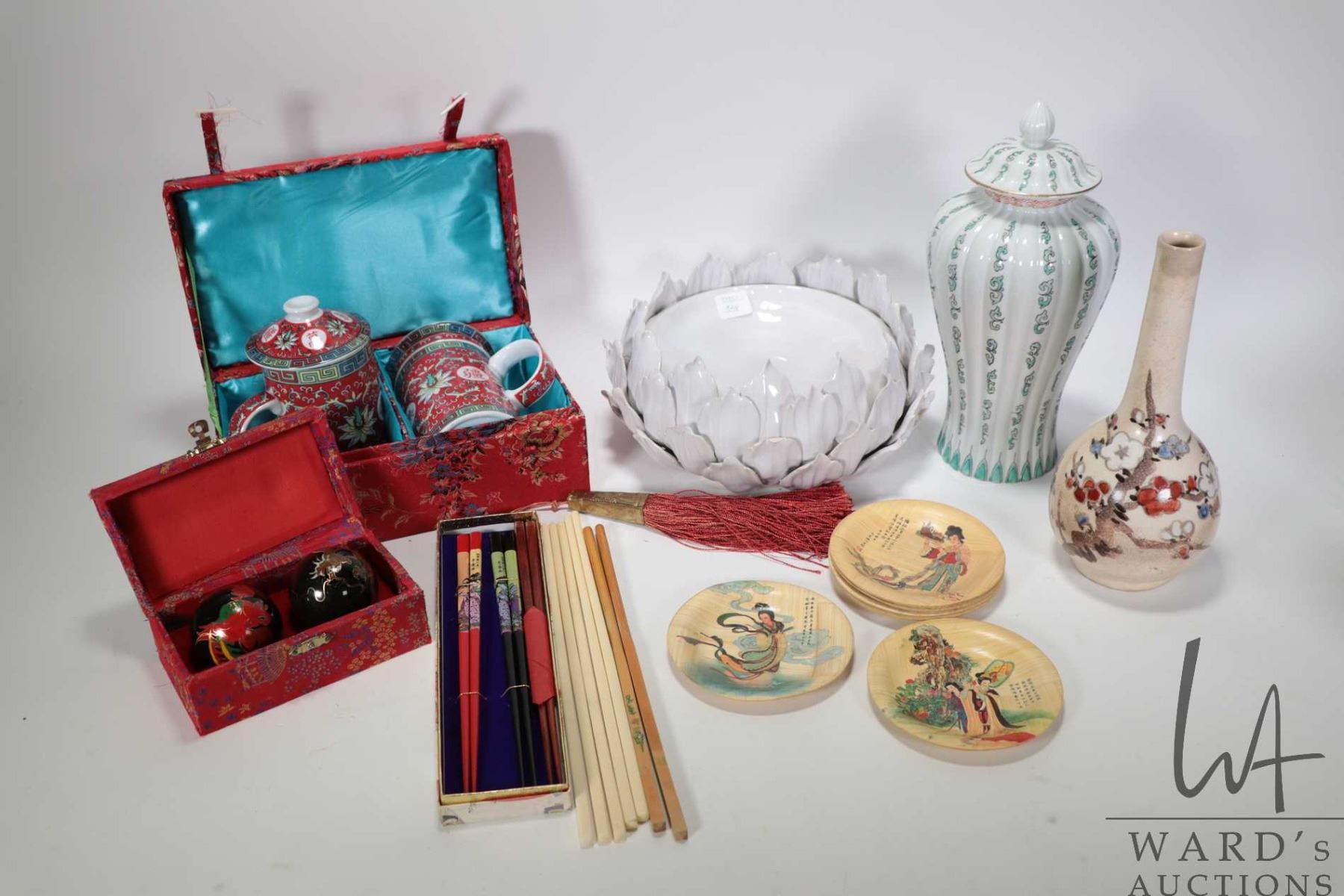 Tray lot of Oriental collectibles including boxed mugs, boxed balls, a selection of lacquered style chop sticks, a chine de blanc petaled dish, hand painted 9" vase, lidded jar etc. Note: Not available for shipping. Local pickup only