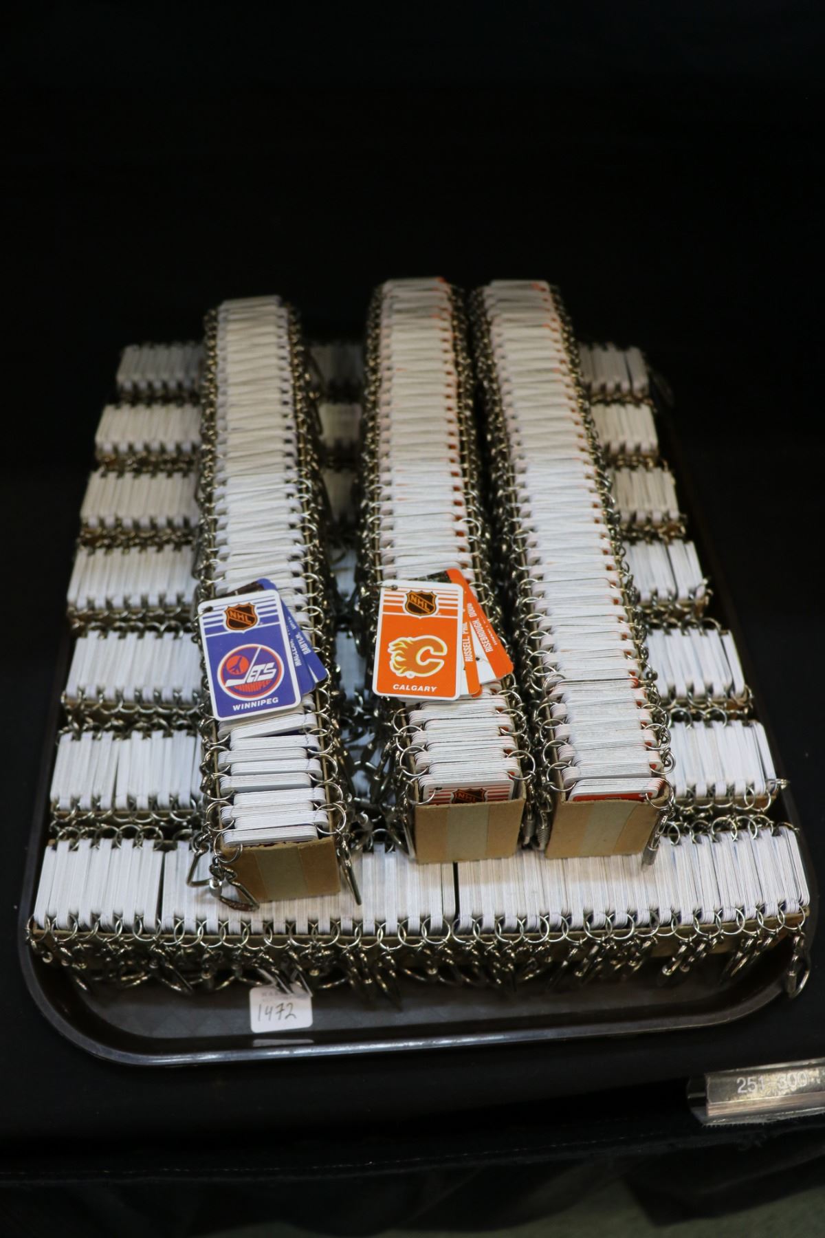 Tray lot of approximatly 750 NHL team key chains. Including primarily Winnipeg jets, Calgary Flames.