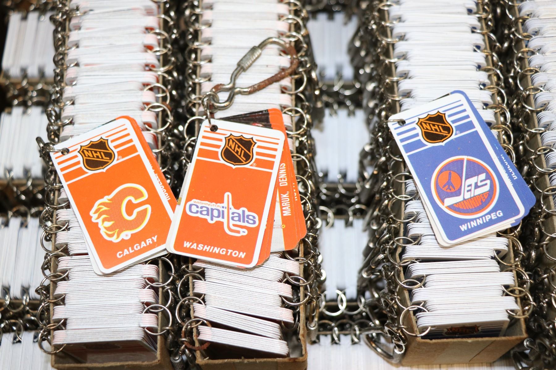 Tray lot of approximatly 800 NHL team key chains. Including primarily Winnipeg jets, Calgary Flames.