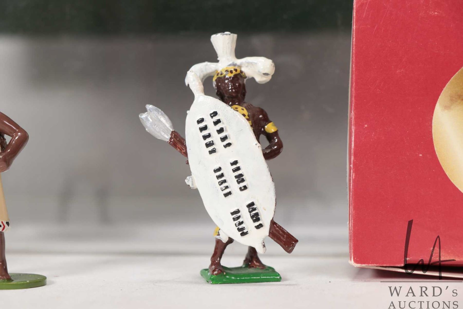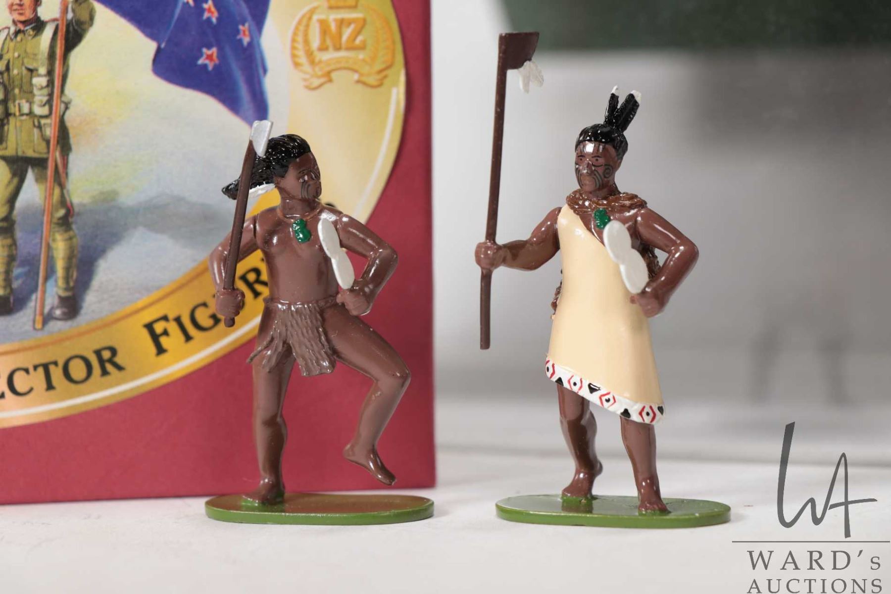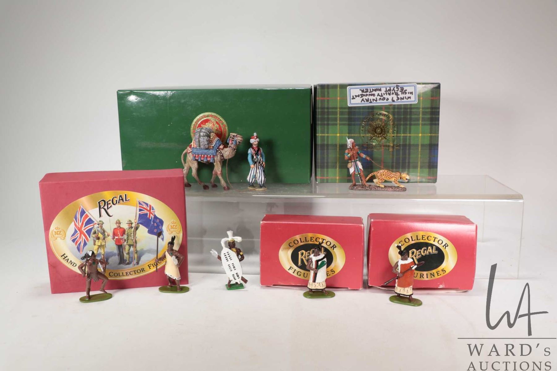 Tray lot of cast metal, hand painted figures including boxed King & Country camel and figure marked "Silk Rd.", ancient Egyptian hunter and leopard, Regal "Set No. NZA: Maori Warriors, 1845-1847" two "NZ 15: Rangatira hei Taiaha and unboxed warrior with shield