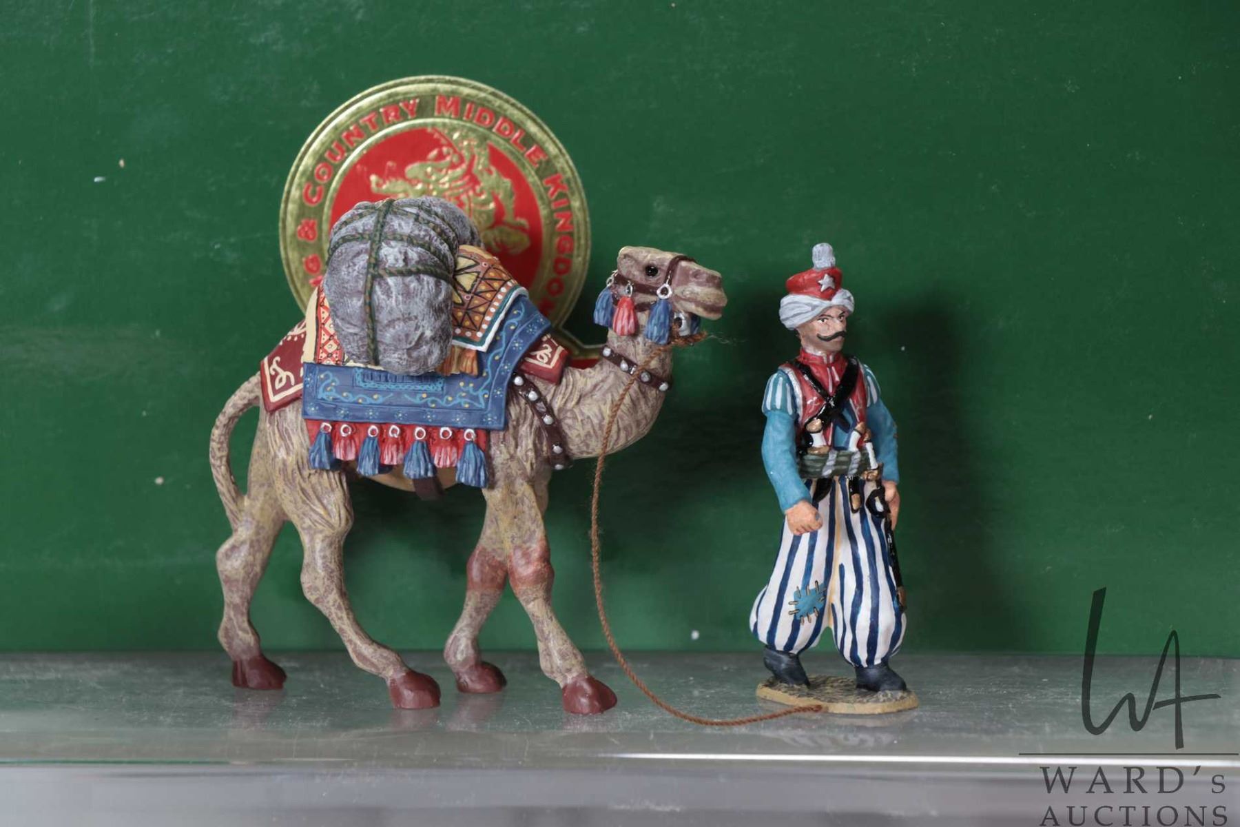 Tray lot of cast metal, hand painted figures including boxed King & Country camel and figure marked