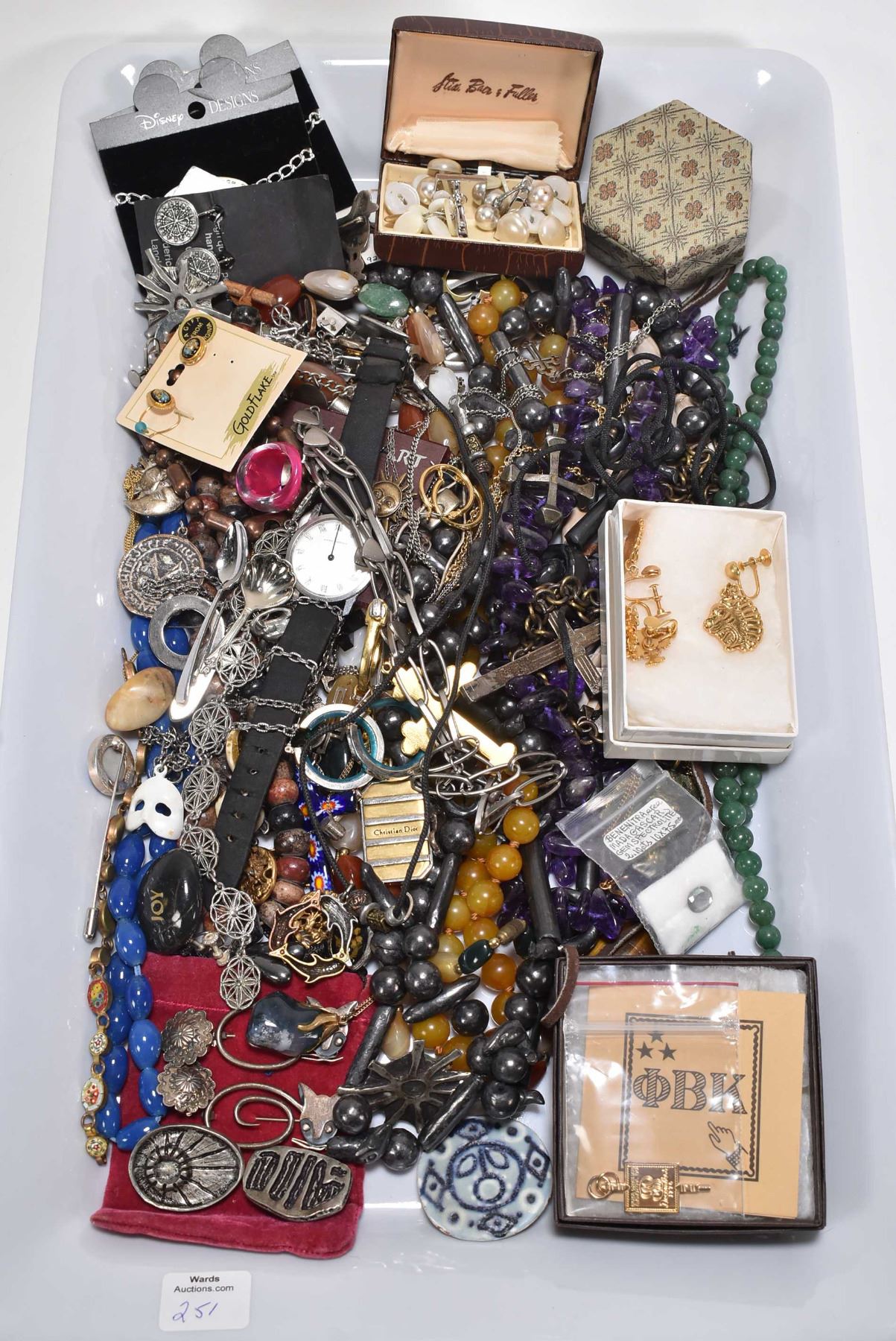 Tray lot of collectible costume jewellery including semi precious and gemstone beaded necklaces, sterling silver, wrist watch, Greek Phi Beta Kappa key pendant and two pairs of earrings from The Metropolitan Museum of Art New York etc.
