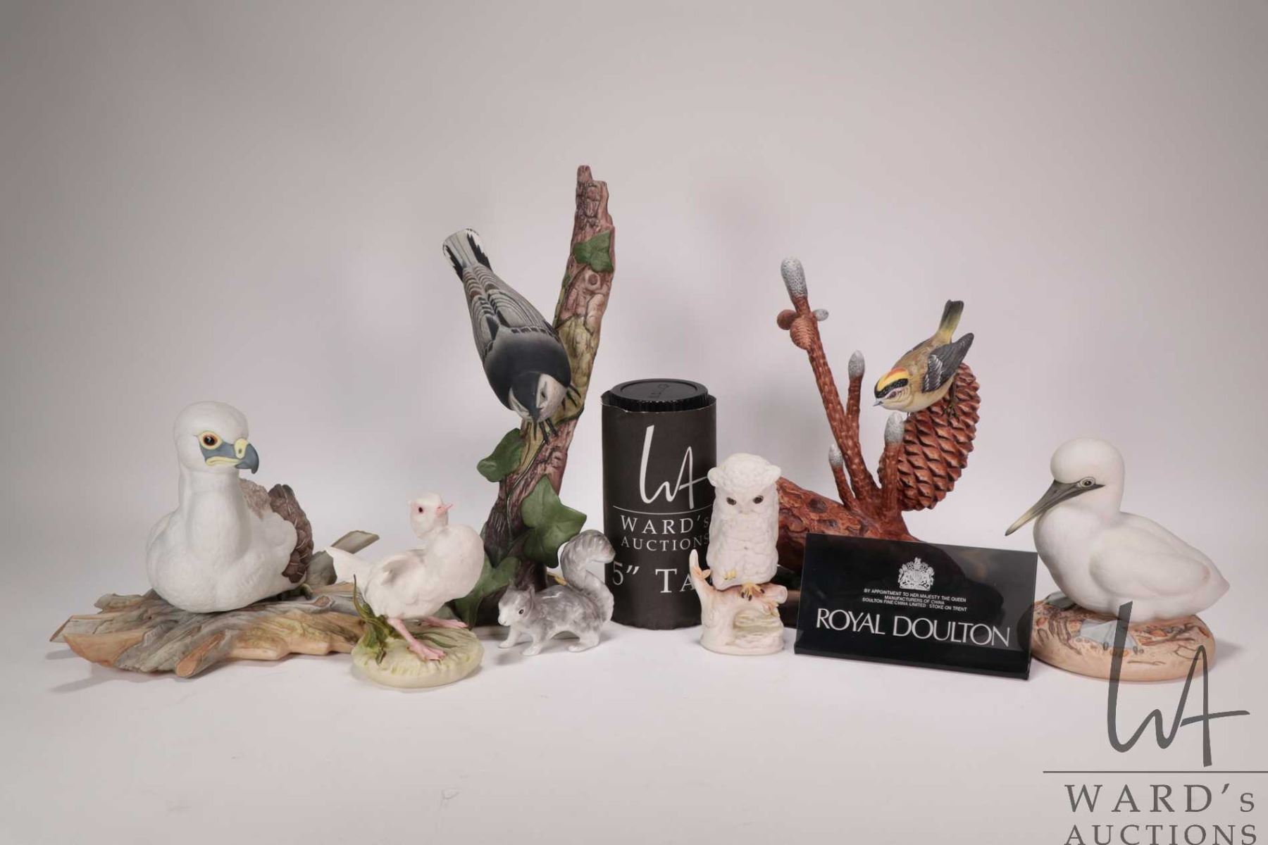 Tray lot of collectible porcelain birds including Royal Doulton "Golden-Crowned Kinglet", Boehm "Nuthatch", Kazman "Blue Footed Booby", #359"Kazman "Baby Golden Eagle #36" plus Cybis porcelain owl and small bird and a Boehm gray squirrel NOTE: SHIPPING IS NOT AVAILABLE, LOCAL PICK UP ONLY